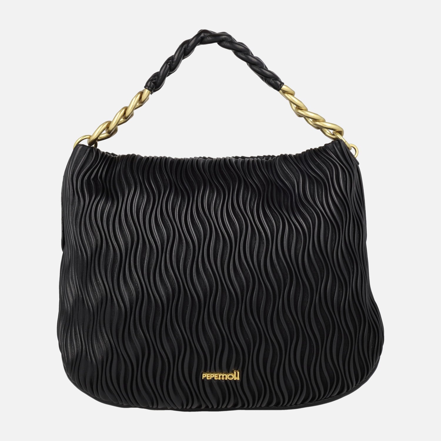 Bolsos estilo hobo marca Pepe moll, modelo 252260, disponibles en negro y en marrón. Bolsos elaborados en materiales sintéticos veganos, con textura ondulada. Asa de cadena con parte central trenzada. Además incluye un asa para llevar de bandolera. Cierre principal de cremallera. Bolsillo trasero también con cremallera. Interior textil con bolsillos. Medidas: 28 cm de alto x 34 cm de ancho inferior x 28 cm de ancho superior x 11 cm de fondo.