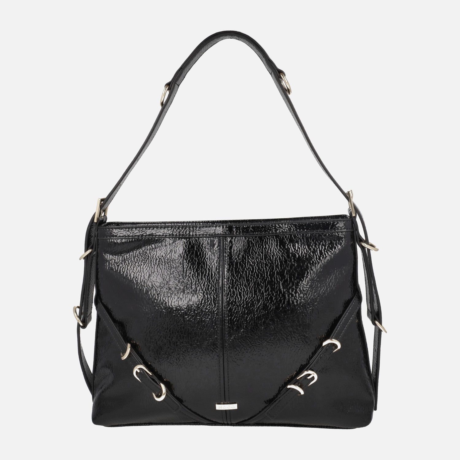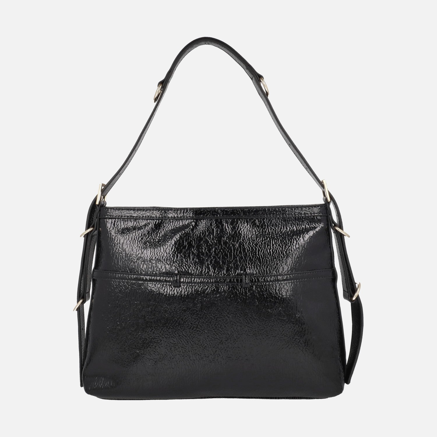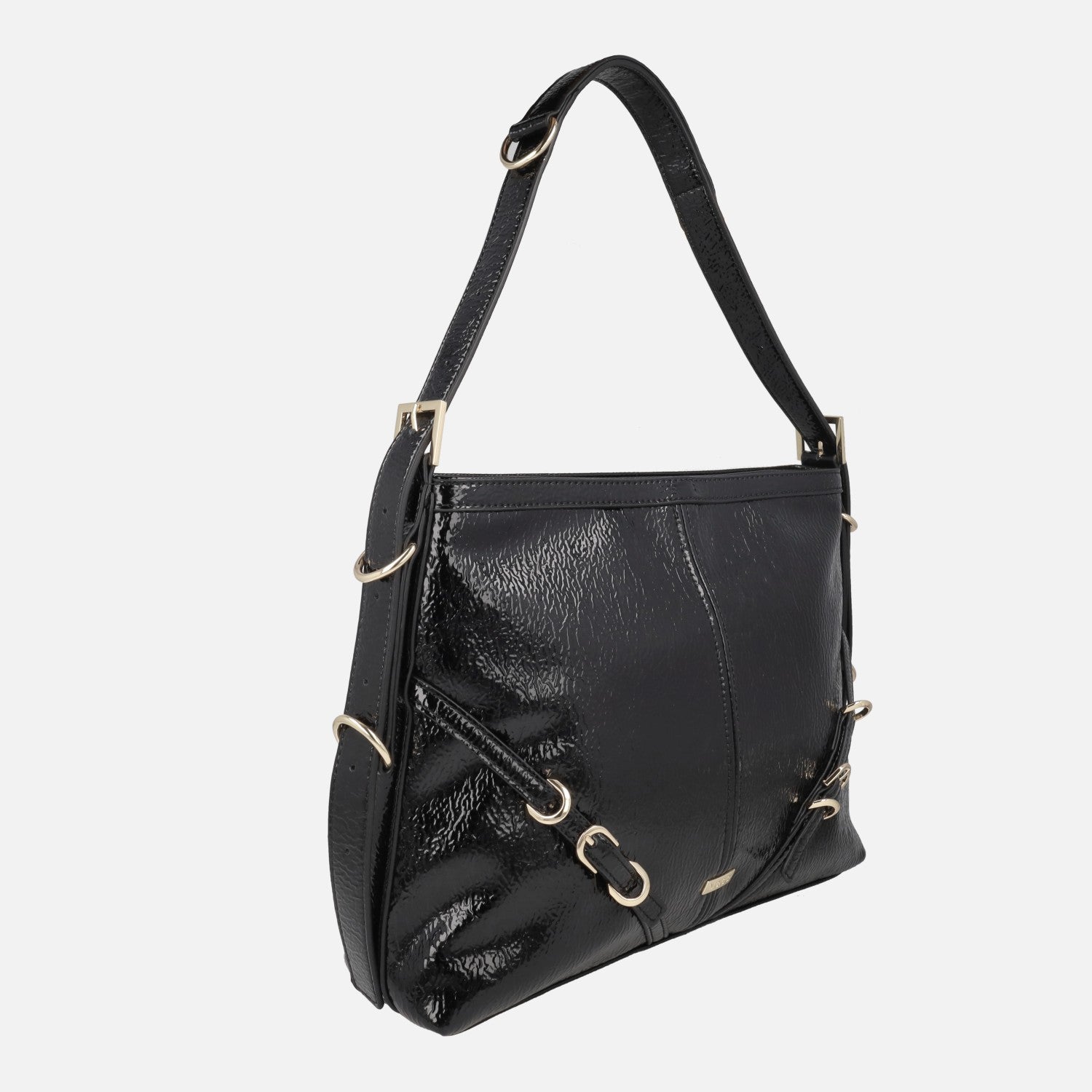 Bolsos Hobo de la marca Noco modelo 2525611 Negro. Bolsos elaborados en materiales sintéticos efecto charol, en color negro. Detalles metálicos dorados. Cierre central con cremallera. Interior textil con dos bolsillos, uno de ellos con cremallera. Asa ajustable con hebilla, para llevar al hombro. Medidas: 26 cm de alto x 30 cm de ancho superior x 34 cm de ancho inferior x 7 cm de fondo.
