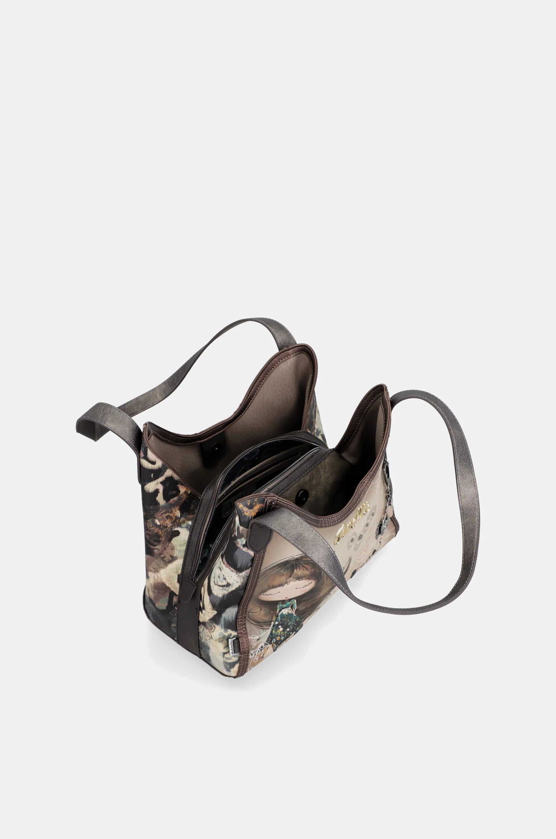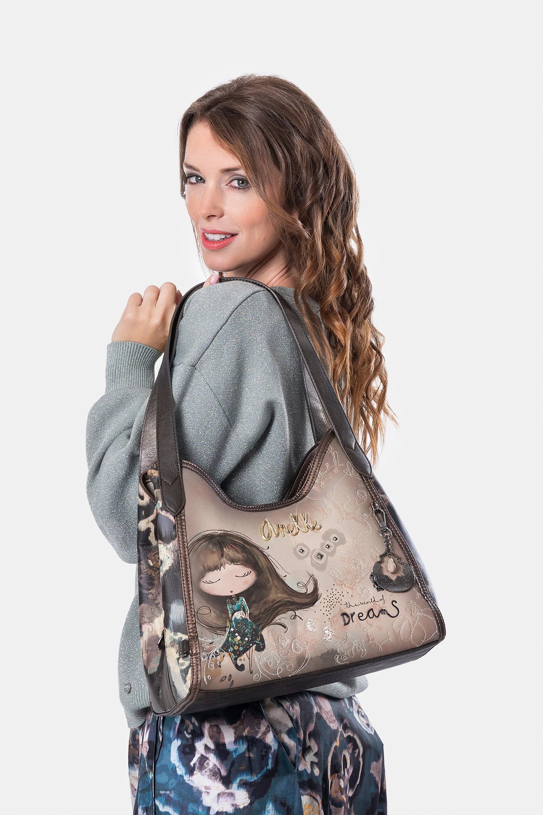 Preciosos bolsos para hombro de la marca Anekke modelo Real 41702-203. Bolsos con dos asas, elaborados en materiales sintéticos en combinado taupe/marrón/oro, con detalles de pedrería y bordados. Adorno de llavero. Bolsillo trasero con cremallera. Compartimento central con cierre de cremallera, compartimentos exteriores con cierre de broche imantado. Interior textil con bolsillos interiores. Dos asas fijas para llevar al hombro. Alto central 23 cm x alto exterior 28,5 cm x ancho inferior 31 cm x 28 cm de ancho superior y 15 cm de fondo.
