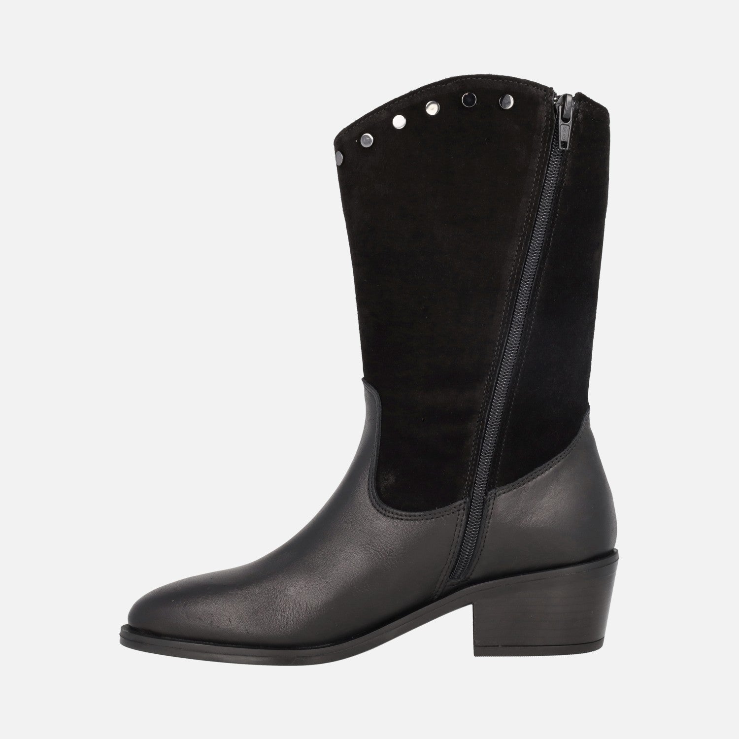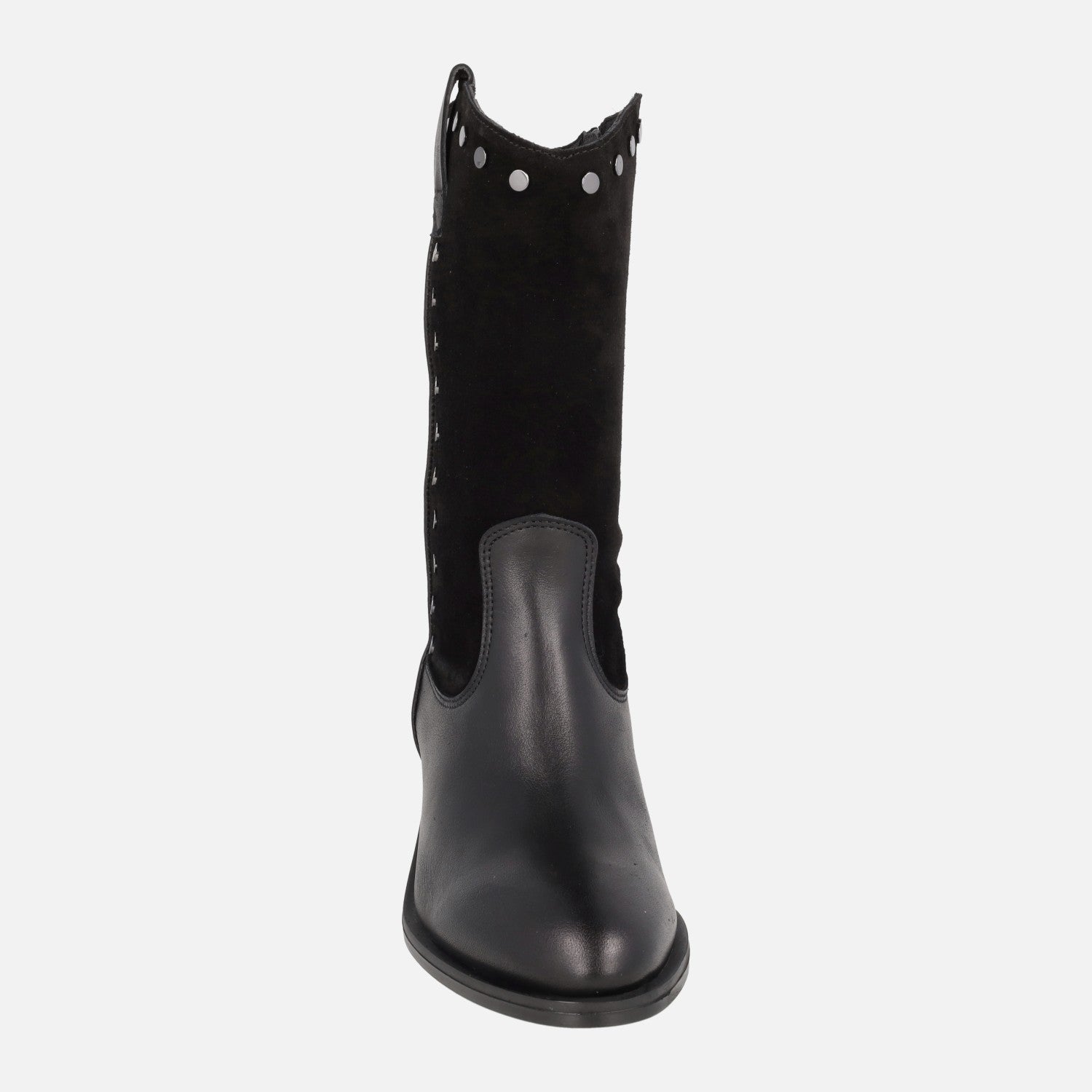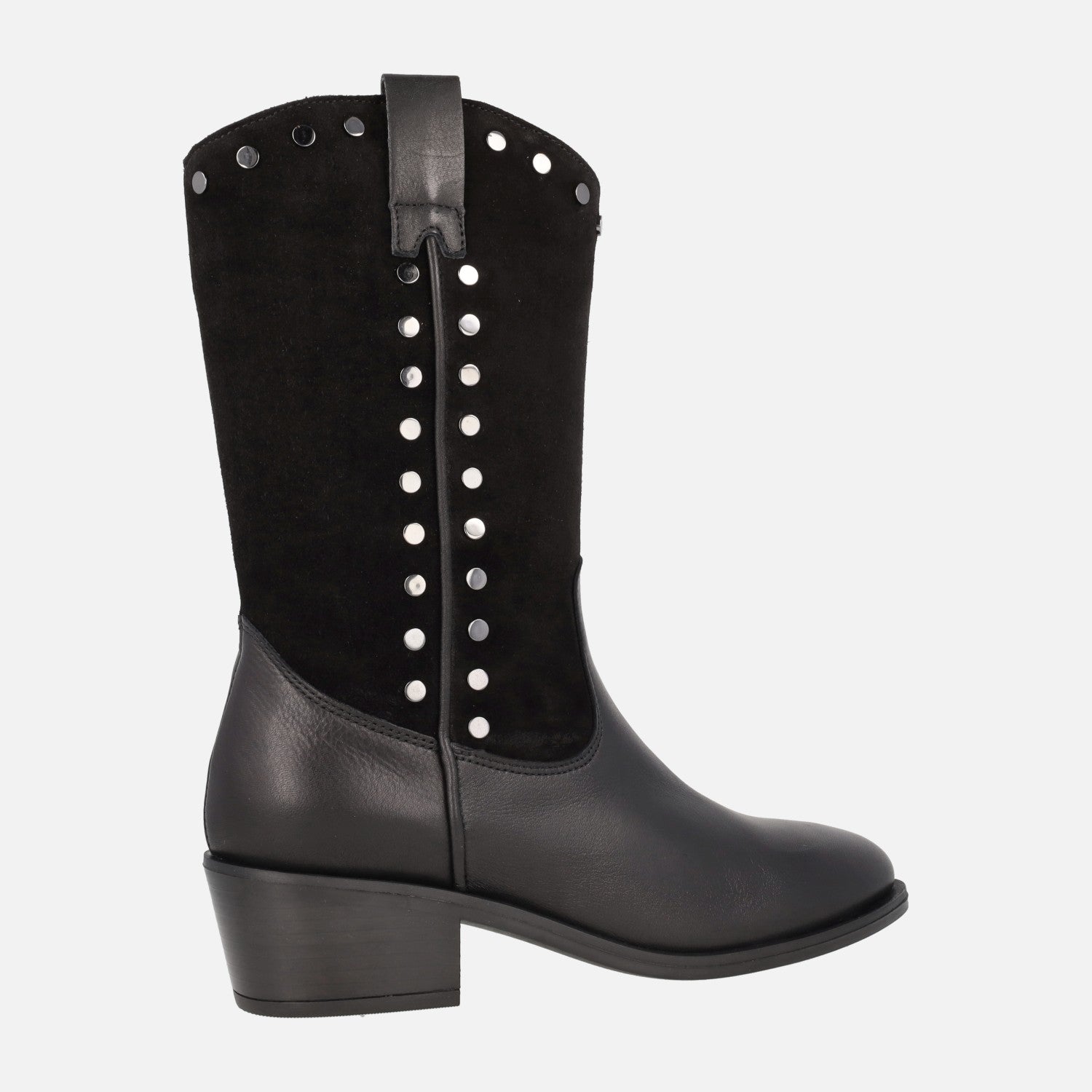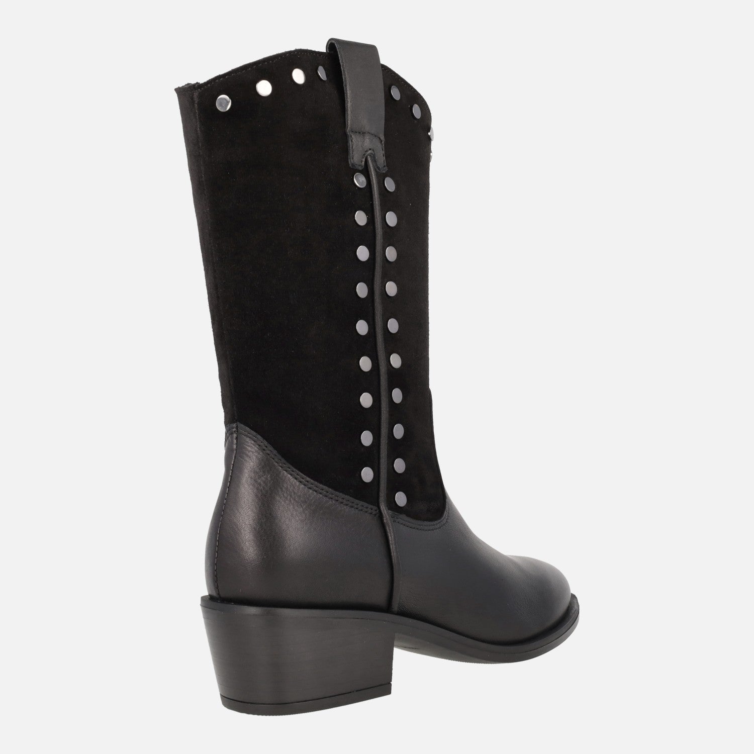 Botas estilo cowboy de la marca Alpe modelo Queens 5374 en combinado de piel y serraje negros. Botas con caña de 24 cm, estilo cowboy, detalle de tachas metálicas plateadas. Cremallera sesgada en el lado interior. Forro y planta textiles. Tacones de 5 cm.