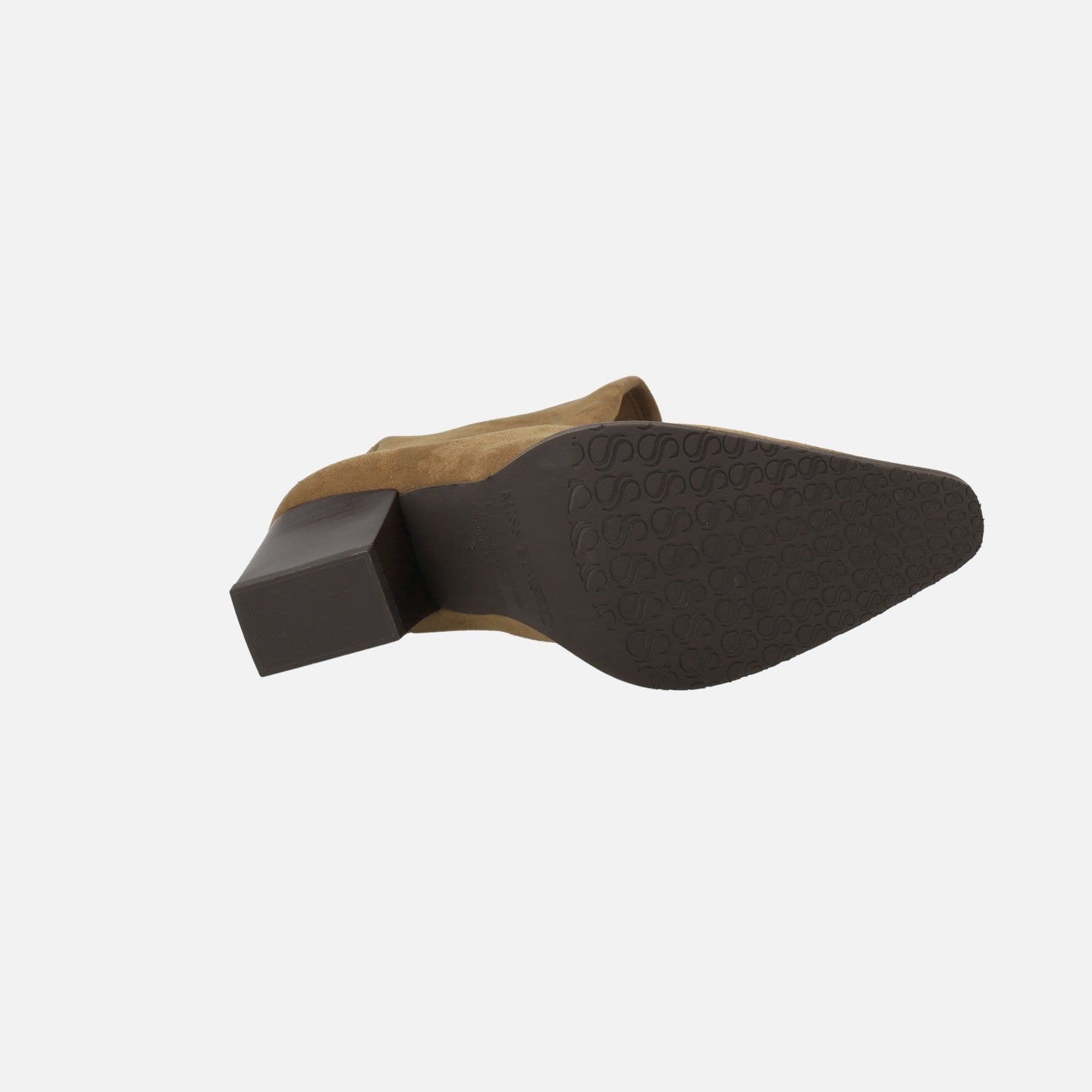Preciosas botas de la nueva colección de Miss Elastic, modelo 078150-AE Castor. Botas de caña alta elaboradas en tejido elástico con textura ante, disponibles en marrón cuero. Horma afilada, tendencia total esta temporada. La altura de caña es de 37 cms. El tejido va tratado para repeler ligeramente el agua (ECO DRY Solutions). Interior textil. Tacones anchos, de 6 cms de altura. Made in Spain. Ahora también disponibles en negro.