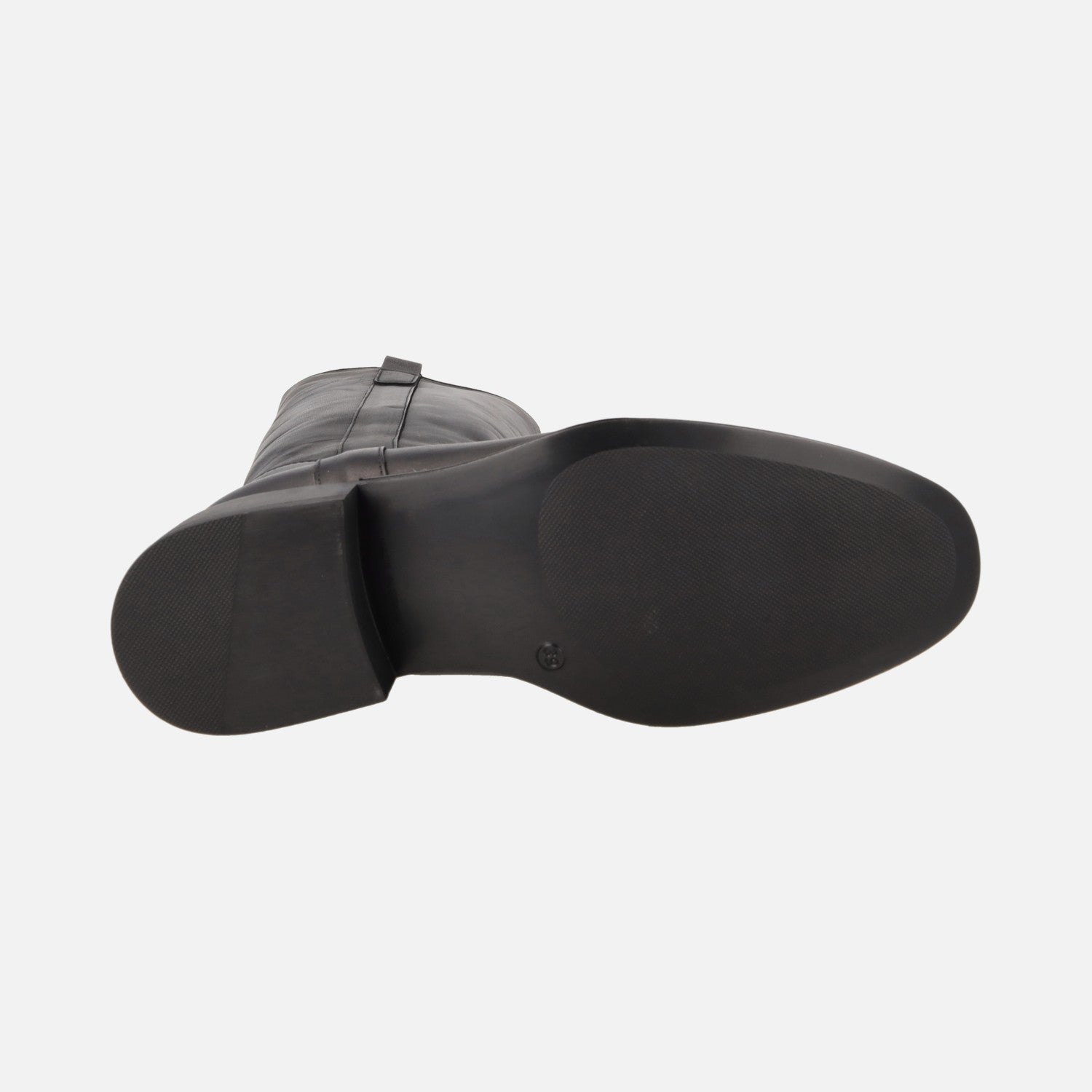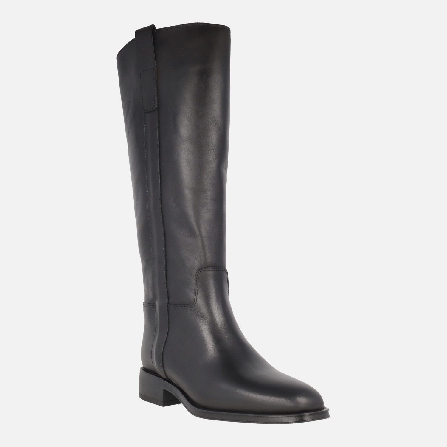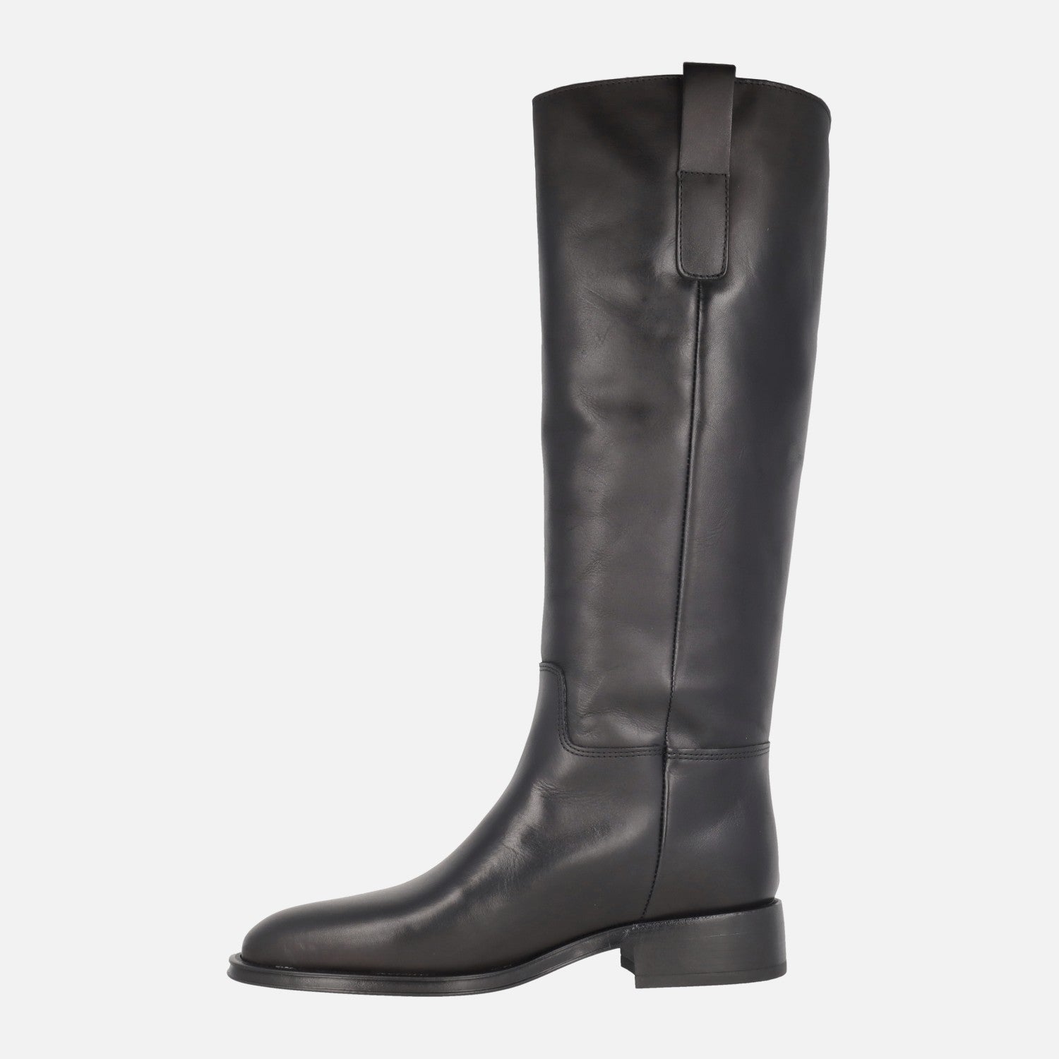Botas altas de piel en color negro de la marca Alpe, modelo Couture 5343 Ball Lux negro. Botas negras de piel, sin cremallera, con tiradores a ambos lados de la caña para facilitar el calce. Interior textil. Caña de 39 cm de altura. Piso sintético, con tacones de 3,5 cm.
