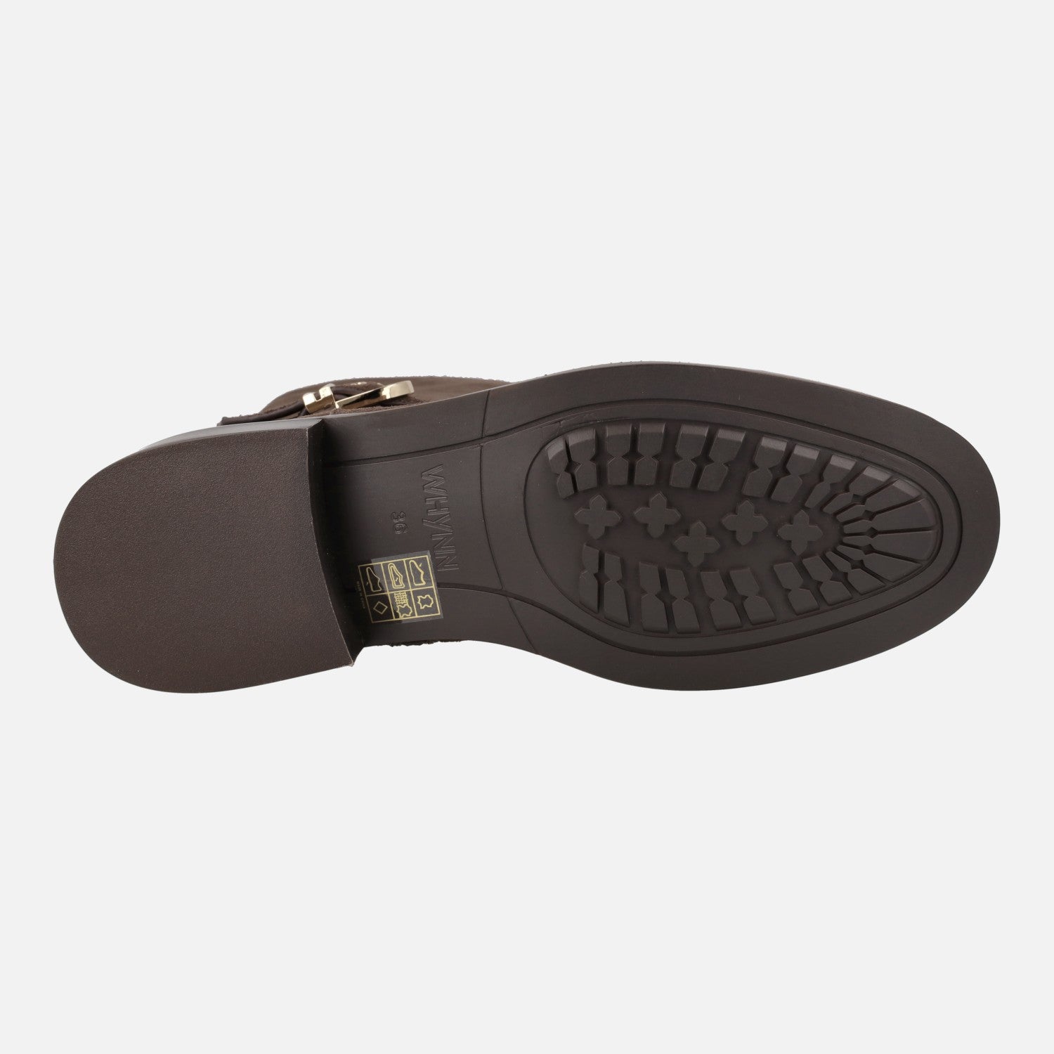 Botas altas Valeria de la marca Whynn. Botas de caña alta elaboradas en serraje marrón con cierre de cremallera a media caña en el lado interior. Adorno de tira con hebilla metálica dorada. Interior en piel y tejido afelpado. Plantillas forradas de piel. Piso sintético con tacones de 3,5 cm. Caña de 40 cm.