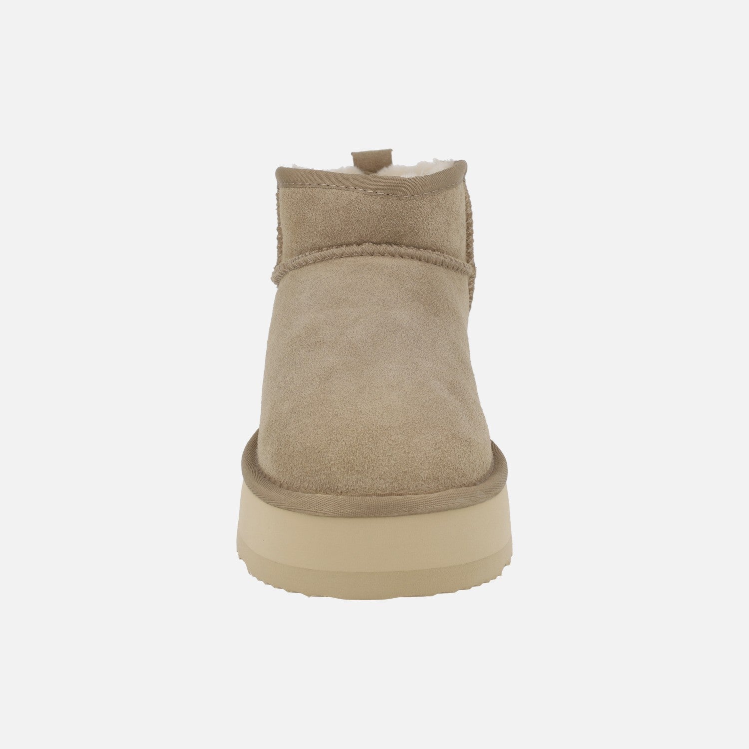 Botas bajas estilo australianas de la marca TOP3 modelo Melide arena. Botas elaboradas en piel serraje color beige, con caña y planta forradas de pelo (textil). Piso de goma con plataforma de 4,5 cms de altura en la parte trasera (3,5 en la delantera). Detalle metálica con logo en el talón. Tirador trasero para facilitar la puesta. Caña de 8,5 cm de altura.