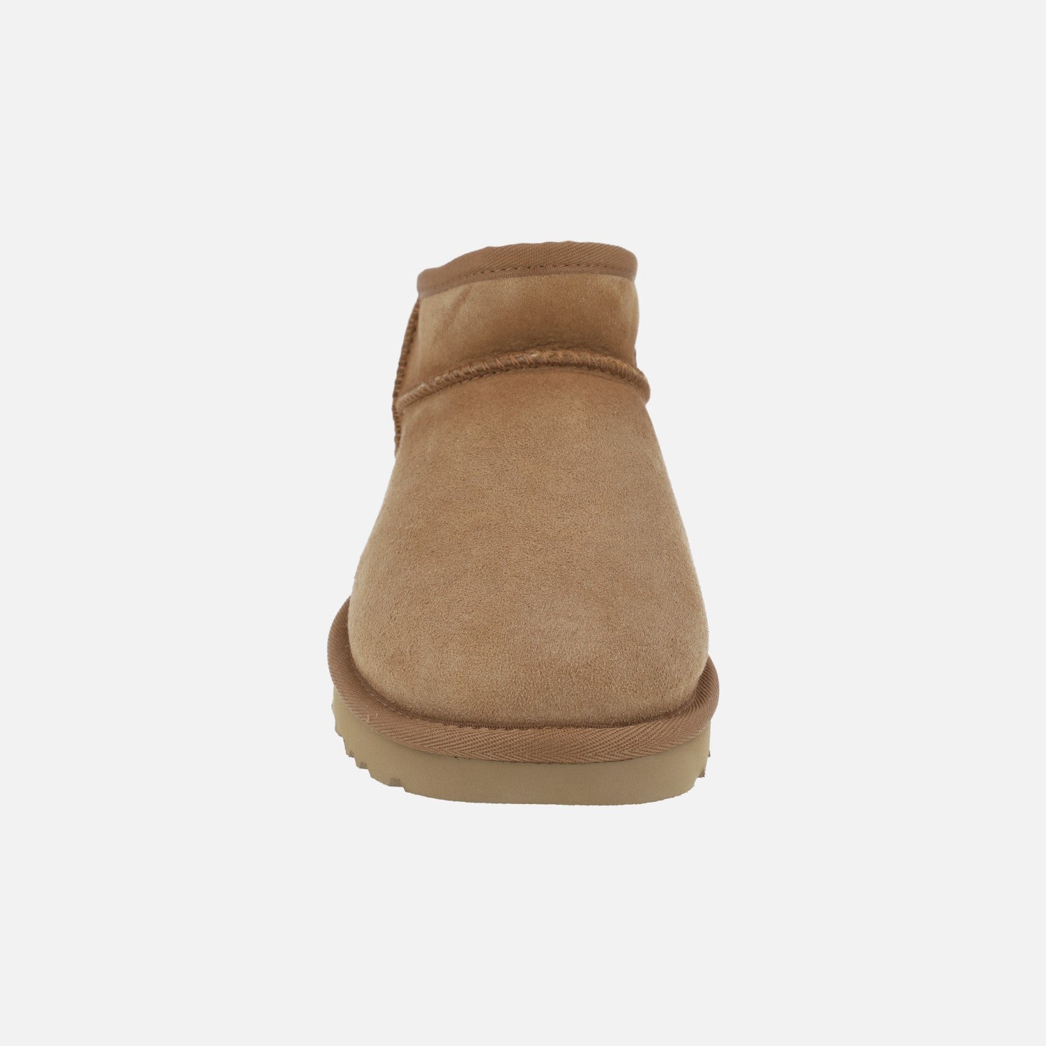 El modelo más buscado cada invierno ya está aquí: Classic Ultra Mini de UGG 1116109, disponible en chesnut (camel) y en gris (grey). Botas de caña bajita (aproximadamente 8 cm de altura), elaboradas en ante de piel de oveja de doble faz, con forro de pelo de oveja natural. Suela de EVA, muy ligera, de 3 cm de altura trasera. Ribete de tejido poliéster. Etiqueta con logo UGG en la talonera.