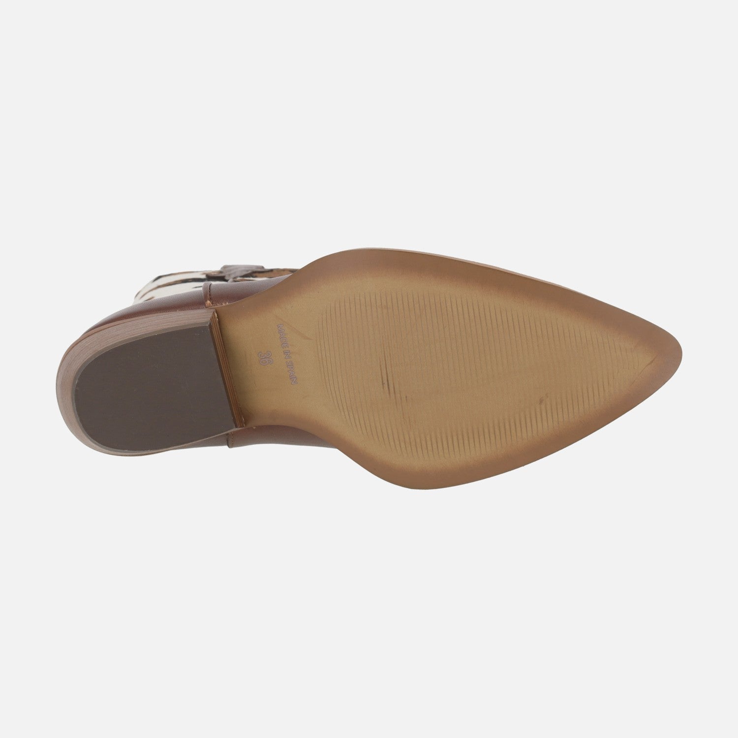 Preciosas botas estilo cowboy de la marca Alpe, modelo 5546 Western Brandy. Botas elaboradas en piel marrón, con caña en pelo animal print vaca. Dibujos pespunteados en la puntera. Horma ligeramente afilada. Sin cremallera, con tiradores laterales para ayudar al calce. Interior textil. Caña de 27 cm de altura. Tacones anchos, de 4,5 cm. Made in Spain.
