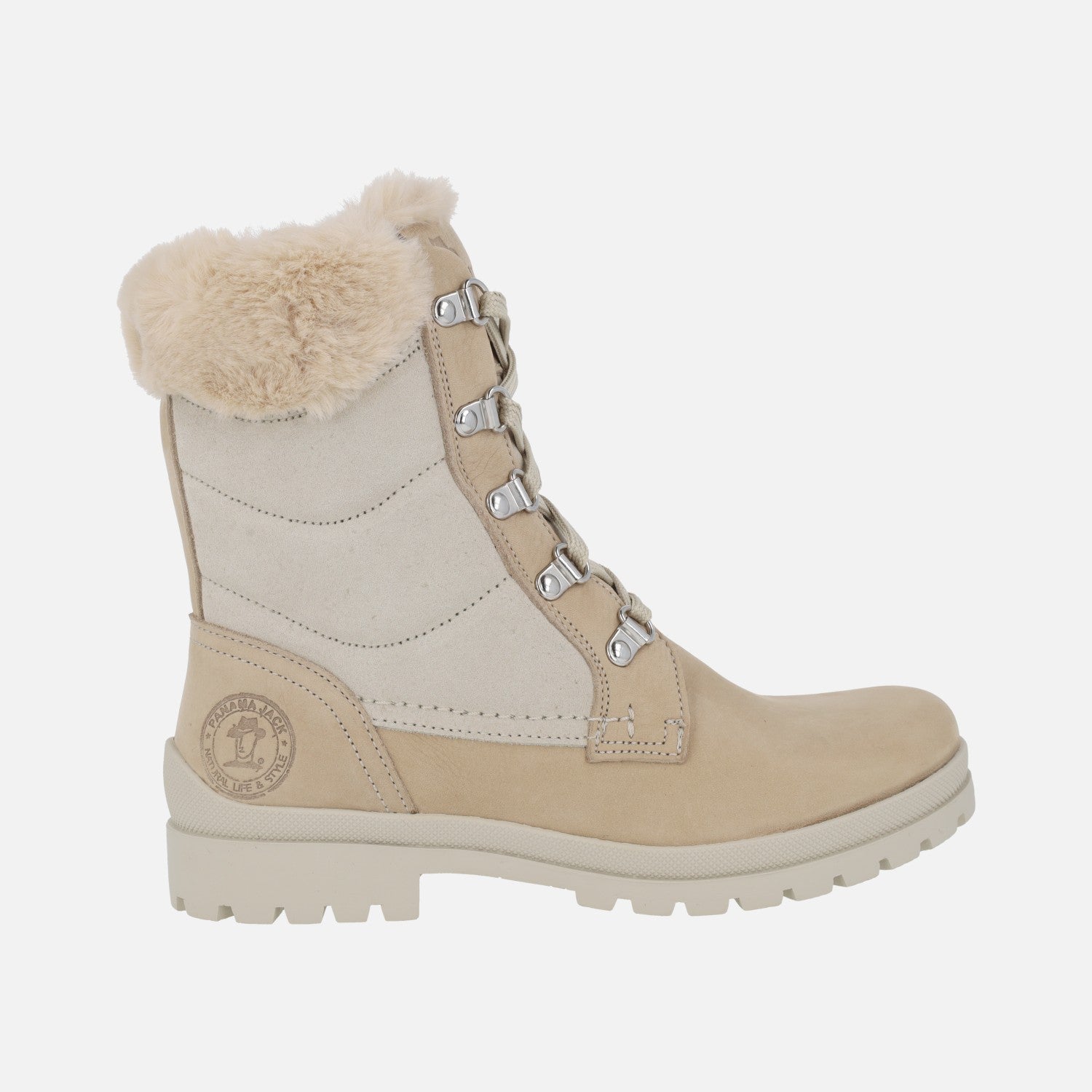 Botines de cordones para mujer de la marca Panama jack modelo Tuscani B28 Raw (crudo/beige). Botines de cordones elaborados en piel serraje y nobuck en tonos beige. Waterproof. Con collarín de pelo. Forro y planta de pelo, con plantillas extraíbles. Piso de caucho natural, muy resistente. Caña de 17 cms de altura. Piso de 3,5 cms en la parte trasera (2 cms parte delantera). Made in Spain.