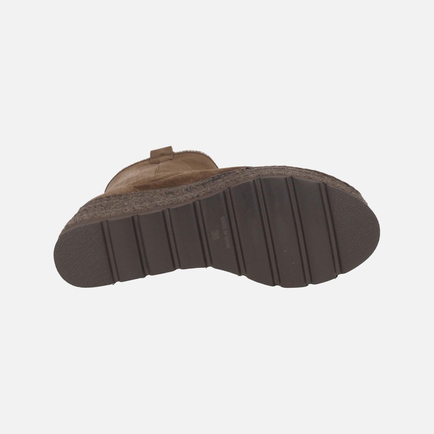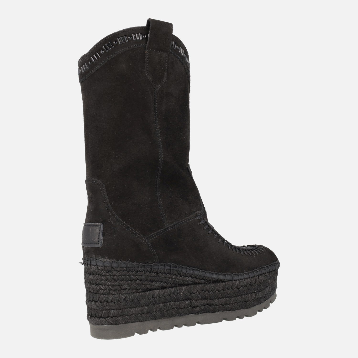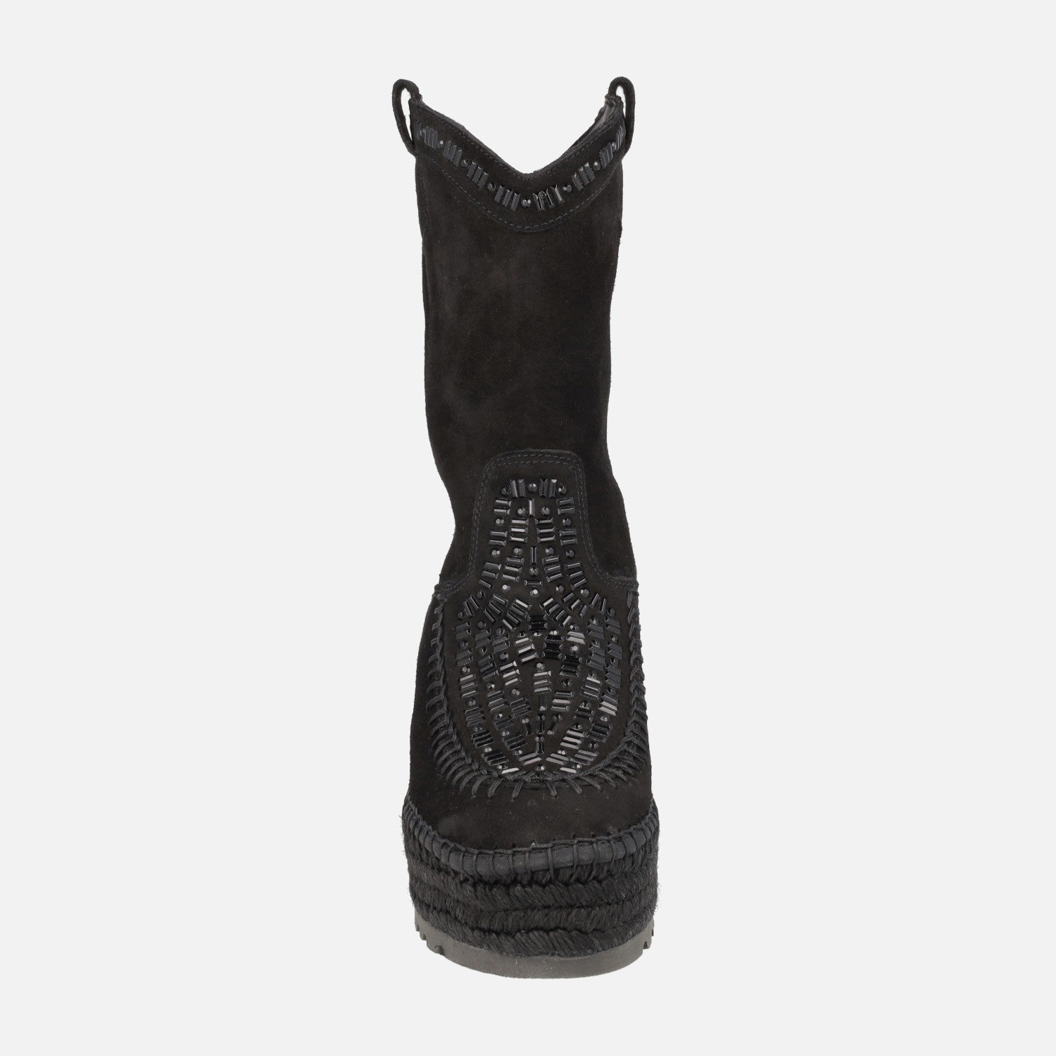 Botas altas para mujer de la marca Vidorreta modelo 98734 SIRI, disponibles en negro y en marrón oscuro. Botas elaboradas en piel serraje con interior textil. Detalles de pedrería en la pala y en la parte superior de la caña. Tiradores laterales para ayudar en el calce. Cuña y plataforma de yute natural, con suela sintética. Altura de caña 23 cm. Altura de piso 8 cm en la parte trasera (4,5 cm plataforma delantera). Made in Spain.