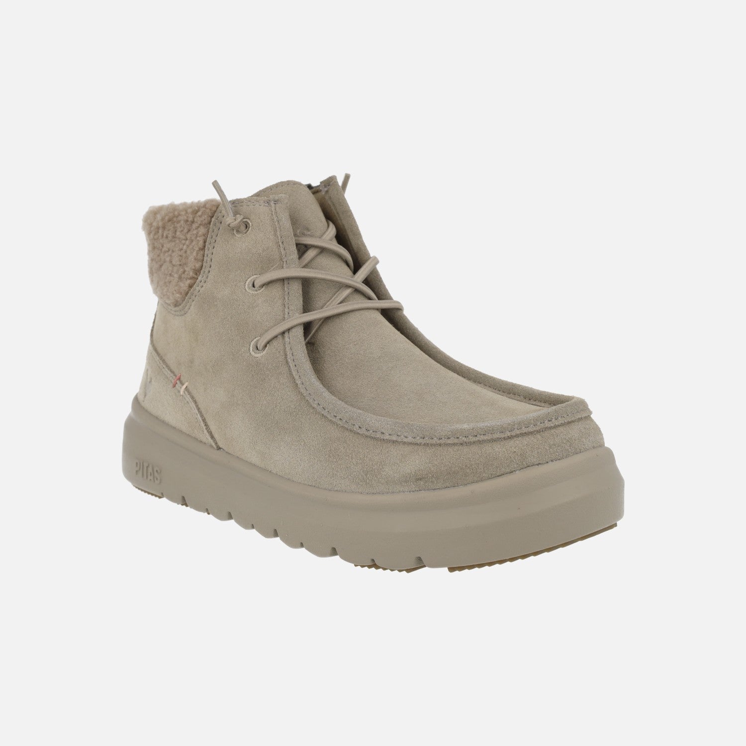 Botas para mujer de la marca Walk in pitas modelo Berna, disponibles en camel y en beige. Botas elaboradas en serraje hidrofugado repelente al agua, con collarín textil. Cordones elásticos. Interior textil con plantillas extraíbles forradas de piel. Piso de EVA Ultralight, con 4 cm de altura trasera (2,5 cm parte delantera). Caña de 9 cm.