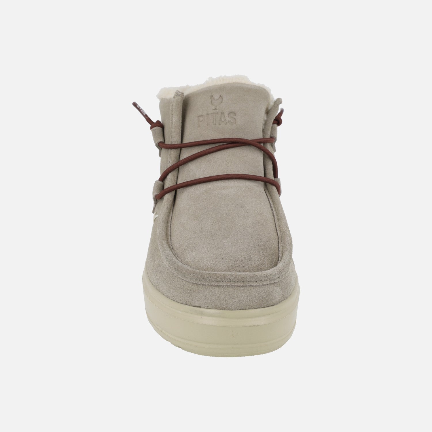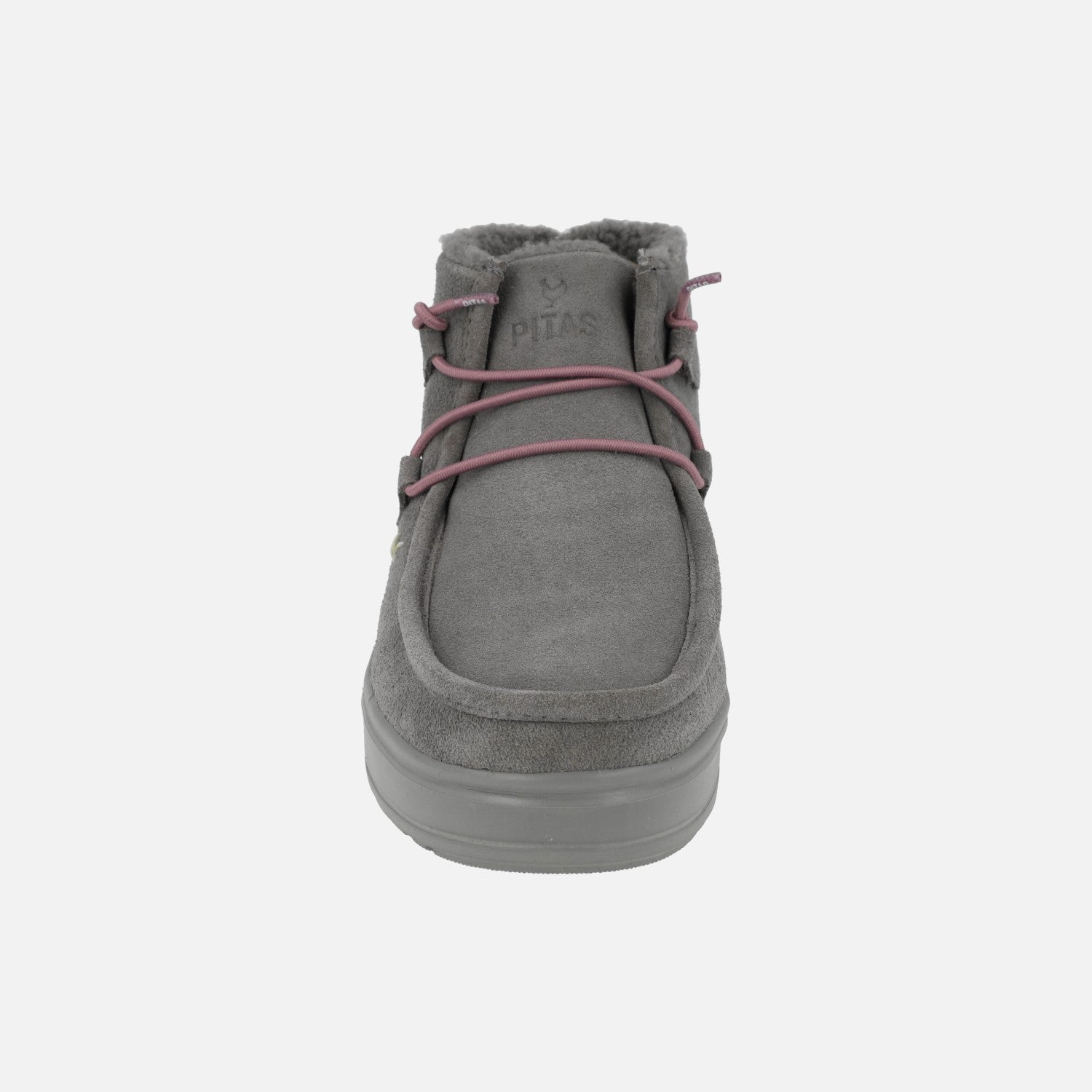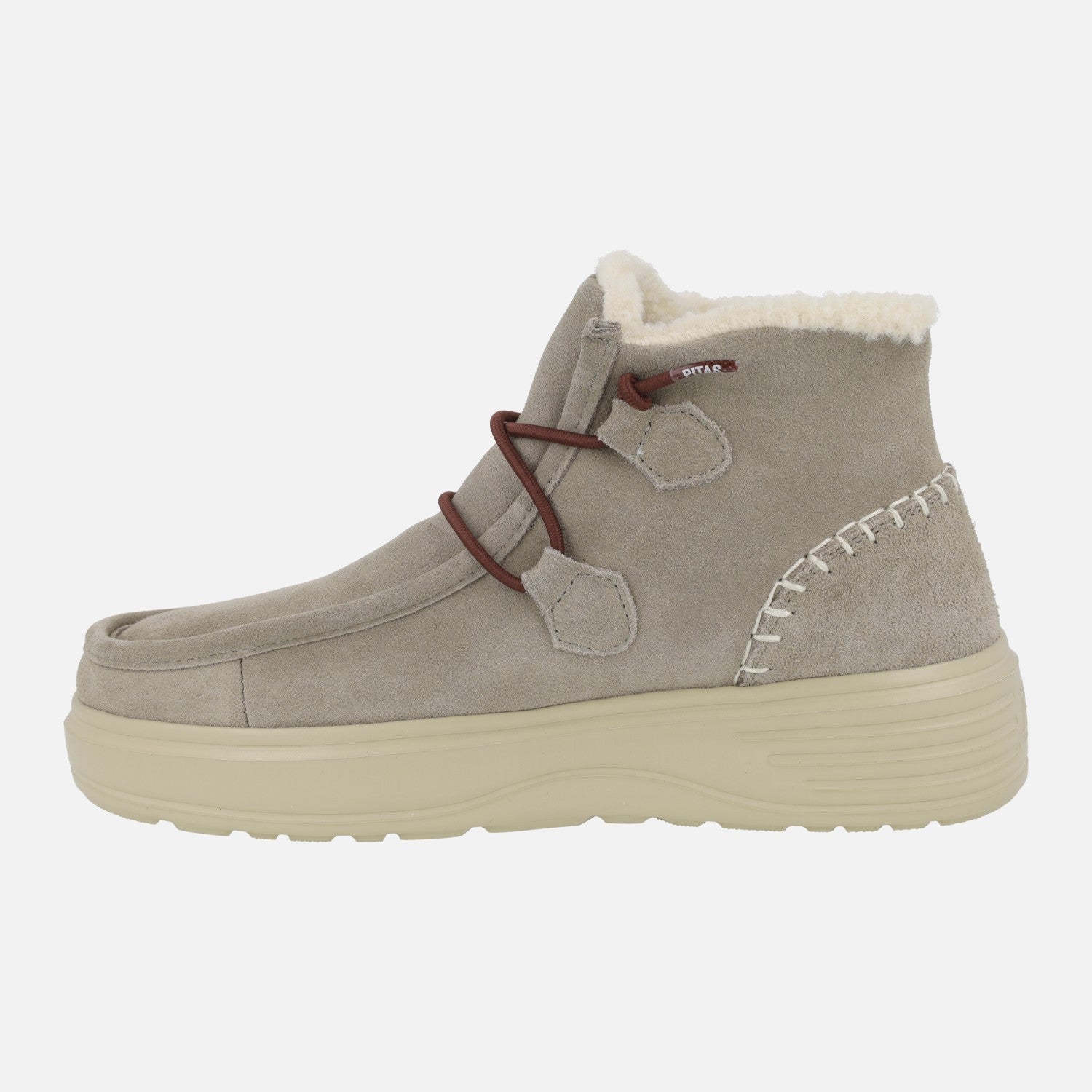 Botas para mujer modelo Sydney de la marca Walk in pitas. Botas elaboradas en serraje hidrofugado con forro de pelo sintético. Disponibles en gris y en beige. Cordones elásticos. Plantillas extraíbles de EVA con planta de piel. Caña de 9 cm. Piso de EVA Ultralight con 4 cm de altura trasera (3 cm parte delantera).