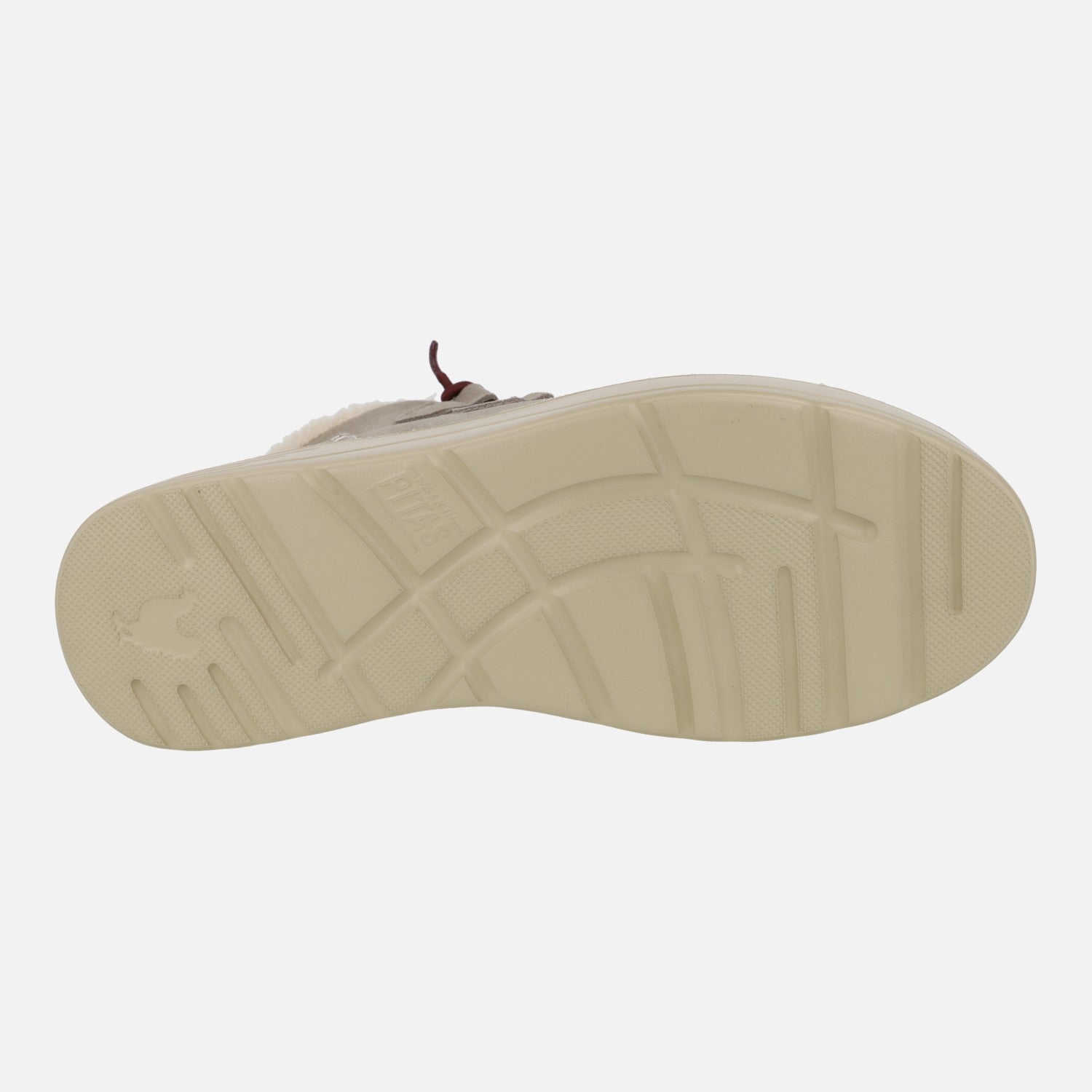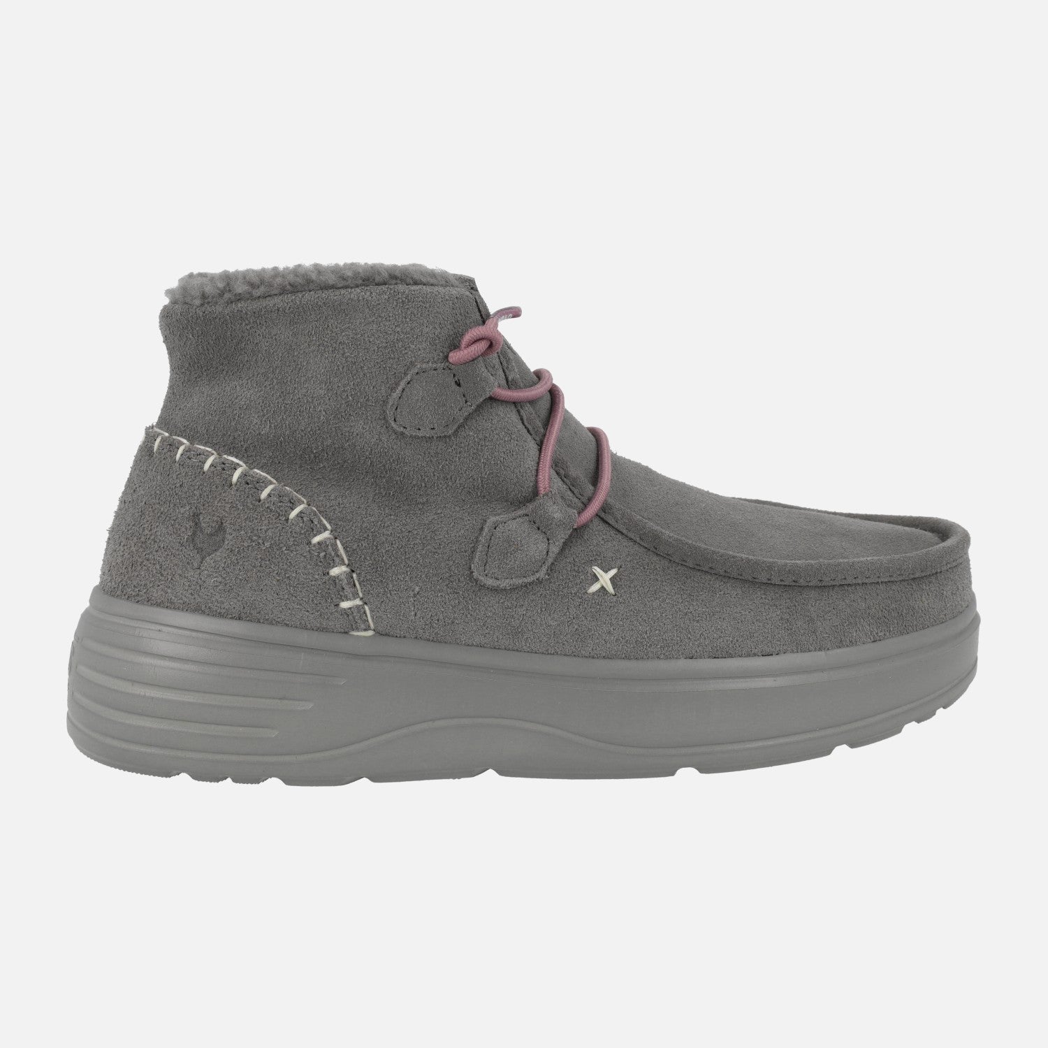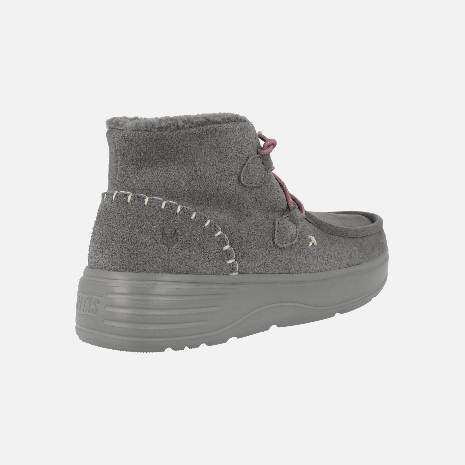 Botas para mujer modelo Sydney de la marca Walk in pitas. Botas elaboradas en serraje hidrofugado con forro de pelo sintético. Disponibles en gris y en beige. Cordones elásticos. Plantillas extraíbles de EVA con planta de piel. Caña de 9 cm. Piso de EVA Ultralight con 4 cm de altura trasera (3 cm parte delantera).