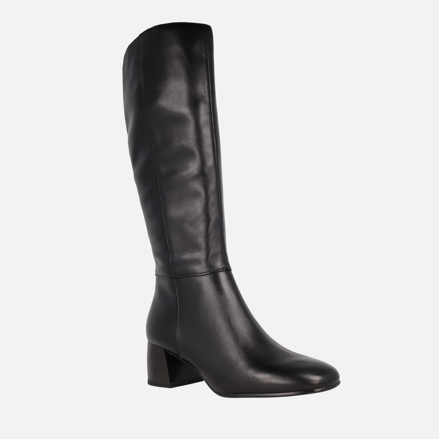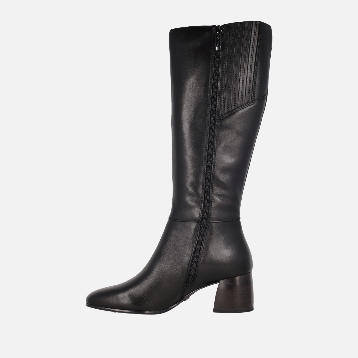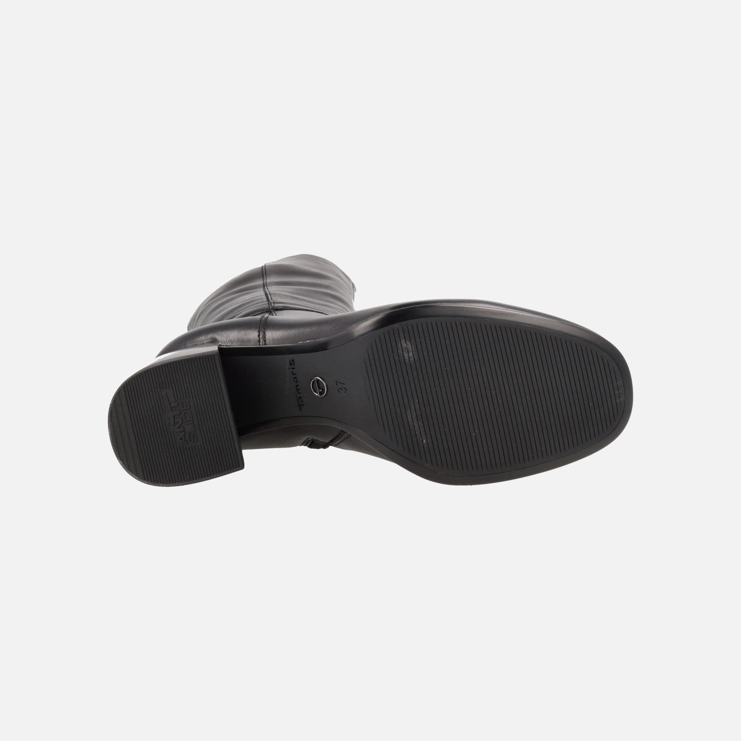 Botas altas de mujer lisas en piel negra de la marca Tamaris. Modelo 25624. Cierre con cremallera en el lateral interior con elásticos forrados para dar mas calce en la parte superior e interior de la caña. Interior mixto de textil y otros materiales. Piso de goma con tacón sport cuadrado de 5 cm de altura. Puntera cuadrada. La altura de la caña es de 37 cm.