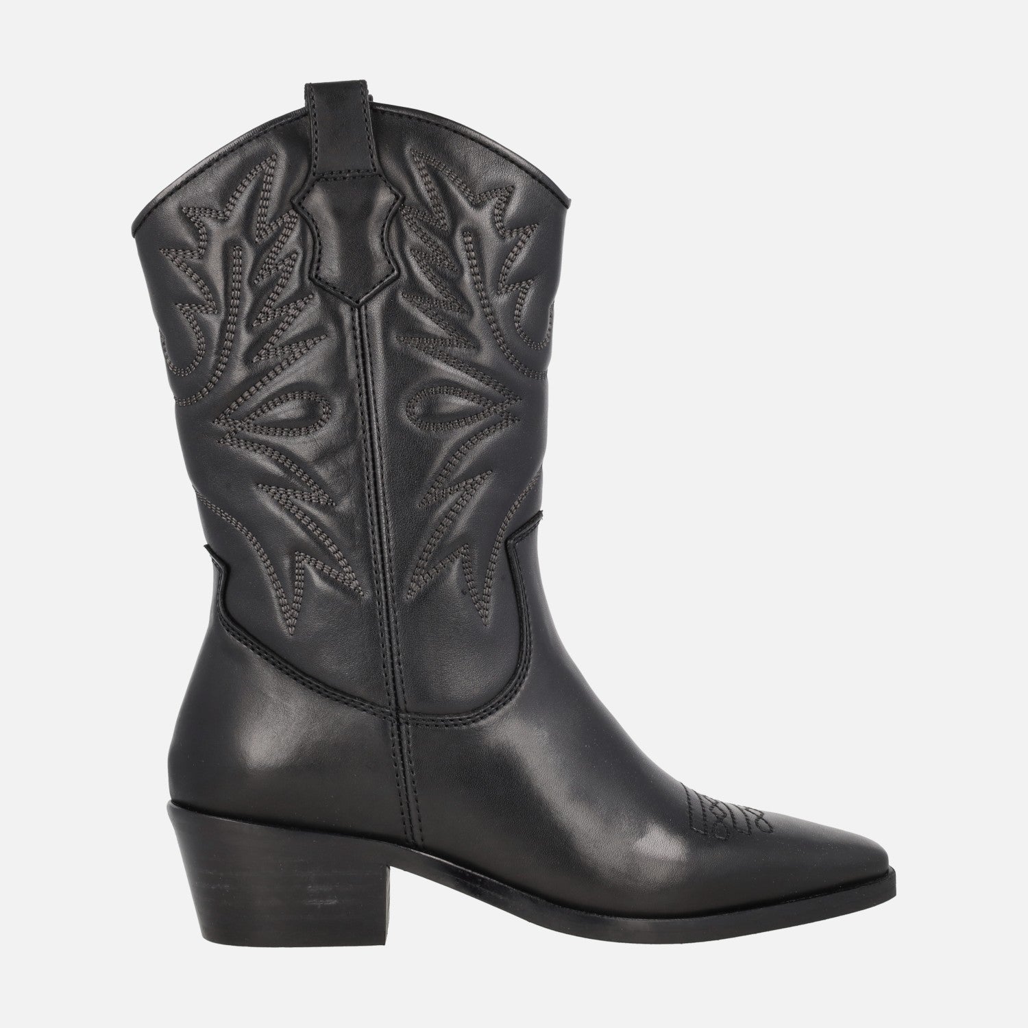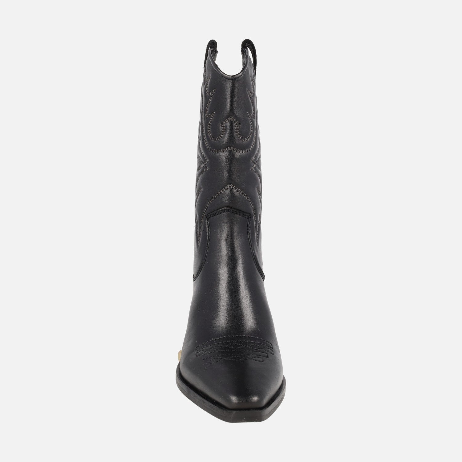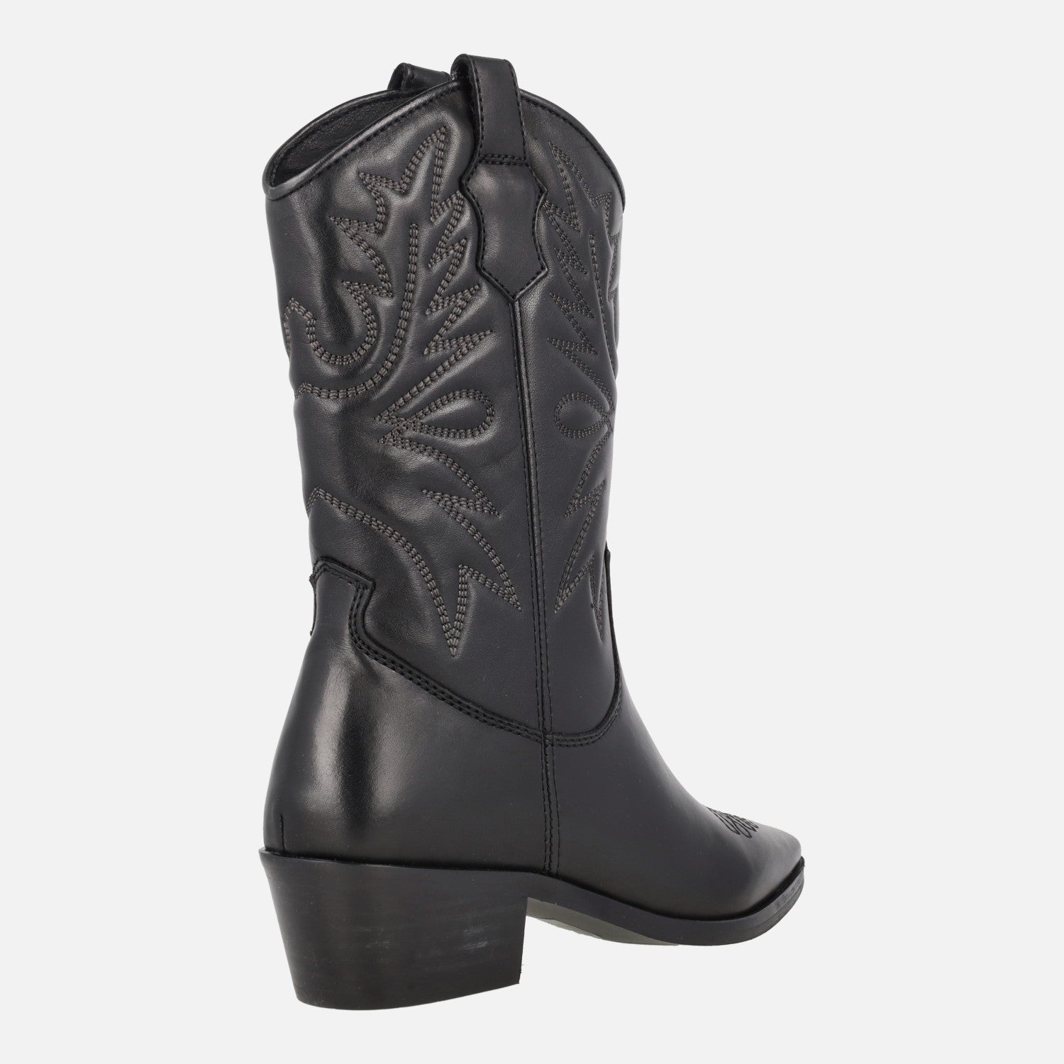 Botas estilo cowboy de la marca Lol shoes modelo Hayde 7404 Piel negra. Botas de horma afilada elaboradas en piel negra con bordados en la caña. No lleva cremallera, pero si un tirador a cada lado de la caña para ayudar en el calce. Interior mixto en tejido y sintéticos. Caña de 23,5 cm de altura. Tacones de 5 cm. Piso sintético.