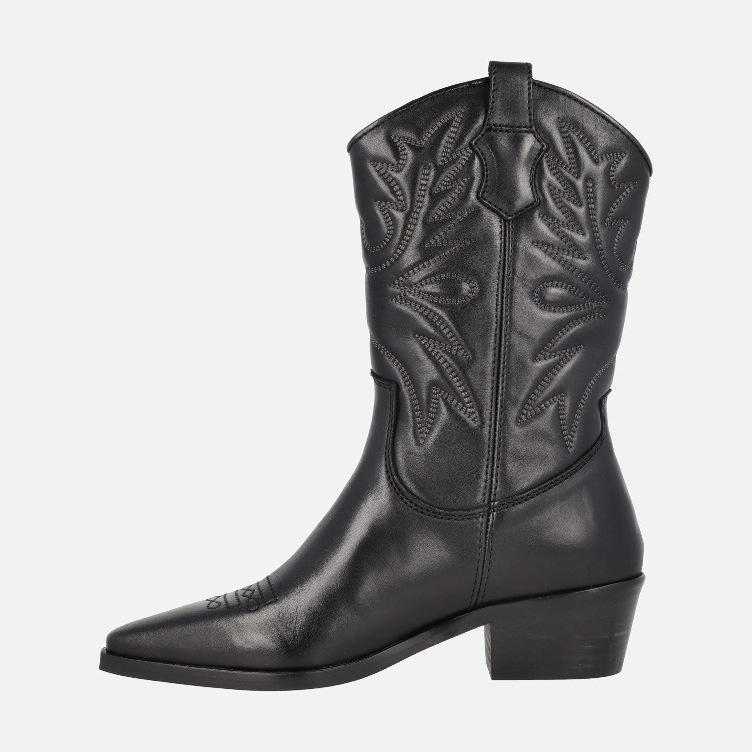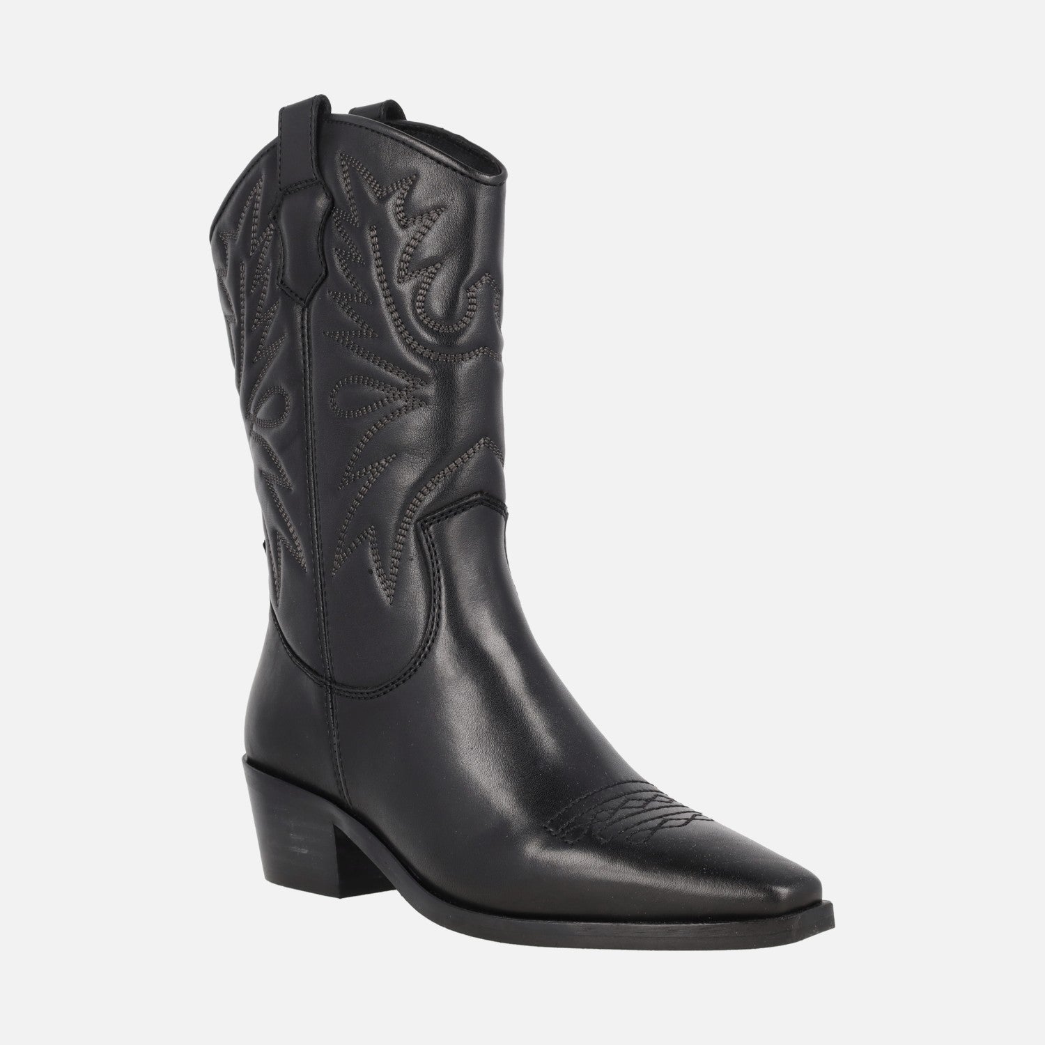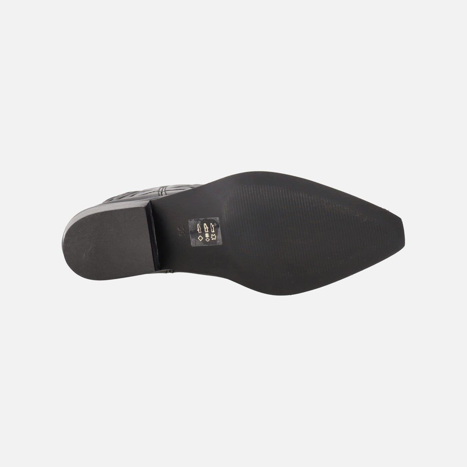 Botas estilo cowboy de la marca Lol shoes modelo Hayde 7404 Piel negra. Botas de horma afilada elaboradas en piel negra con bordados en la caña. No lleva cremallera, pero si un tirador a cada lado de la caña para ayudar en el calce. Interior mixto en tejido y sintéticos. Caña de 23,5 cm de altura. Tacones de 5 cm. Piso sintético.