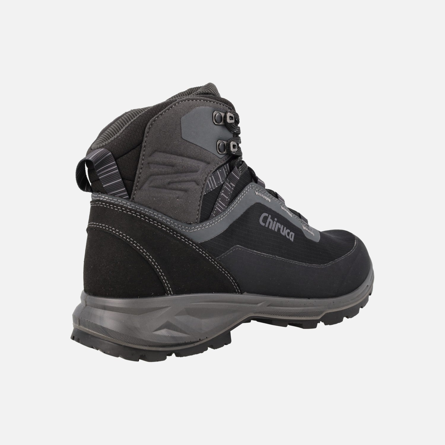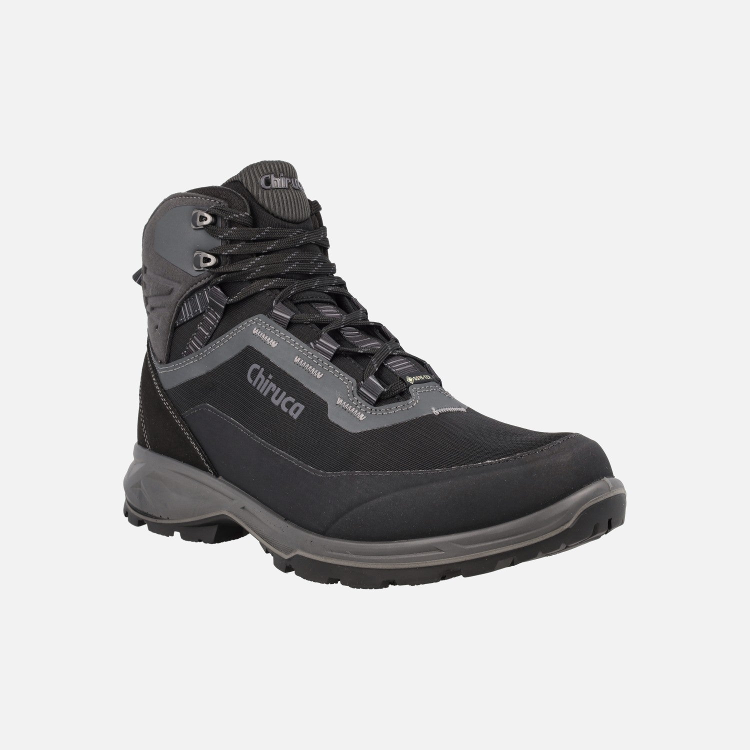 Botas negras para hombre de la marca Chiruca modelo Geiser 03 Gore tex. Botas de senderismo elaboradas en tejido y sintéticos en color negro, con cierre de cordones (cordura hidrofugada). Interior textil con plantillas extraíbles. Membrana interior GORE TEX, impermeable. Piso de poliuretano de doble densidad.