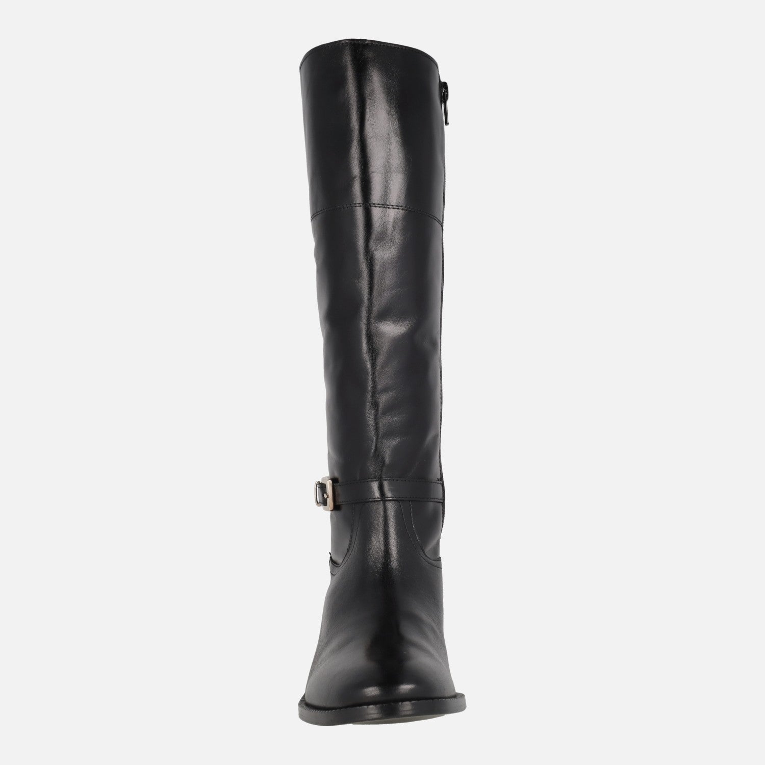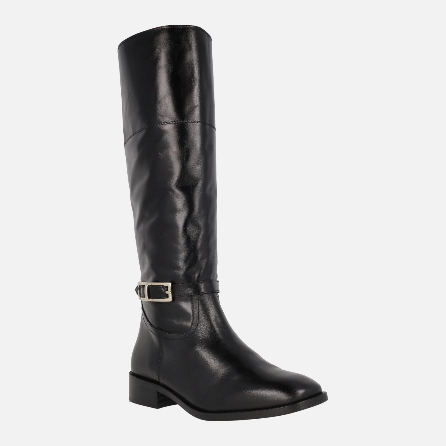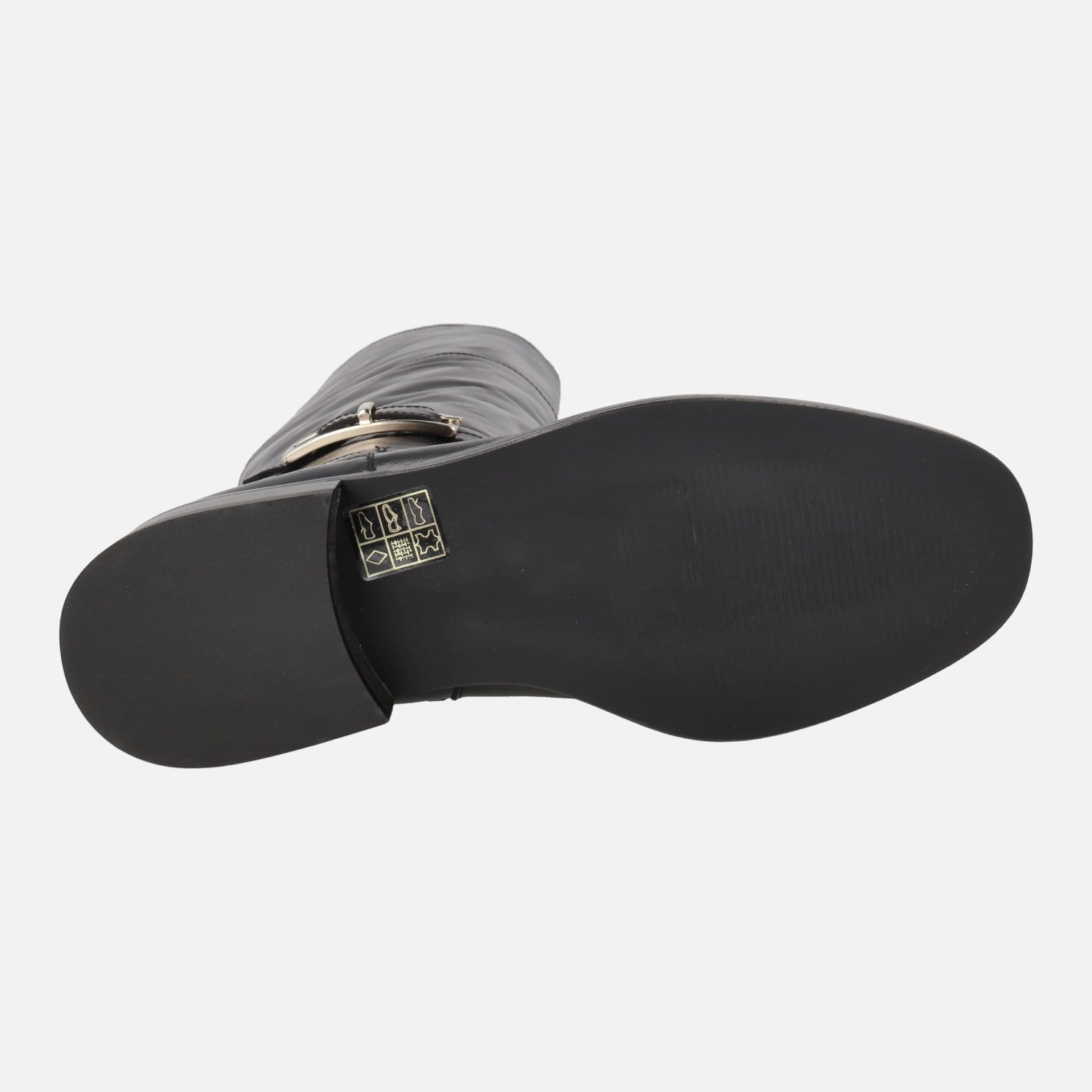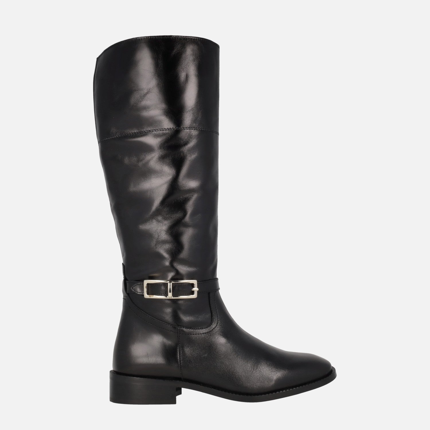 Botas planas de la marca Funchal, modelo 4907, en piel negra, con adorno hebilla metálica en plata. En la parte interior lleva cierre con cremallera, y el forro y las plantillas son textiles. Piso de goma. Altura del tacón de 3 cm. y la altura de la caña es de 36,5 cm. Made in Spain.