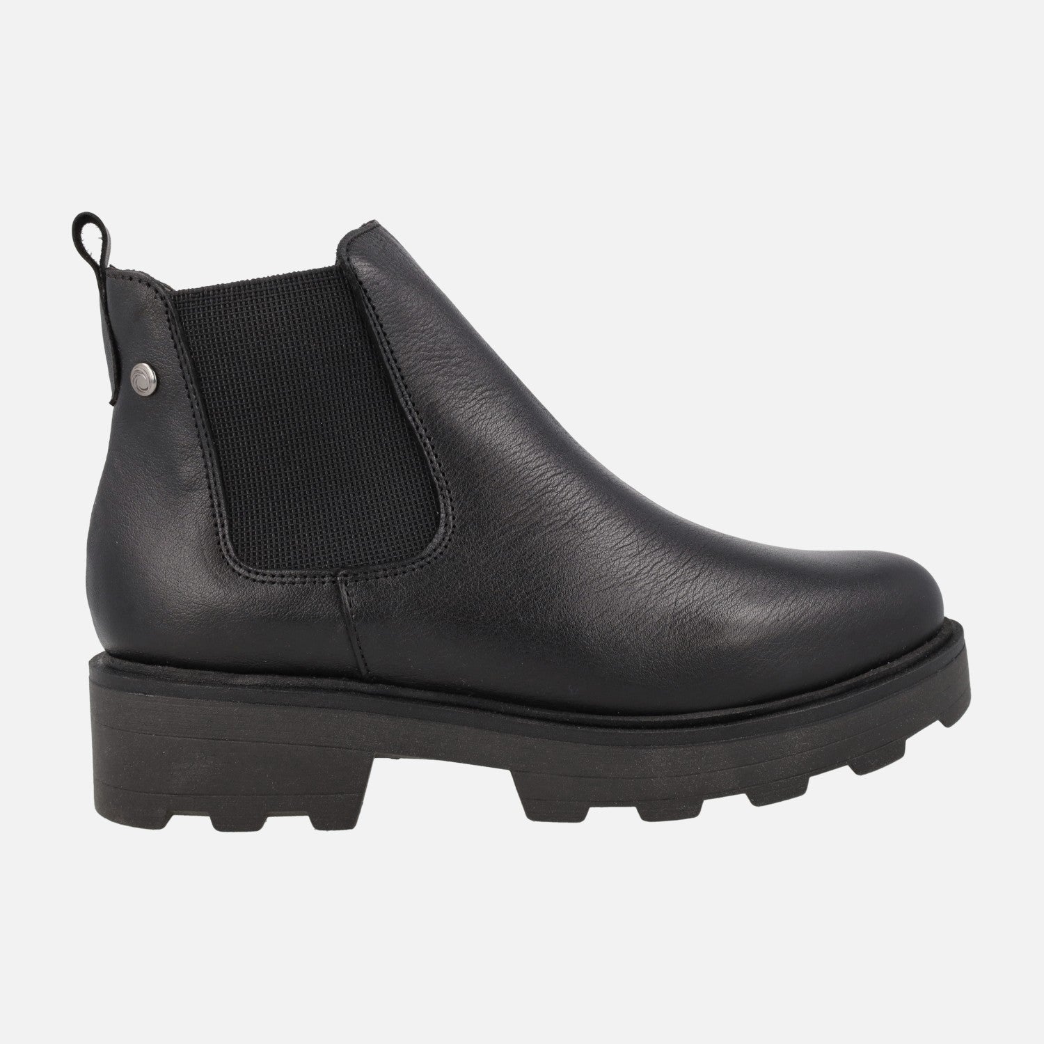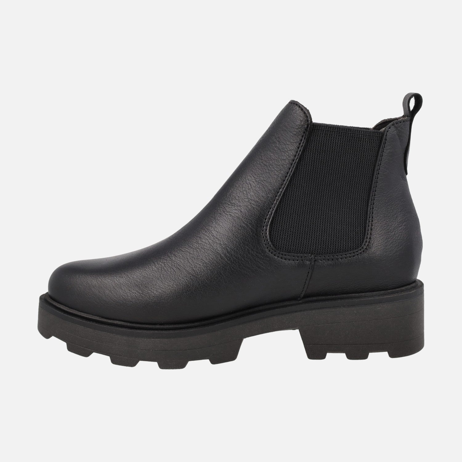 Botines Chelsea para mujer de la marca Kaola, modelo 6738. Fabricados en piel Negra con elásticos al tono en ambos lados. Forro y plantillas en piel y textil. Piso de goma con altura de 4,5 cm. y 2,5 cm. de plataforma. Altura de caña 11 cm.