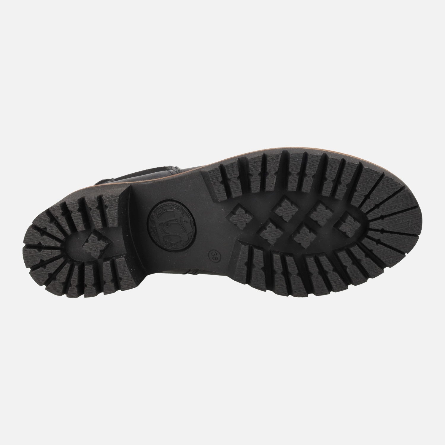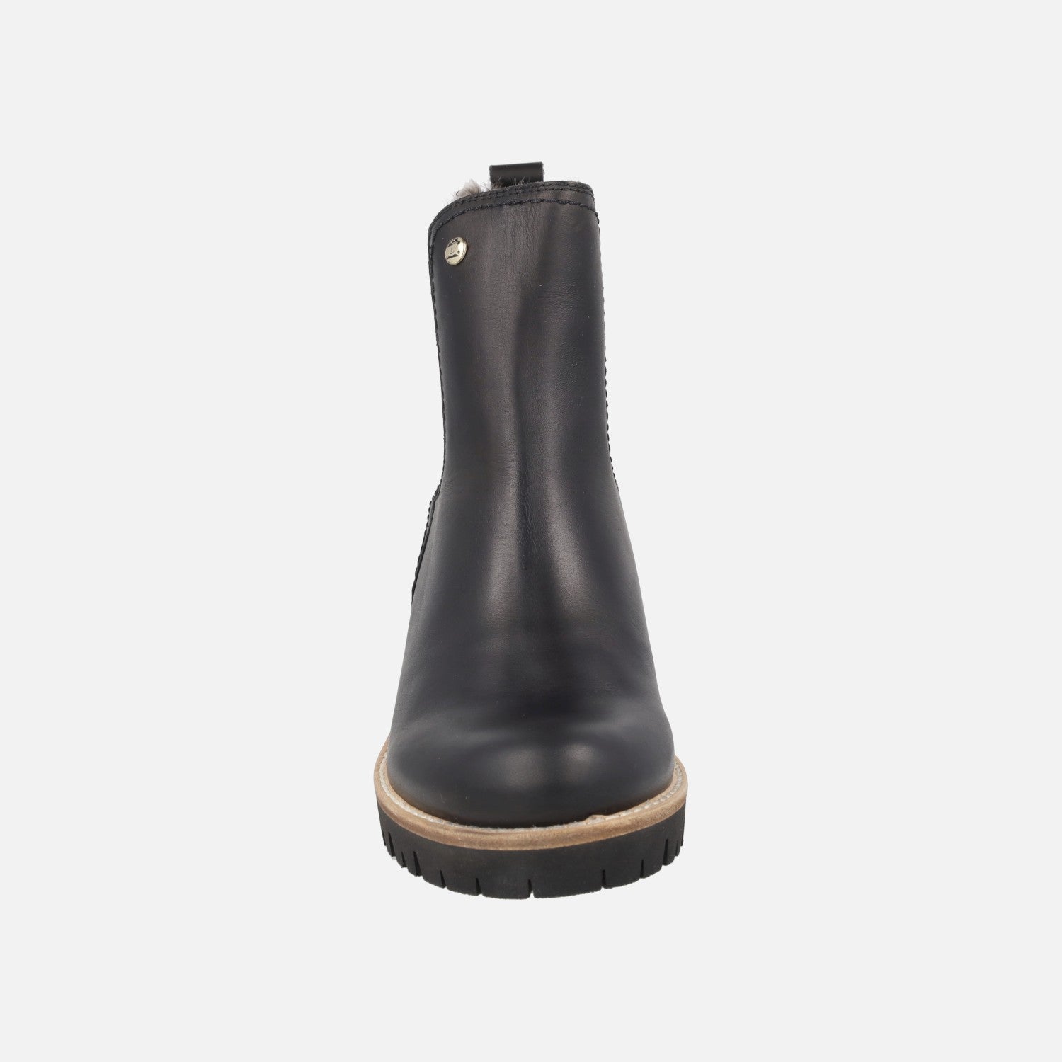 Elegantes botines para mujer modelo PIA TRAV B1 Napa negro, de la marca Panama jack. Botines de tacón, estilo chelsea, con elásticos laterales. Elaborados en piel negra, con forro de pelo. Piso de TPU ligero y resistente, con 5,5 cm de tacón (2 cm plataforma delantera). Caña de 14 cm de altura. Made in SPain.