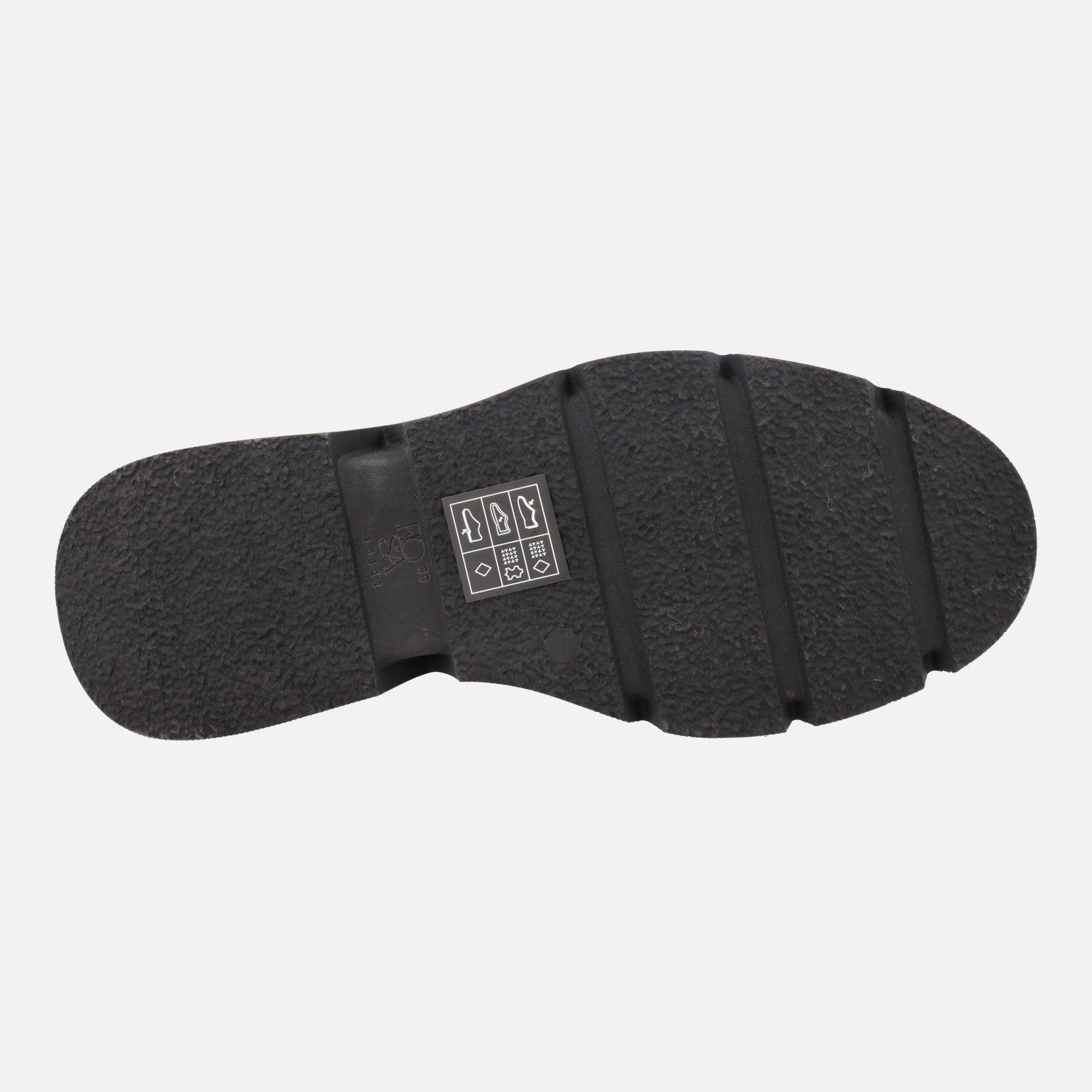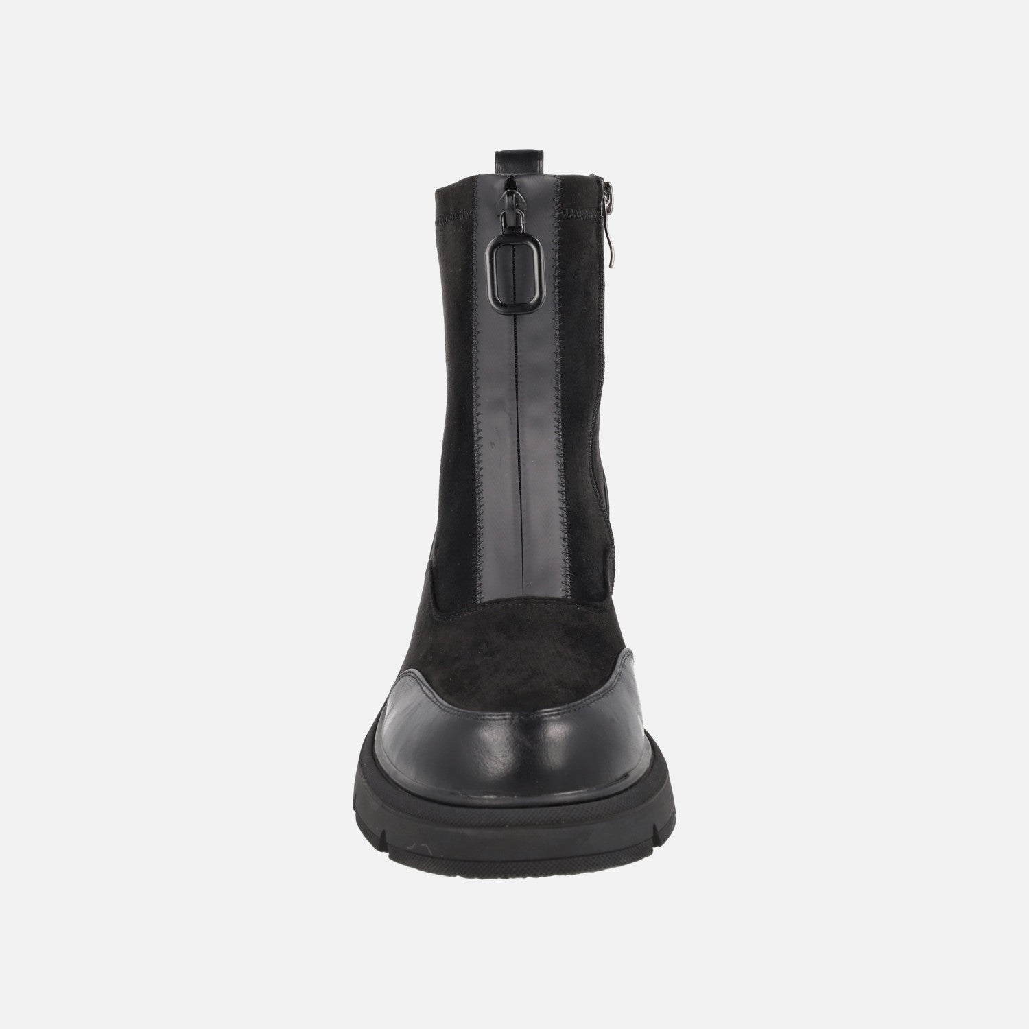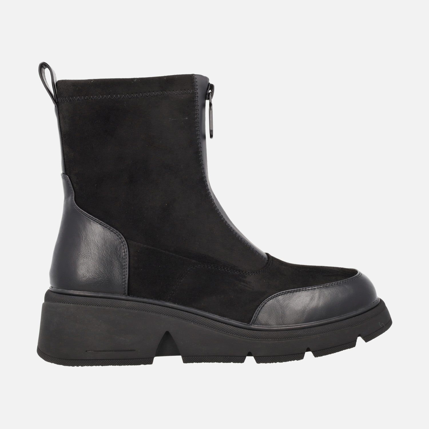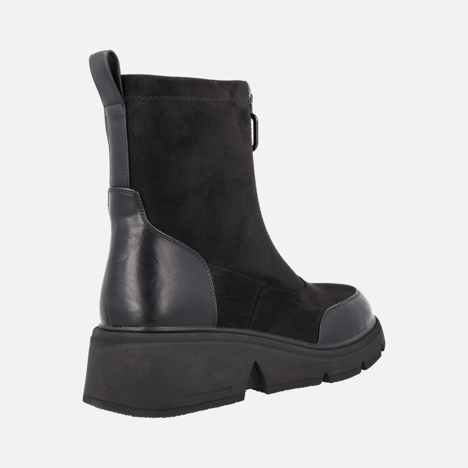 Botines del modelo 462K351 de la marca Rosa Amada. Combinados en sintético y textil negro. El forro y las plantillas son de piel y textil. Piso cuña en goma, con una altura de tacón de 5 cm. y en la parte delantera de 2,5 cm. La altura de la caña es de 15 cm.