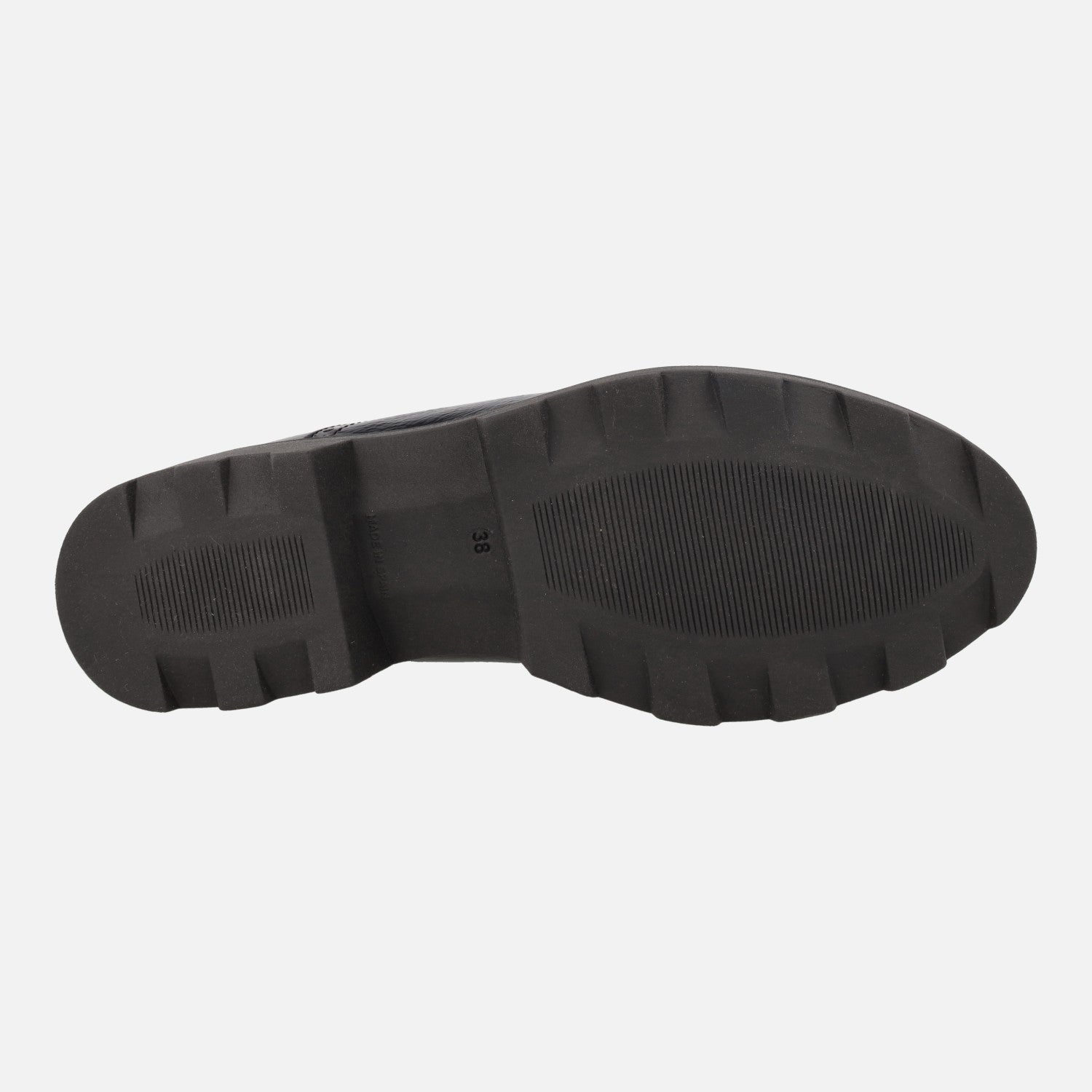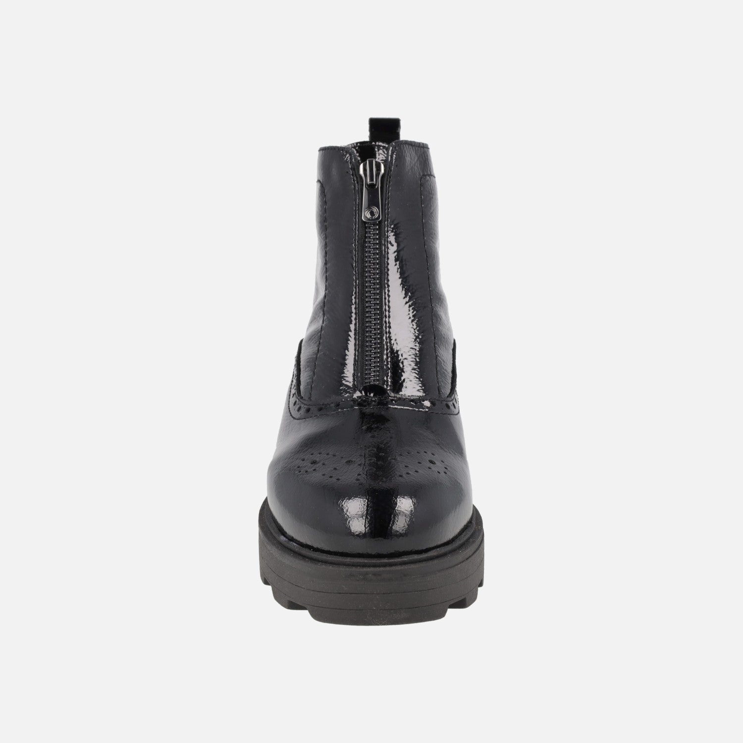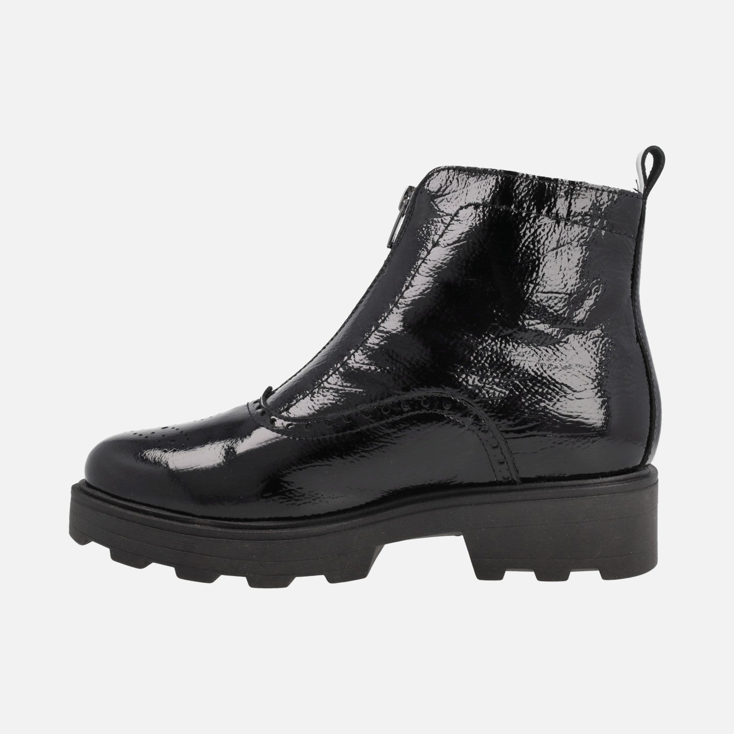 Botines en piel charol negro de la marca Kaola, modelo 6337. Llevan cremallera central que hace de cierre y pieza superpuesta en la puntera con picados. Forro y plantillas son de piel y textil. Piso track de goma con tacón de 4,5 cm y en la parte delantera plataforma de 3,5 cm. Caña de 12 cm. Made in Spain.
