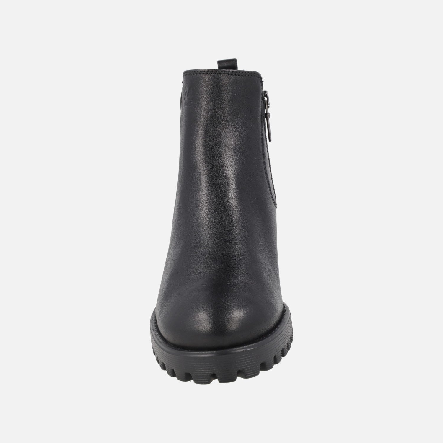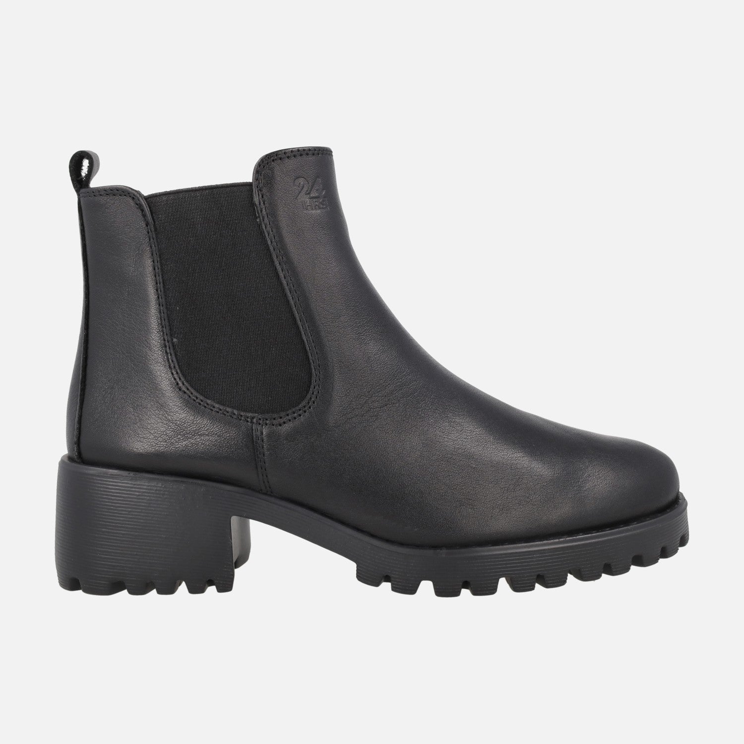 Botines confort para mujer de la marca 24 horas, modelo 26568 Negro. Botines inspiración chelsea, con elástico en el lado exterior pero cremallera en el interior. Elaborados en piel negra, pequeño tirador trasero para facilitar el calce. Interiores forrados de piel. Piso sintético, ligero, de 5 cm de tacón y 2 cm de plataforma delantera. Caña de 11 cm.
