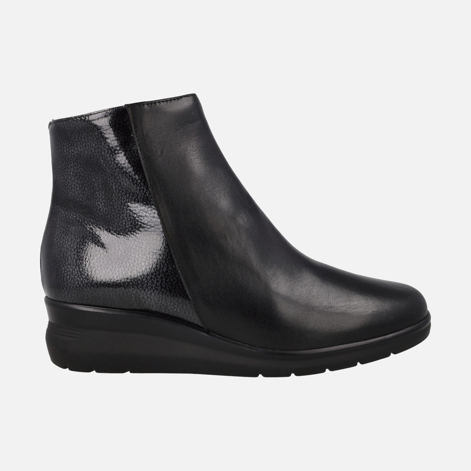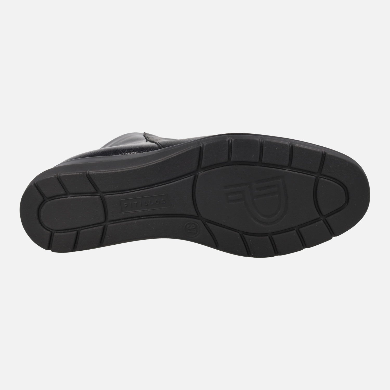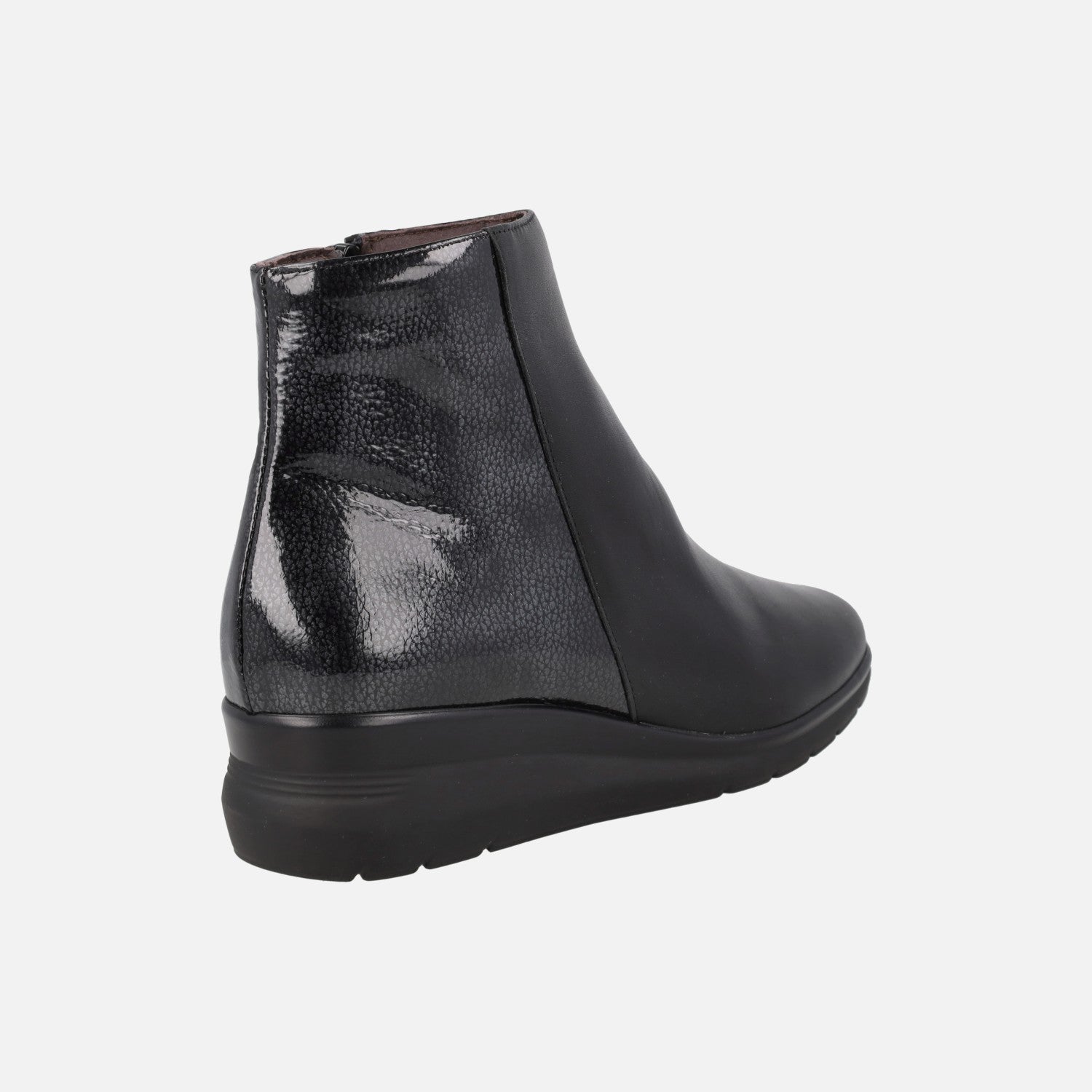 Botines confort para mujer de la marca Pitillos modelo 10736 Negro. Botines combinados en piel lisa y charol con cierre de cremallera en el lado interior. Forro y planta textiles, plantillas extraíbles. Piso sintético con cuña de 4 cm de altura trasera (1,5 cm parte delantera). Caña de 11 cm.
