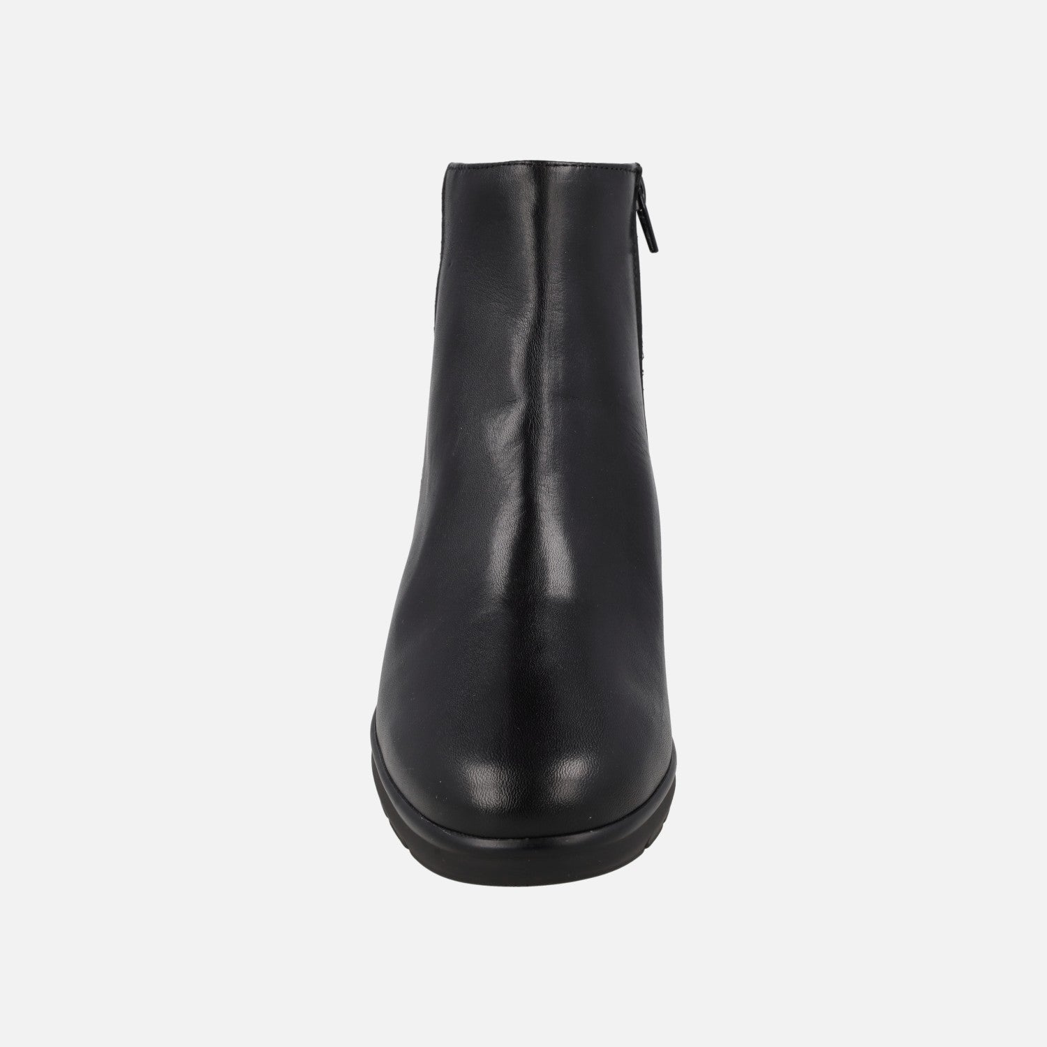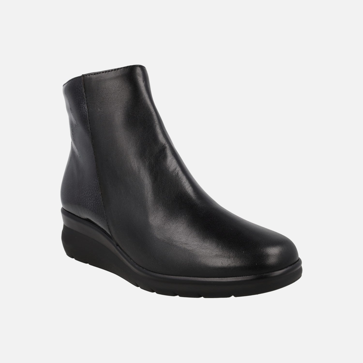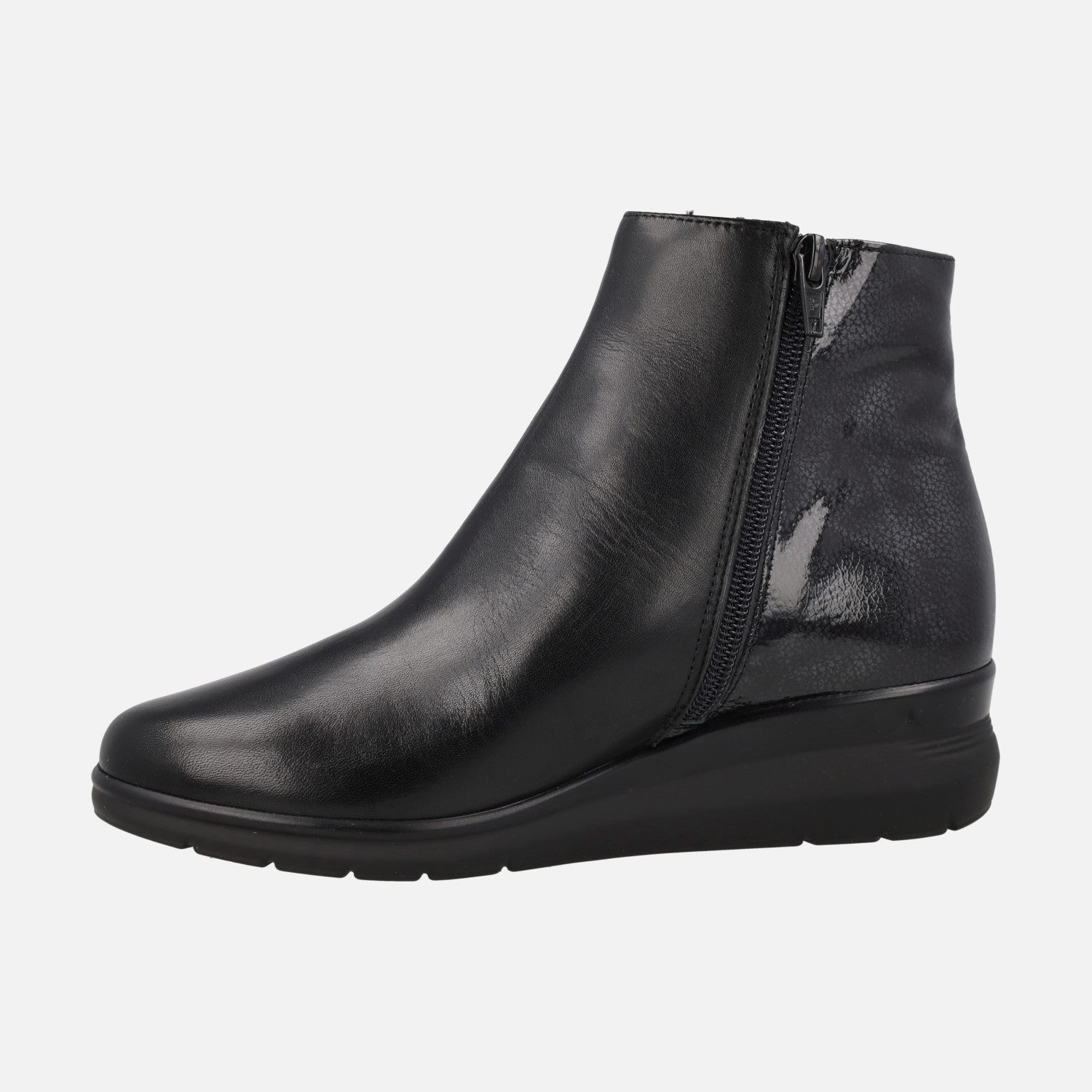 Botines confort para mujer de la marca Pitillos modelo 10736 Negro. Botines combinados en piel lisa y charol con cierre de cremallera en el lado interior. Forro y planta textiles, plantillas extraíbles. Piso sintético con cuña de 4 cm de altura trasera (1,5 cm parte delantera). Caña de 11 cm.