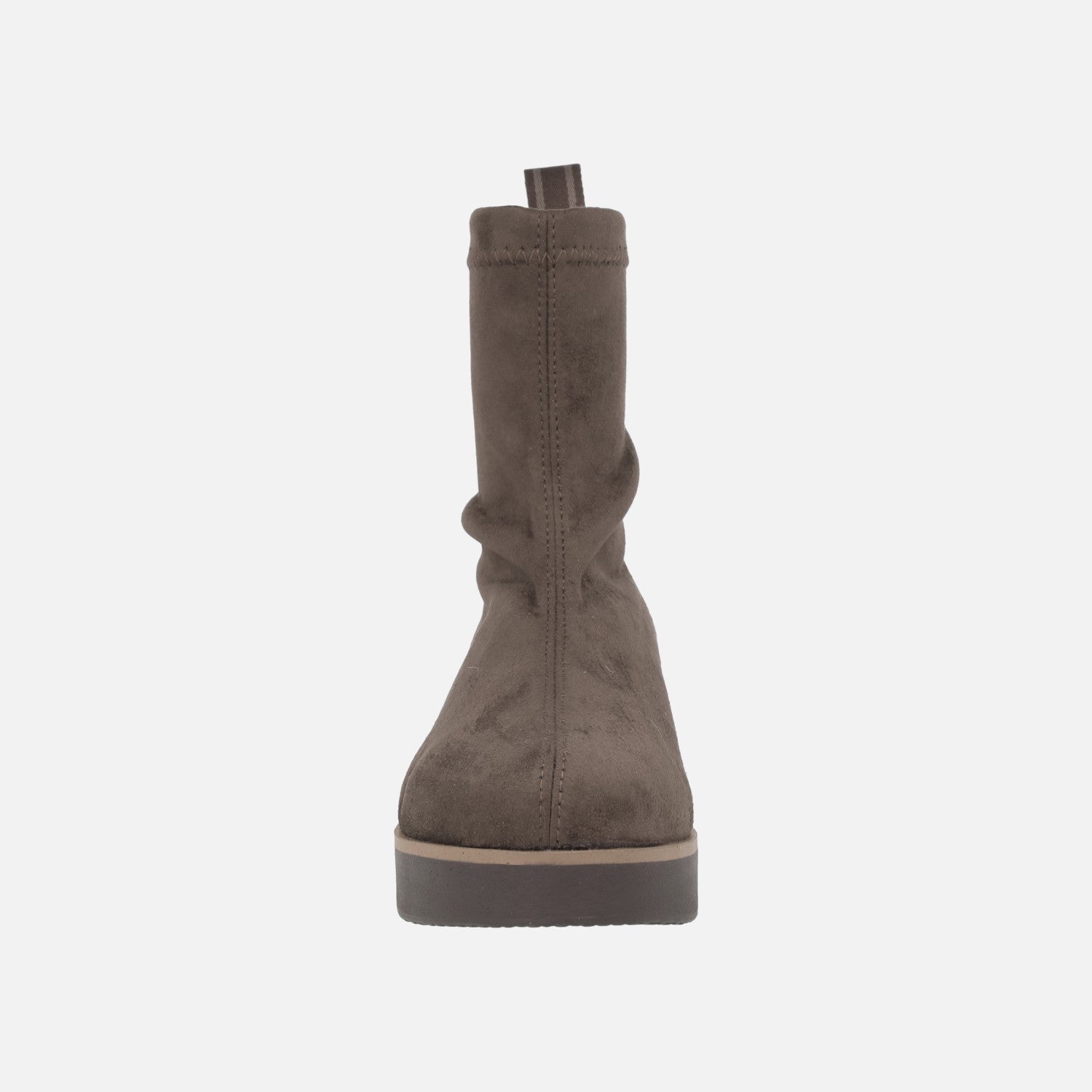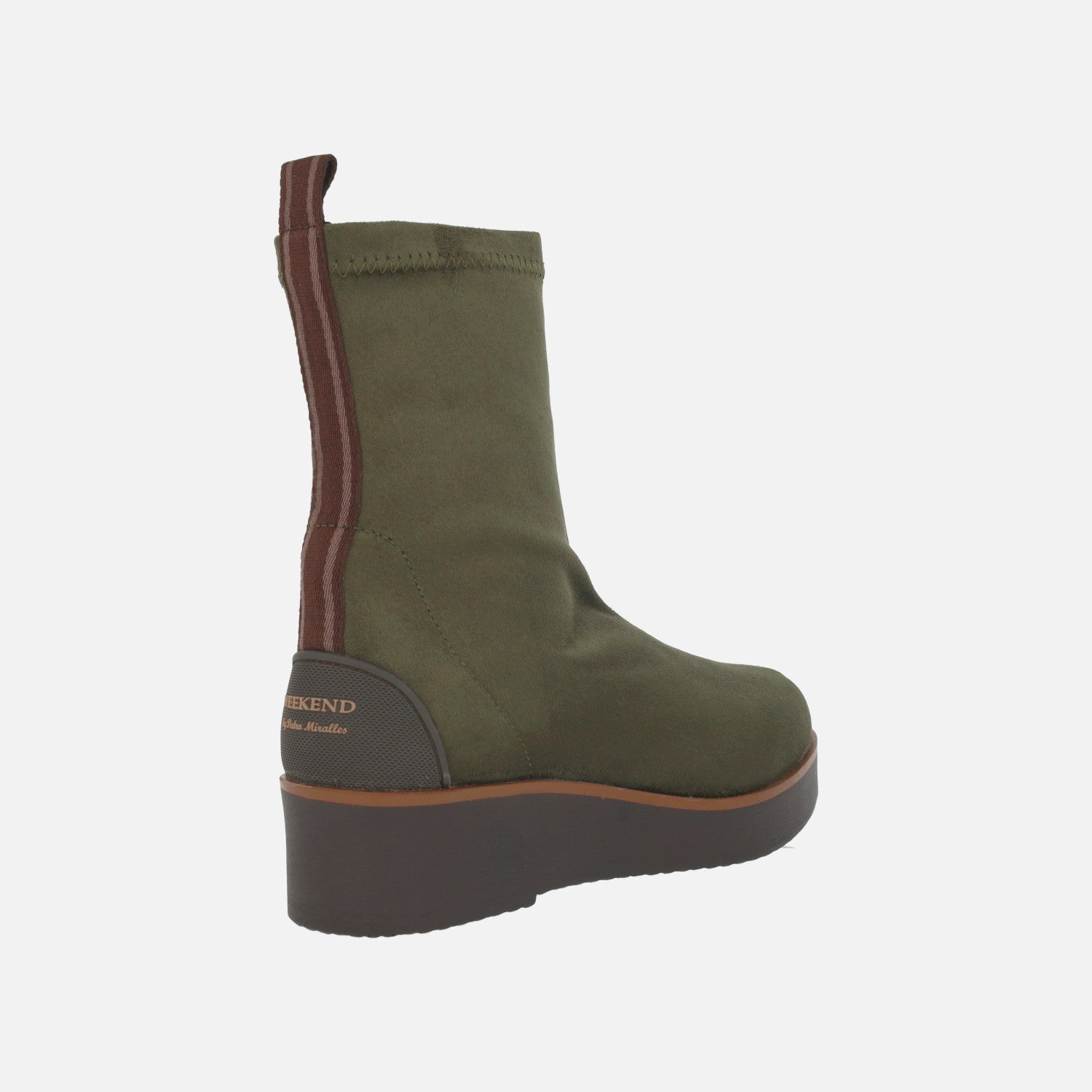 Botines de Pedro Miralles, línea Weekend Burano 27500 Ante strech marino, verde kaki o testa. Botines elaborados en tejido imitación ante con tratamiento Water repellent. Interior textil. Cuña media de caucho, muy ligera, de 4 cm de altura trasera (2,5 cm parte delantera). Altura de caña 16 cm.
