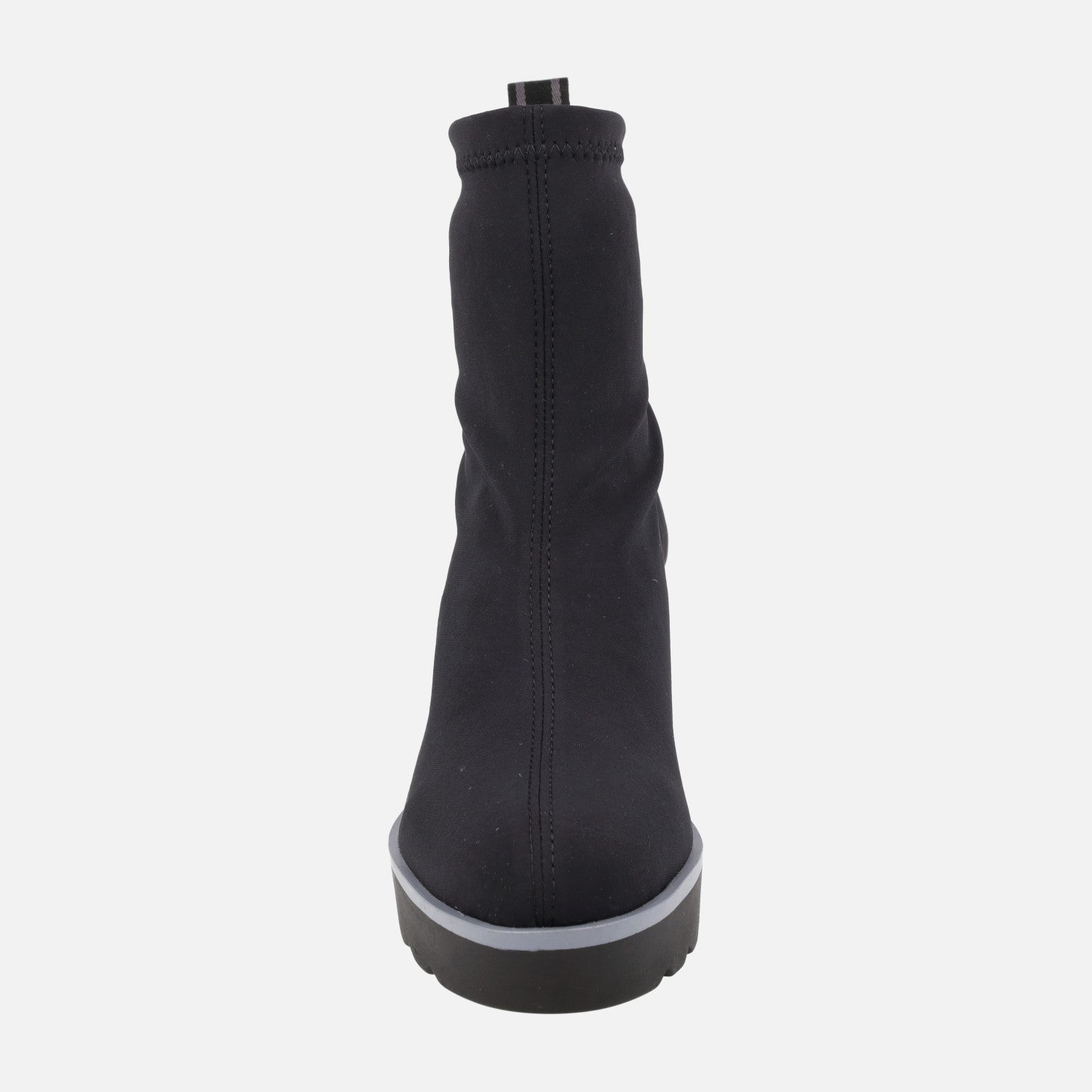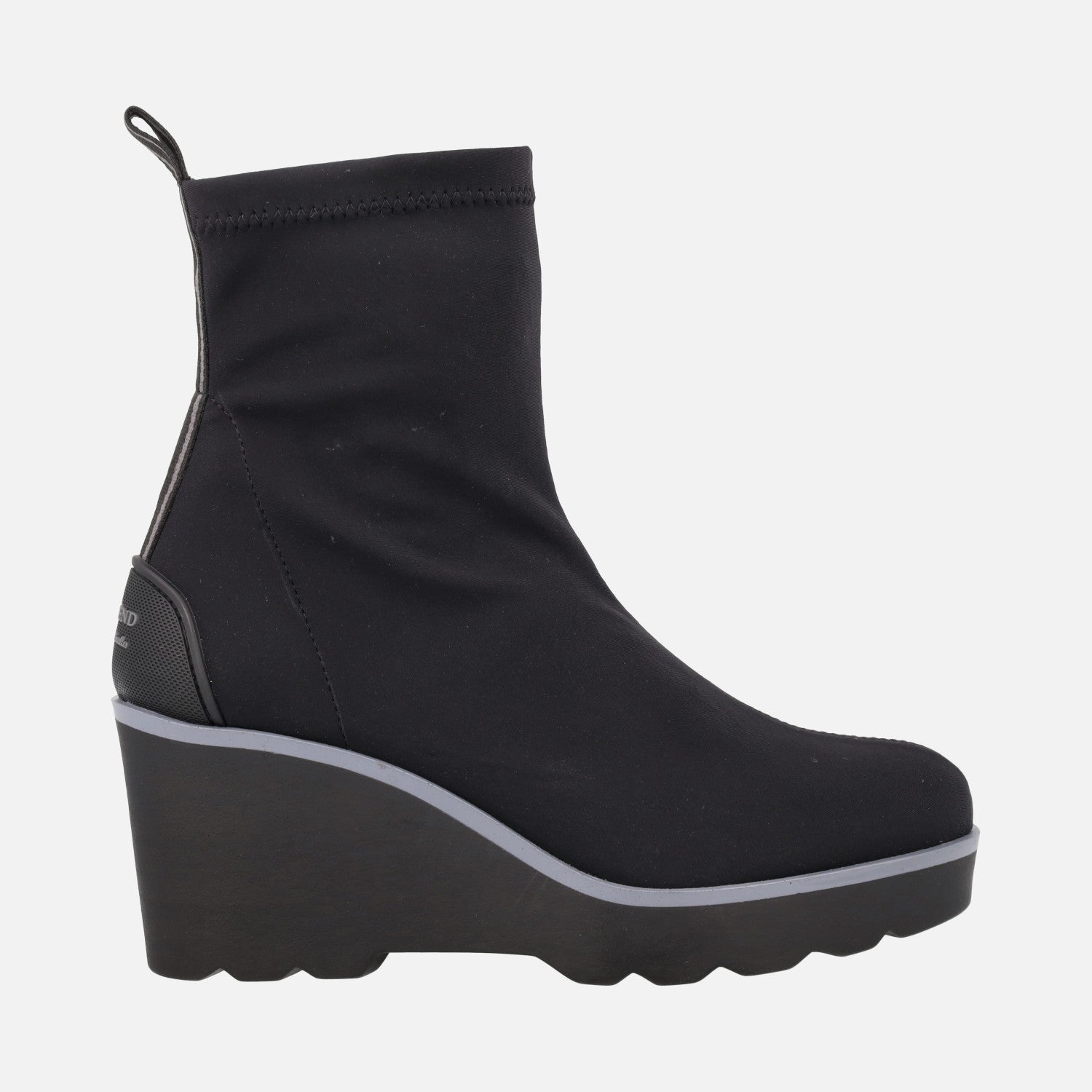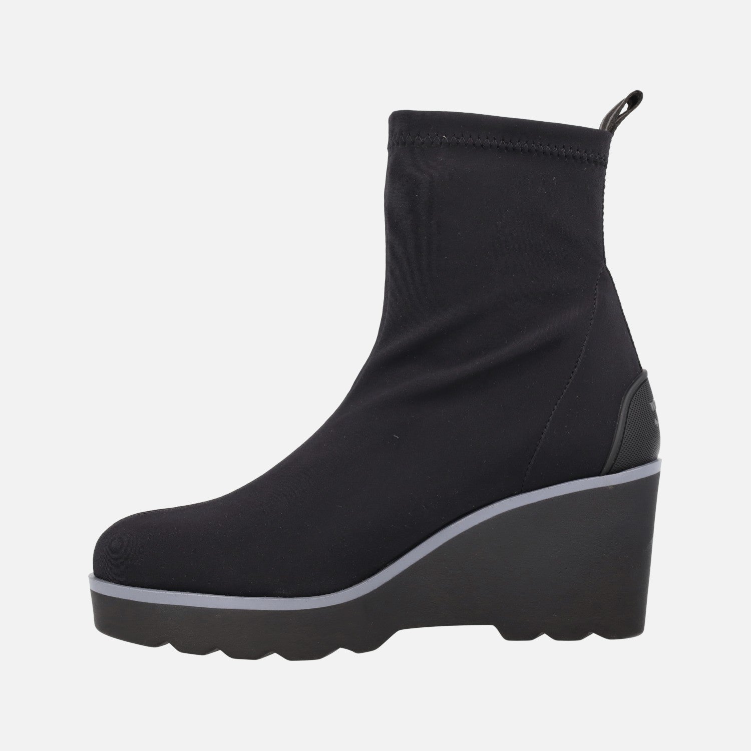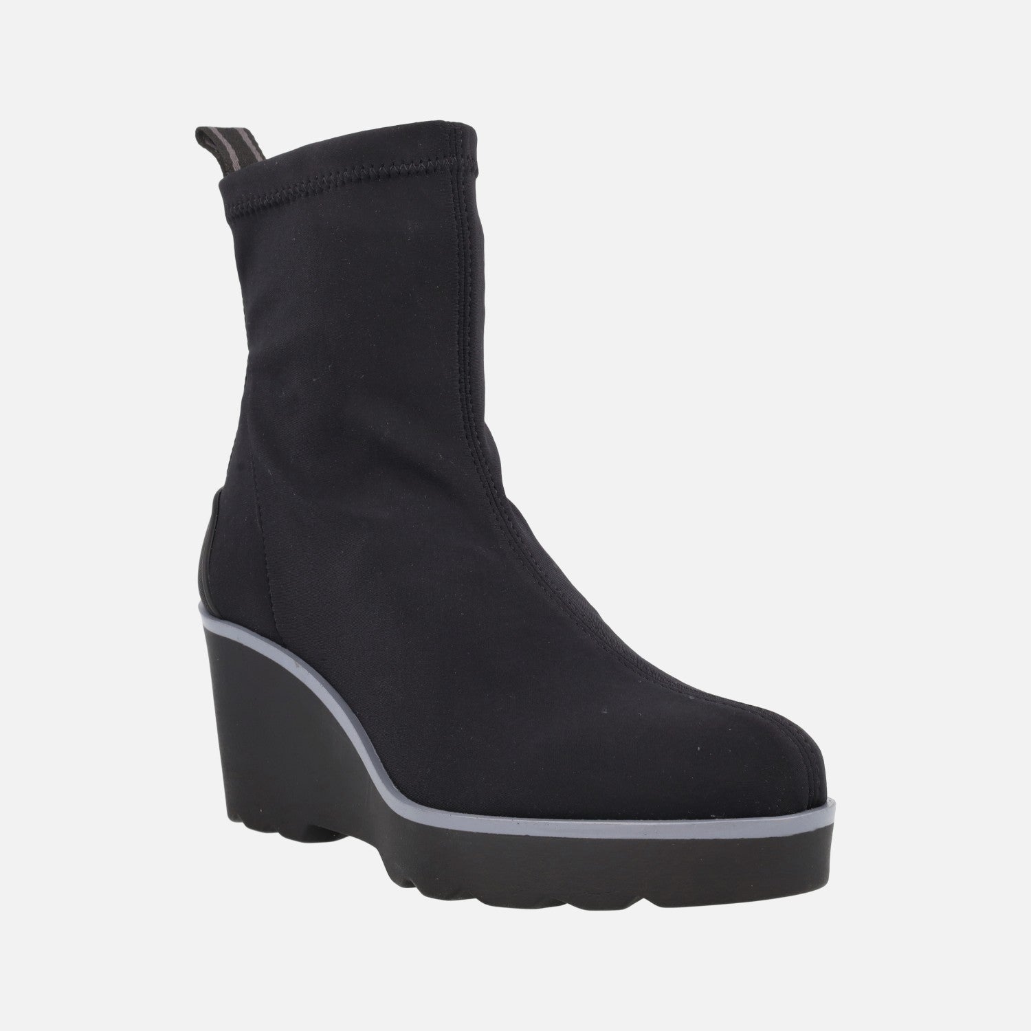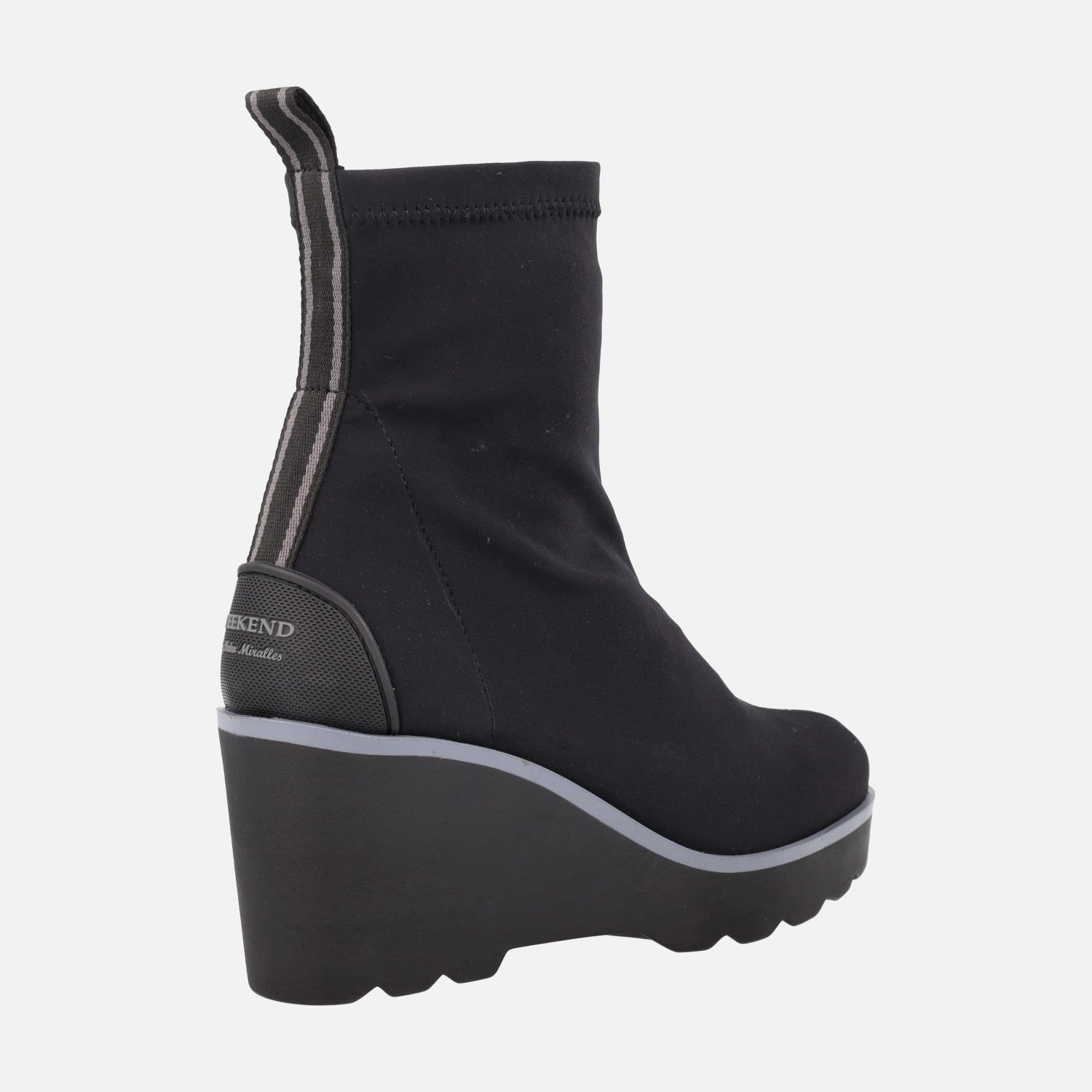 Botines Hita de Pedro Miralles, línea Weekend 27550. Botines elaborados en tejido elástico negro (Amstel negro) con tratamiento Water repelent. Interior textil. Cuña de caucho, muy ligera, de 7,5 cm de altura trasera (2,5 cm plataforma delantera). Altura de caña 14 cm en la parte trasera.