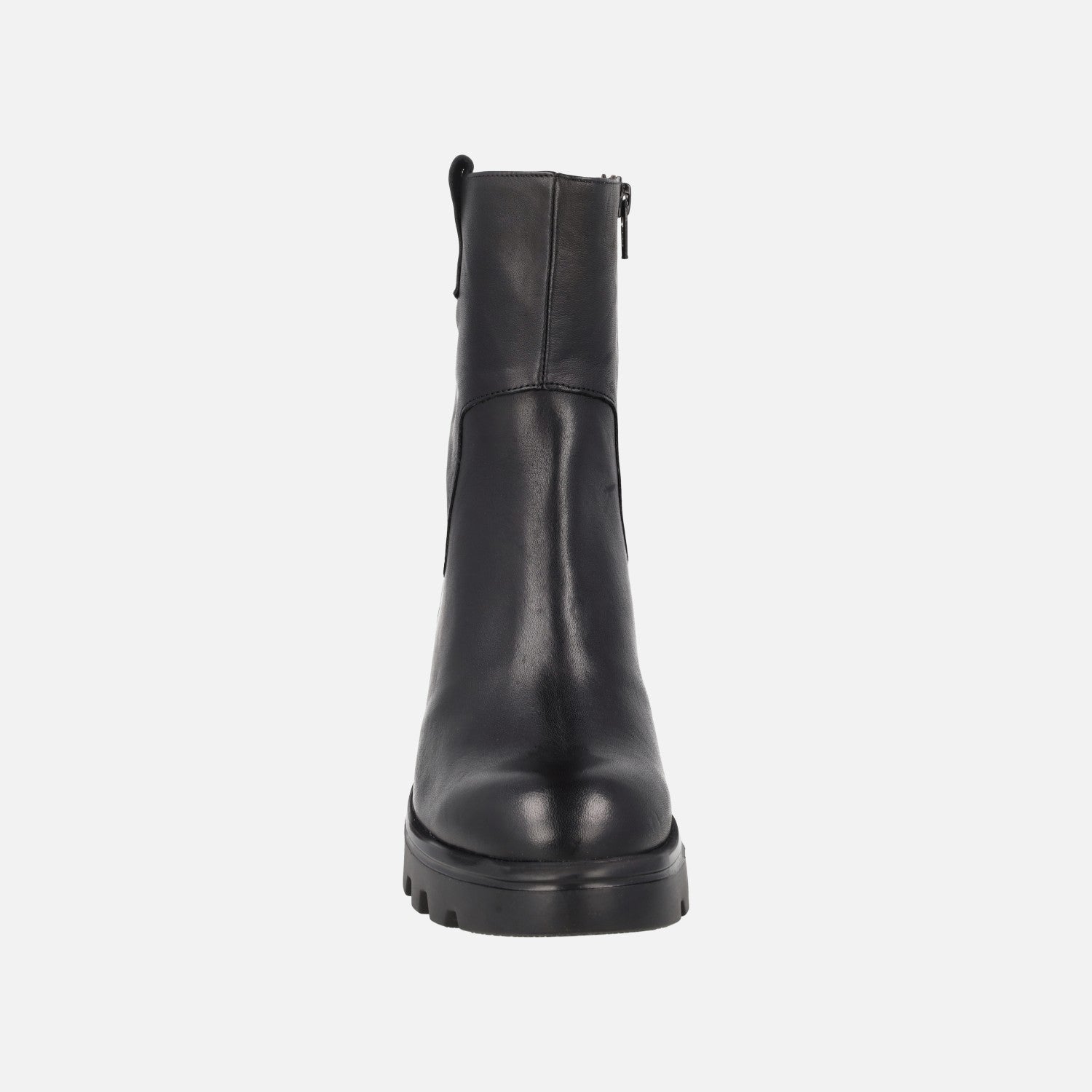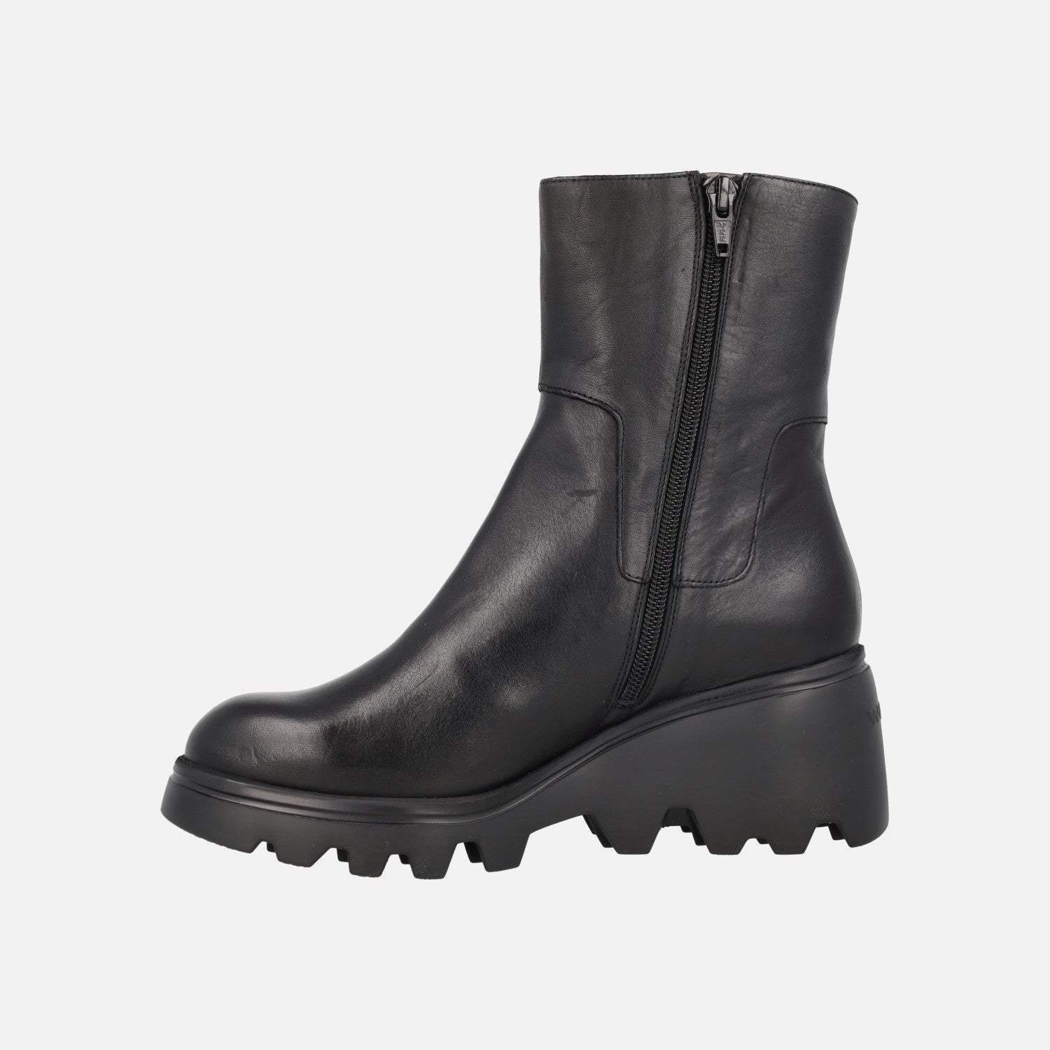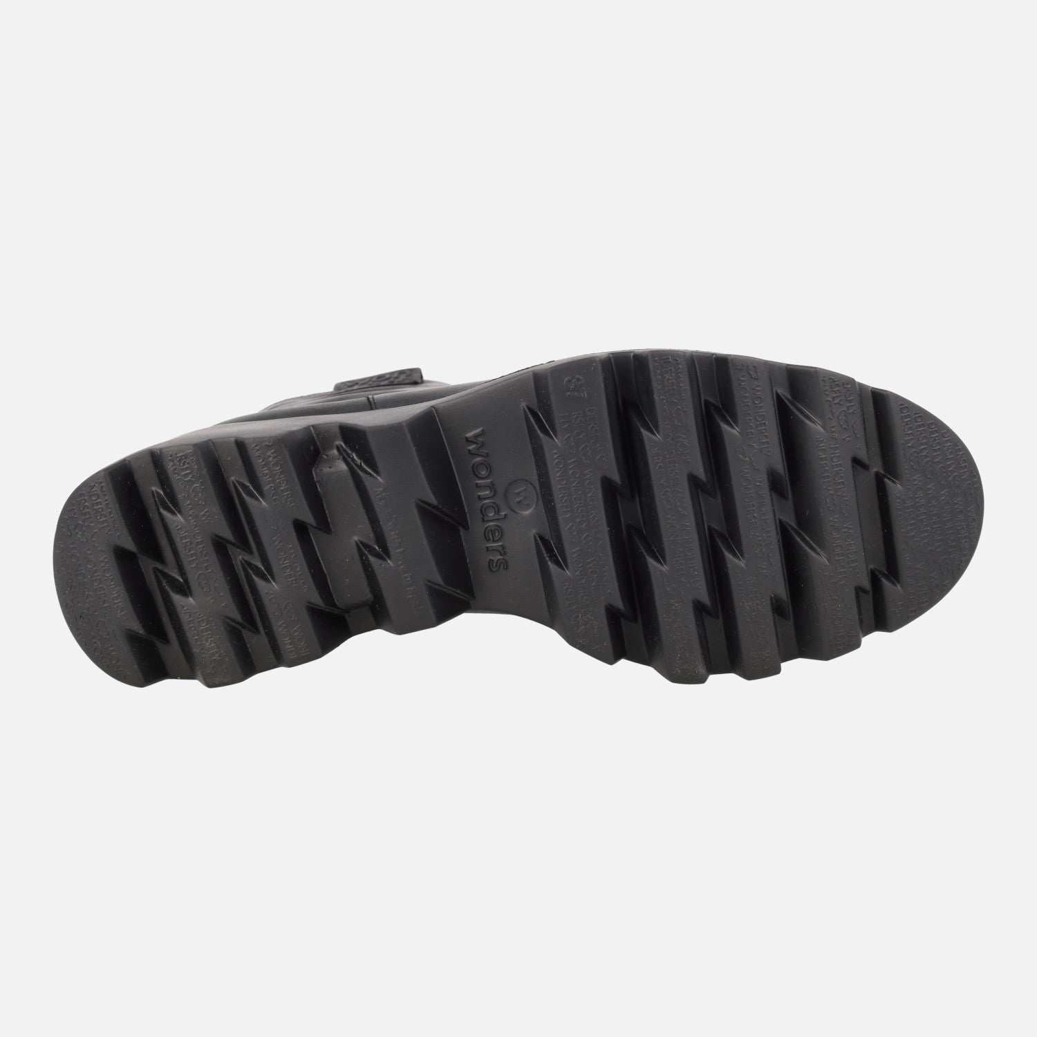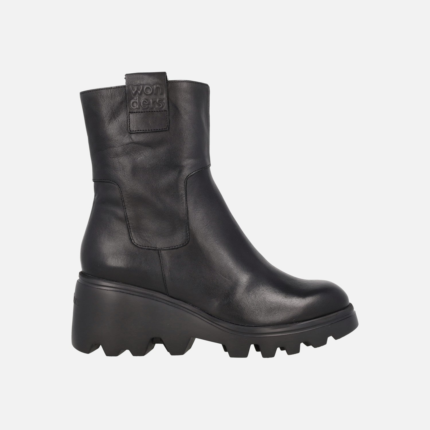 Botines de cuña de la marca Wonders modelo G-7022 Toronto 22 en piel negra. Botines elaborados en piel negra lisa con cierre de cremallera en el lado interior. Forro mixto de piel y tejido. Tirador exterior con logo Wonders. Caña de 17 cm de altura. Cuña FLYGRIP de gran ligereza y agarre, hecha 100% de EVA expandida y con una altura de 6,5 cm en la parte trasera y 2,5 cm de plataforma delantera.