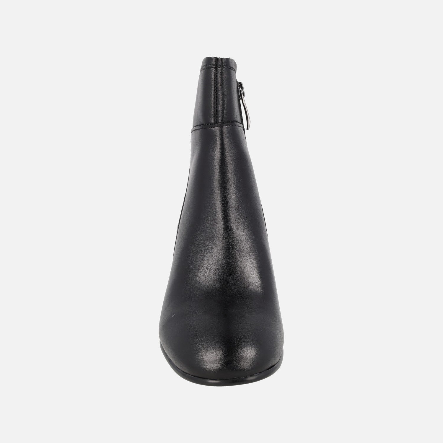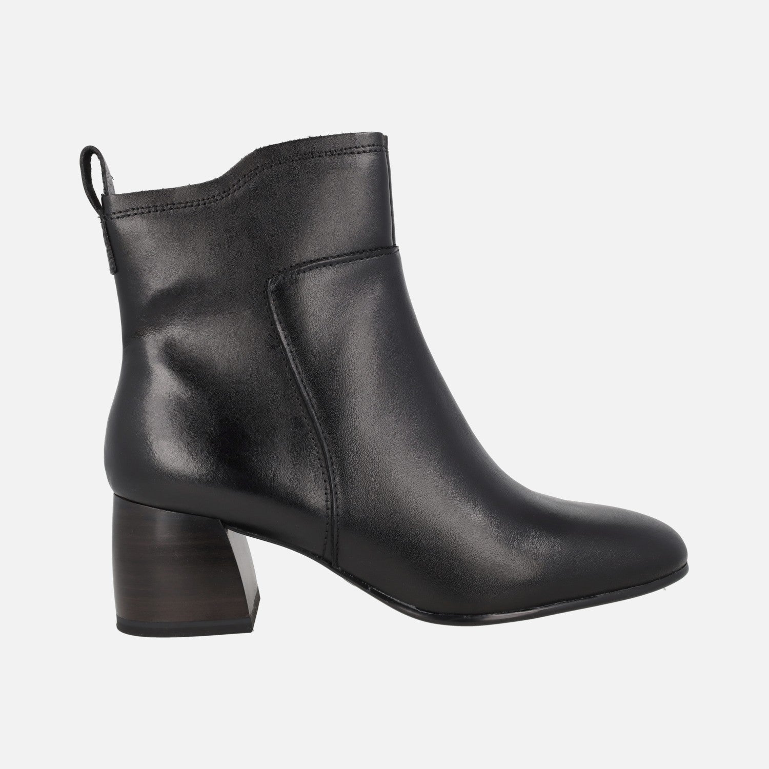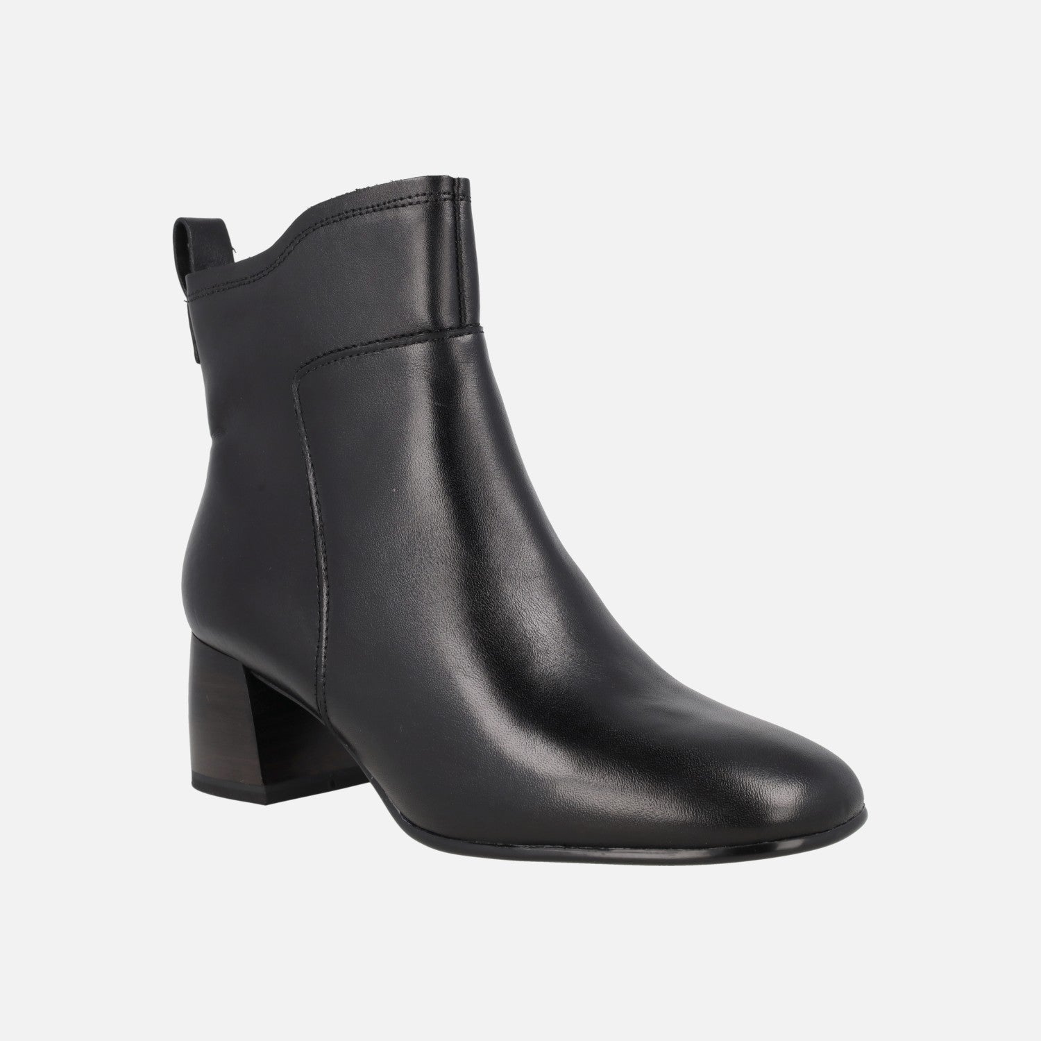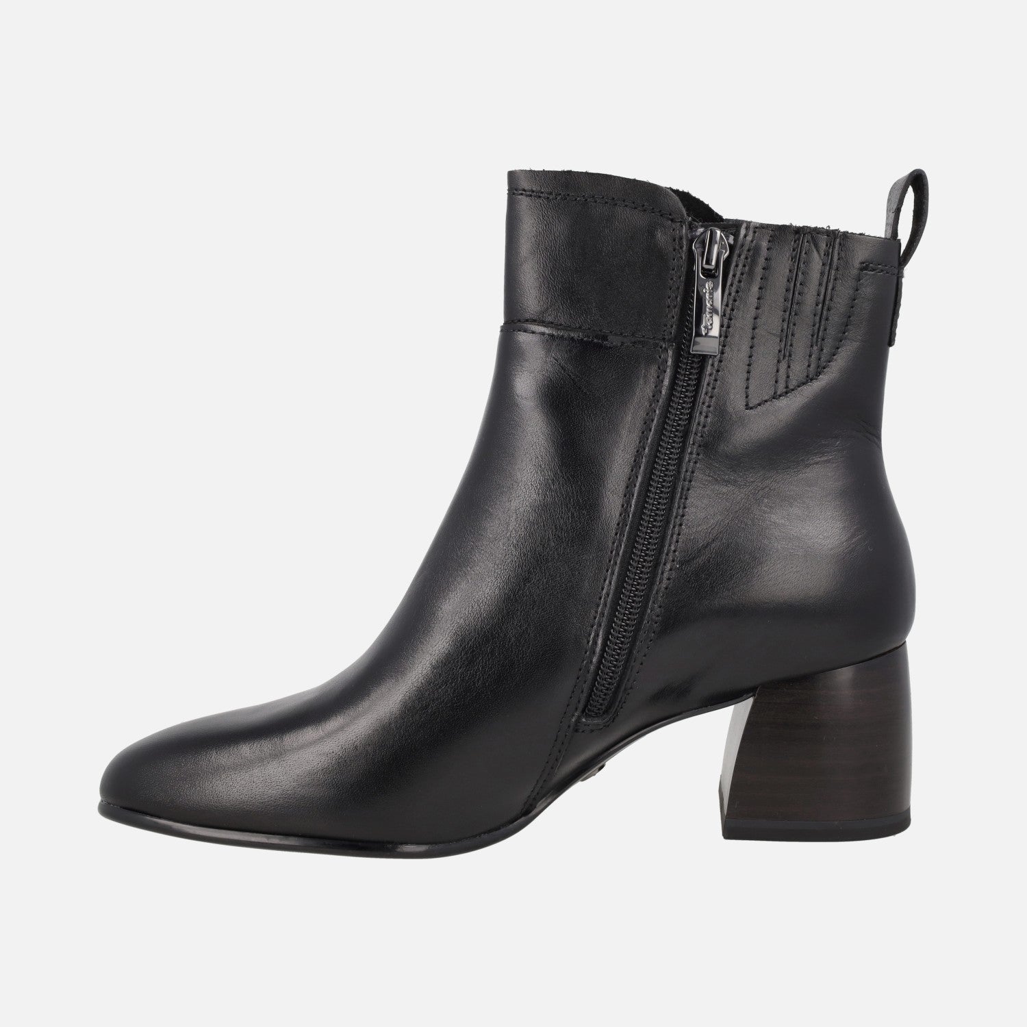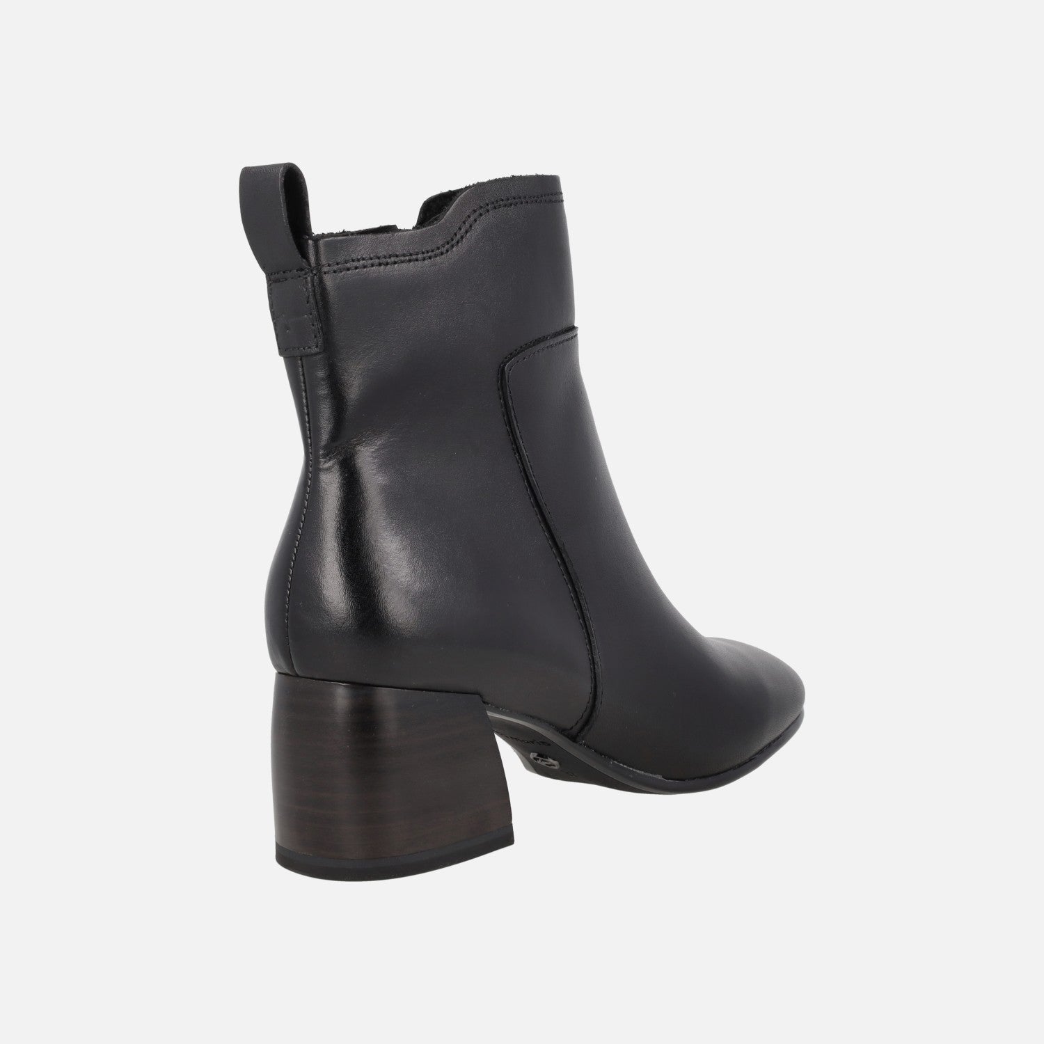 Botines de mujer de la marca alemana Tamaris, modelo I-25323. Fabricados en piel negra, con un tacón moderno y cuadrado de 5,5 cm. de altura. Lleva cierre con cremallera en la parte interior. Puntera cuadrada, que lo hace perfecto para cualquier tipo de situación. El forro es mixto, de textil y otros materiales. Plantilla textil, de espuma viscoelástica muy suave y estable. Piso de goma. La altura de la caña es de 14 cm.