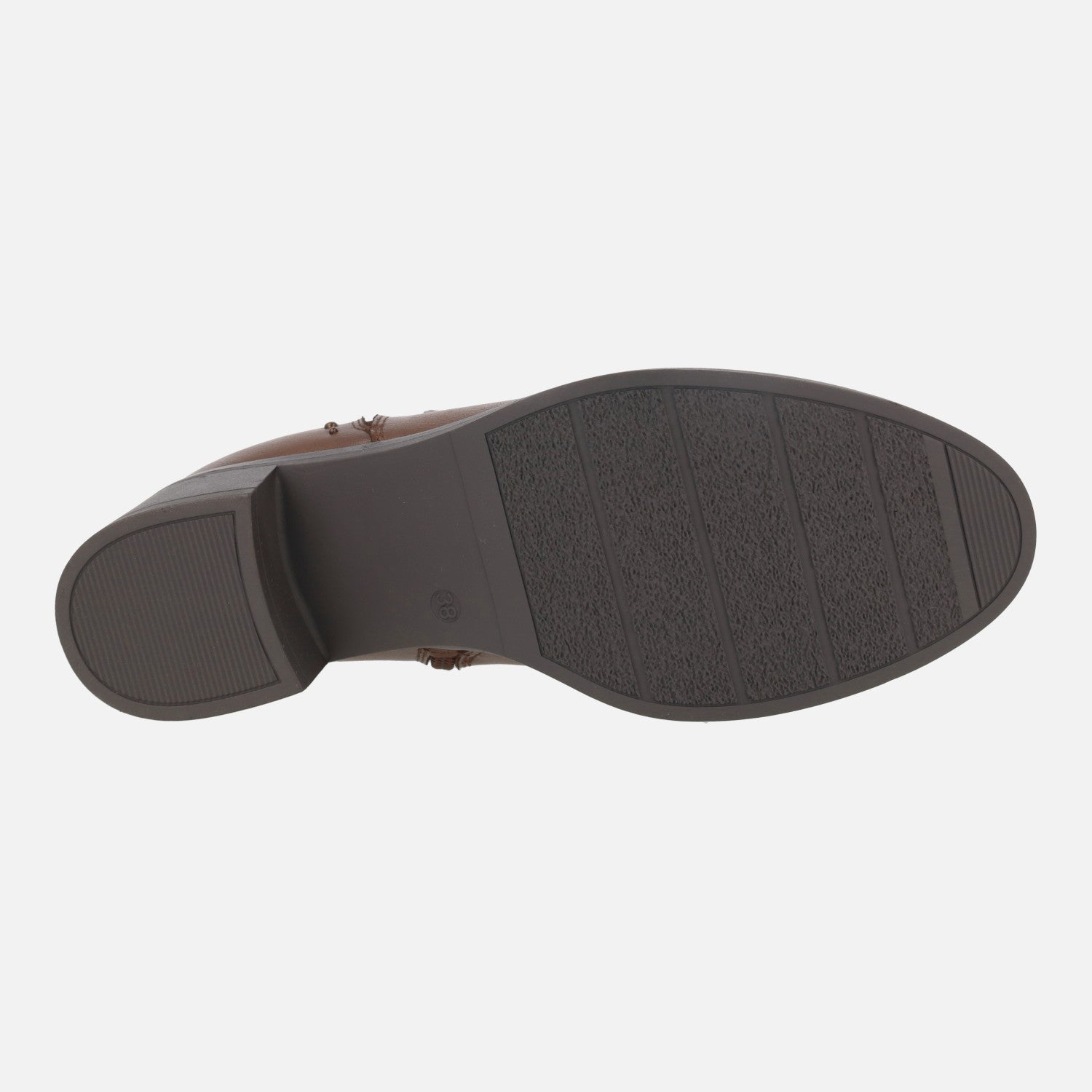 Botines de piel para mujer de la marca Calzazul modelo 5207, disponibles en negro y en marrón. Botines de tacón bajo, elaborados en piel con detalle de tachas metálicas y elástico en el lado exterior. En el interior lleva una cremallera para que sea más facil ponerlos. Interior textil, con plantillas extraíbles. Caña de 9 cm. Tacones de 4,5 cm (1 cm parte delantera).