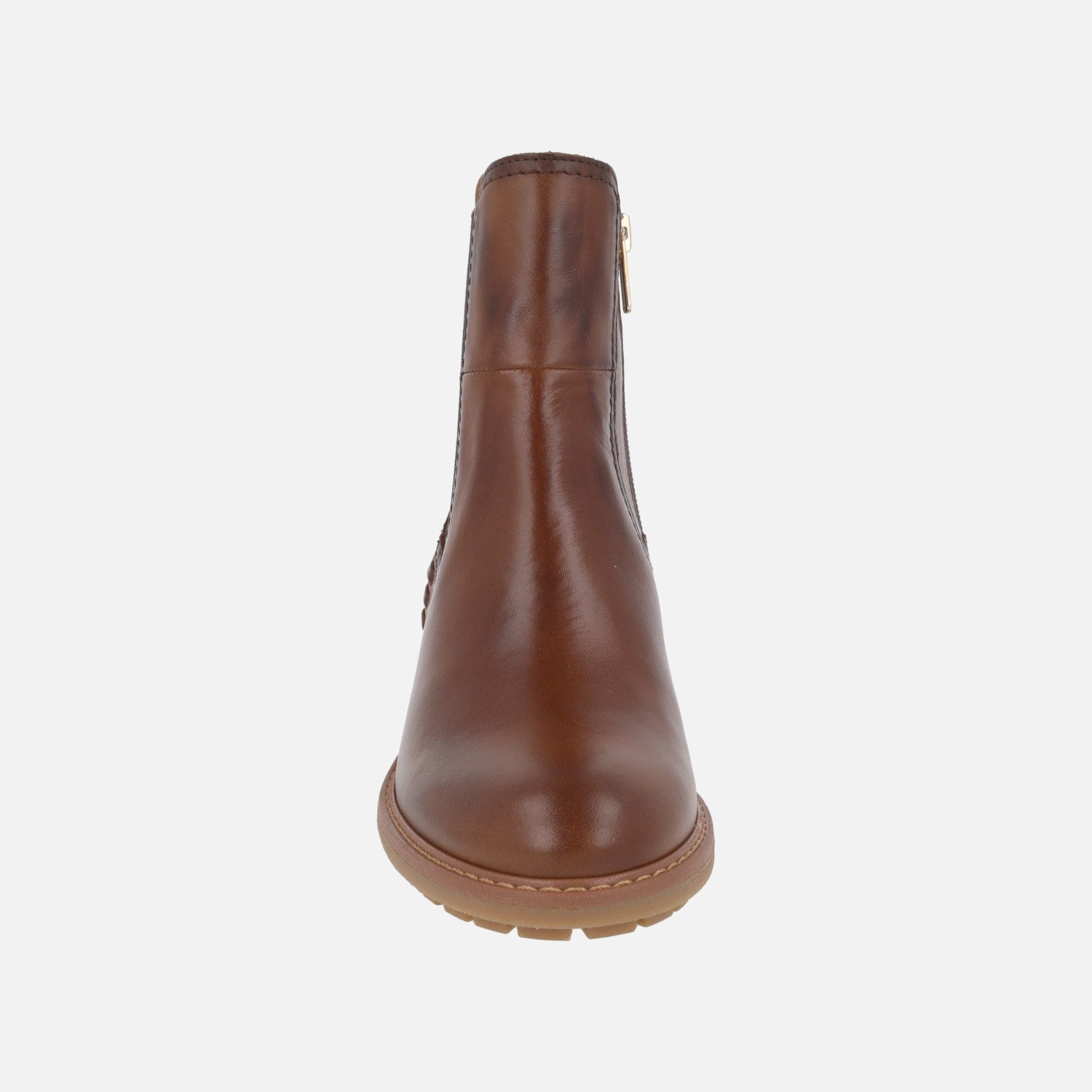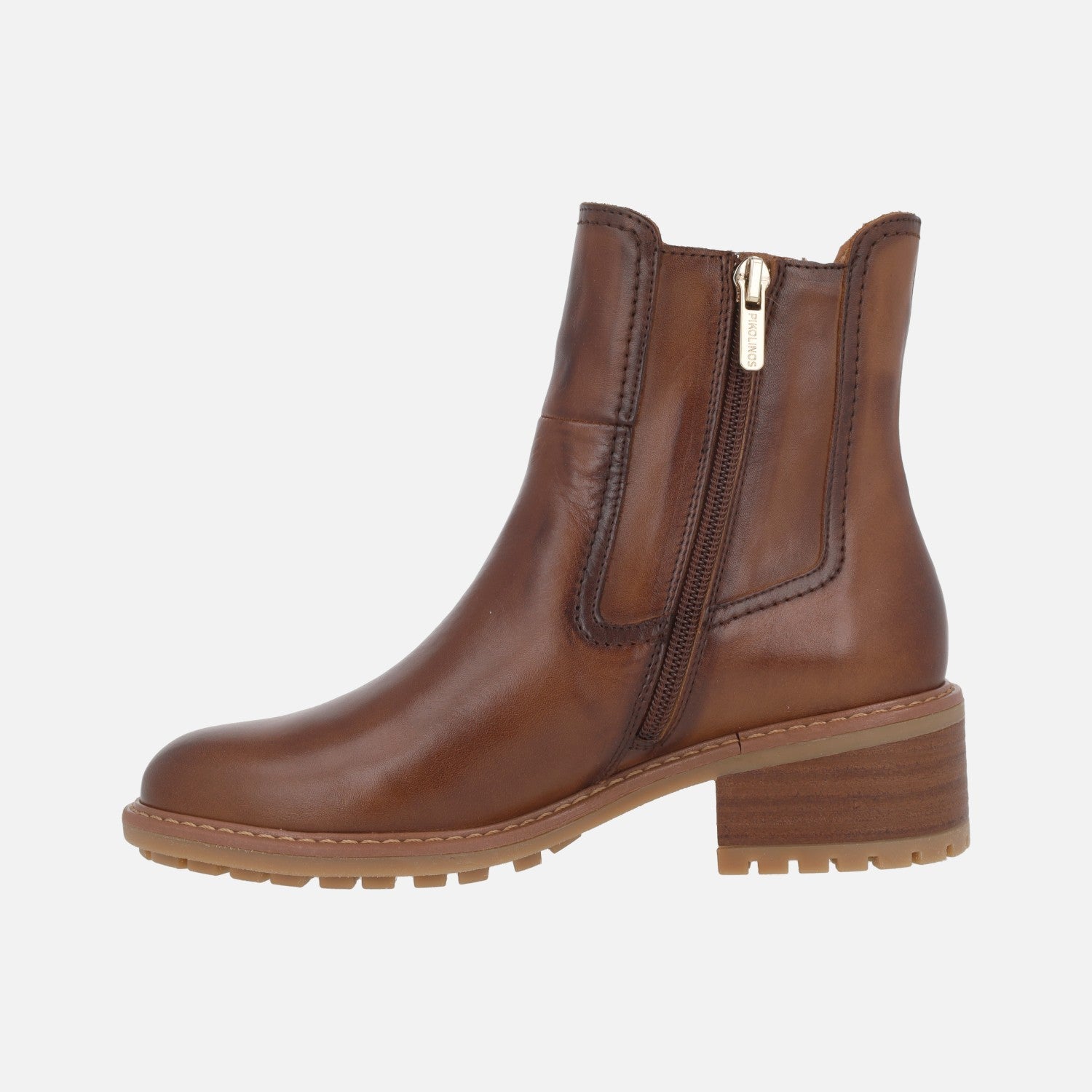 Botines de piel para mujer de la marca Pikolinos modelo Medina W0D-8792 Cuero. Botines marrones de piel con una pieza elástica en el lado exterior imitando el estilo chelsea y cremallera en el lado interior. Forro mixto de tejido y otros materiales. Piso sintético, con tacones de 5 cm de altura (1,5 cm parte delantera). Caña de 15 cm.