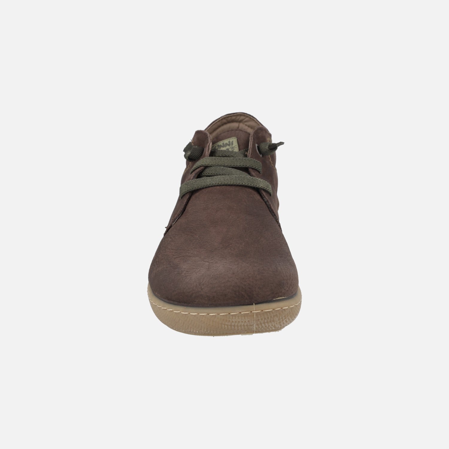 Botines de piel nobuck para hombre modelo IWAKI 016 de la marca Sunni Sabbi. Botines elaborados en piel nobuck y disponibles en verde kaki, marrón oscuro (testa) y cuero, todos con cierre de cordones elásticos. Interior textil con plantillas extraíbles. Piso de goma. Anchos de puntera y muy flexibles. Made in Spain.