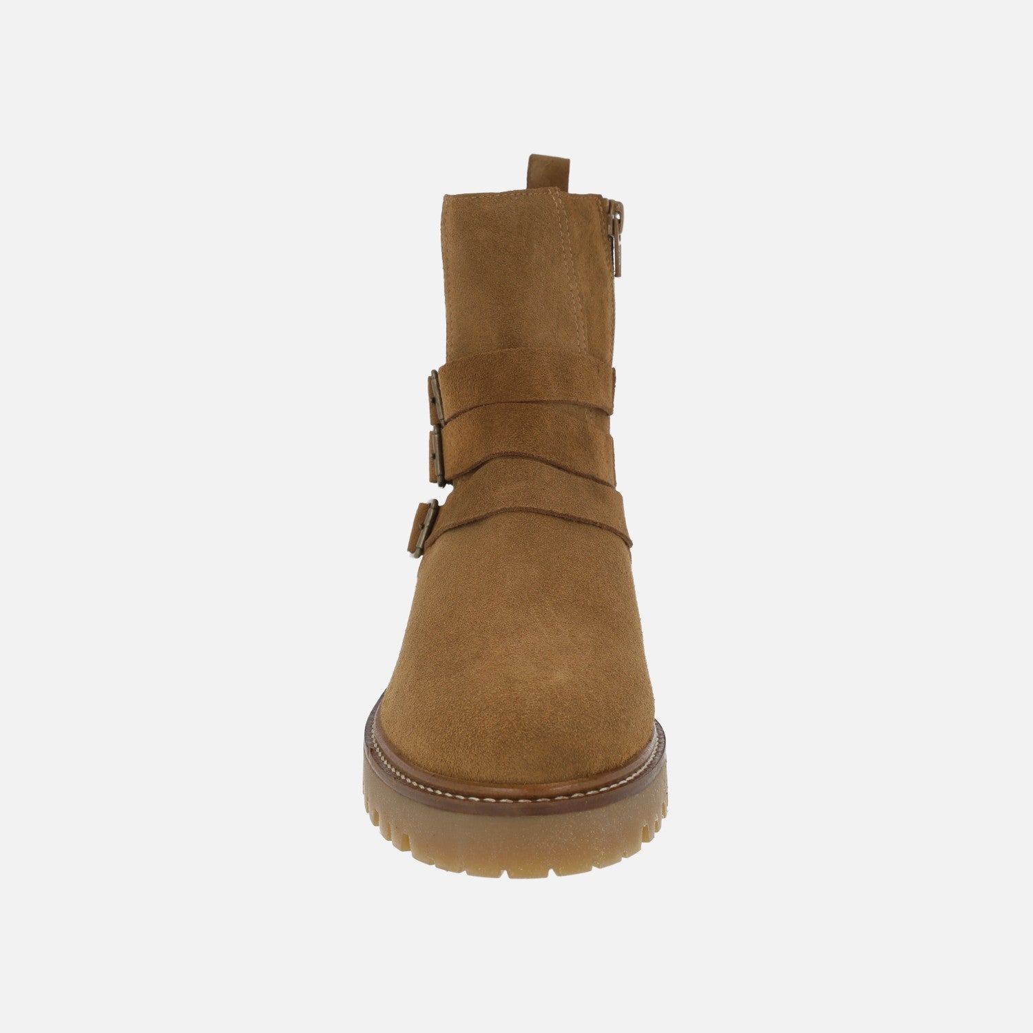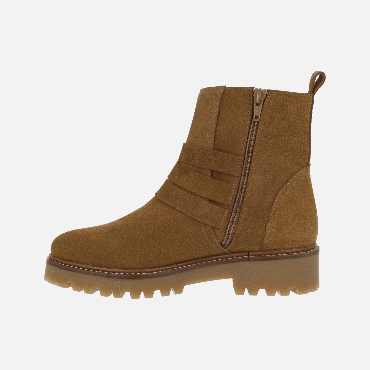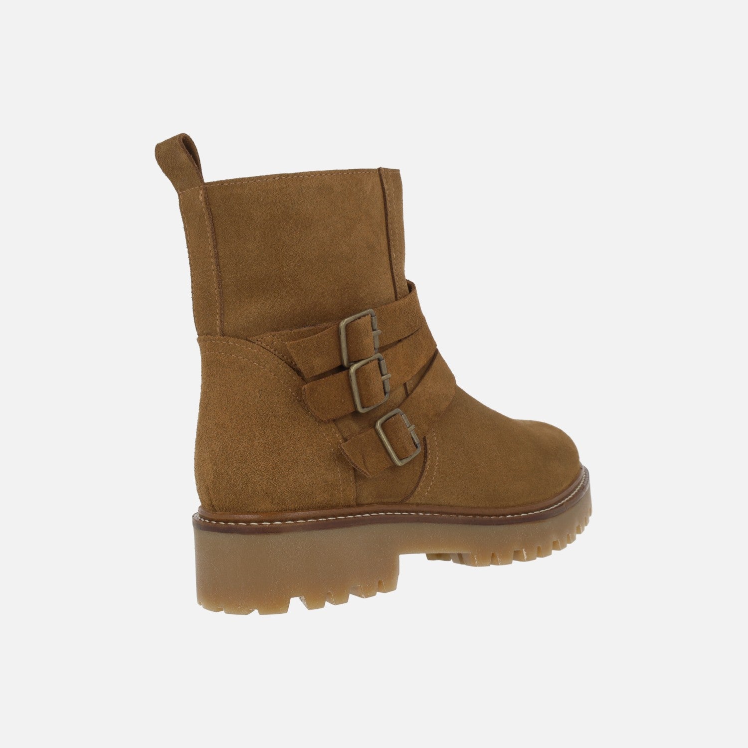 Botines marrones de piel serraje marca Bryan modelo 4345 Antilope. Botines marrones elaborados en serraje con cierre de cremallera en el lado interior. Llevan tres tiras con hebillas color oro viejo, de adorno en el lado exterior. Tirador superior en la parte de atrás para facilitar el calce. Interior textil. Piso estilo track, sintético, con 4 cm de altura trasera (2 cm plataforma delantera). Caña de 14,5 cm.