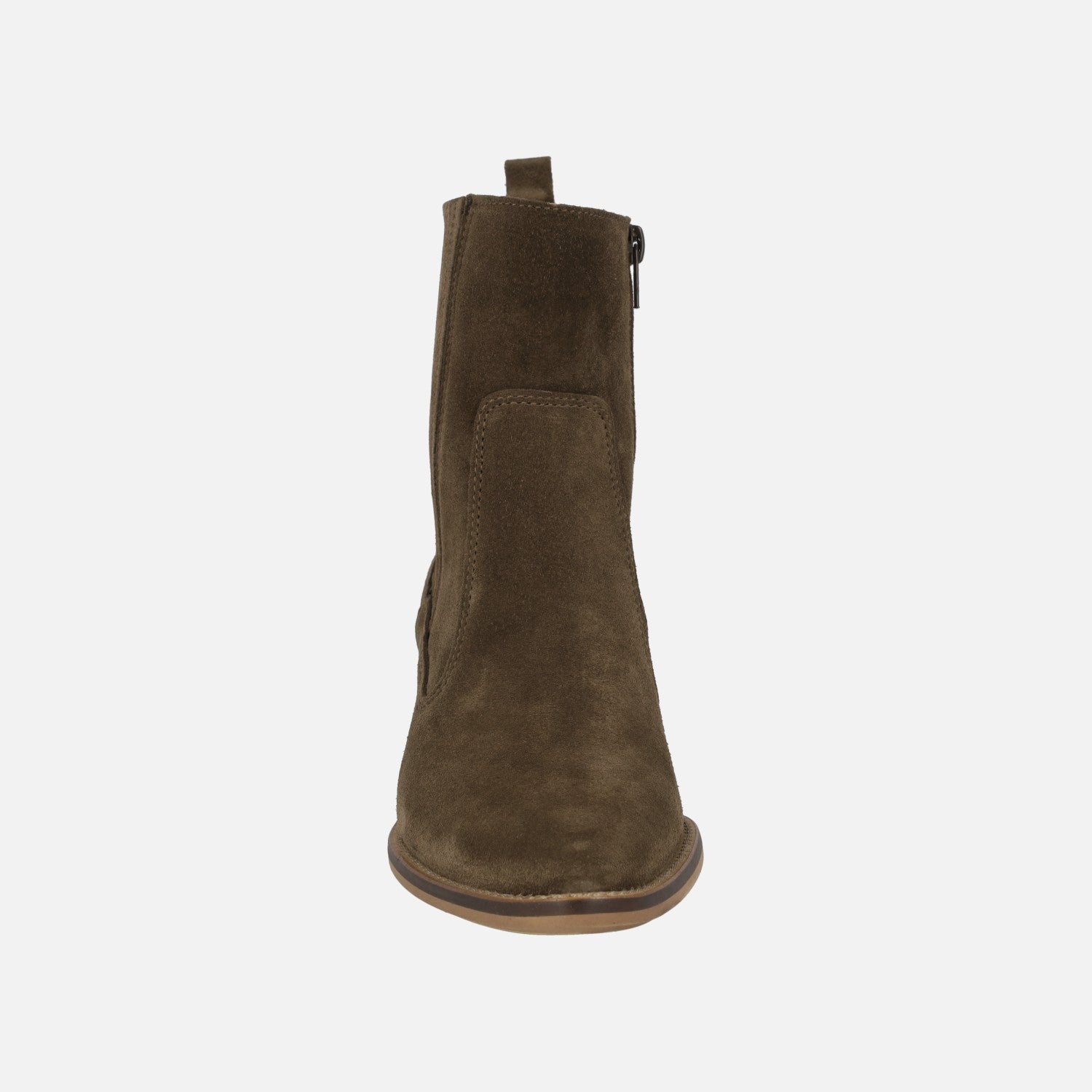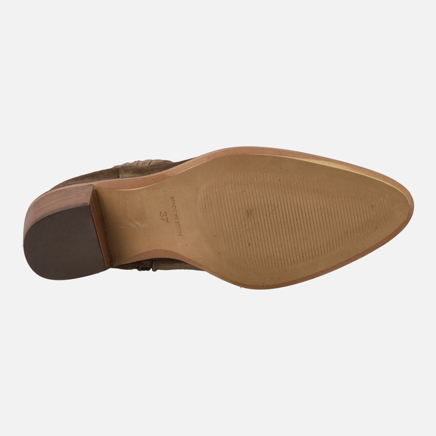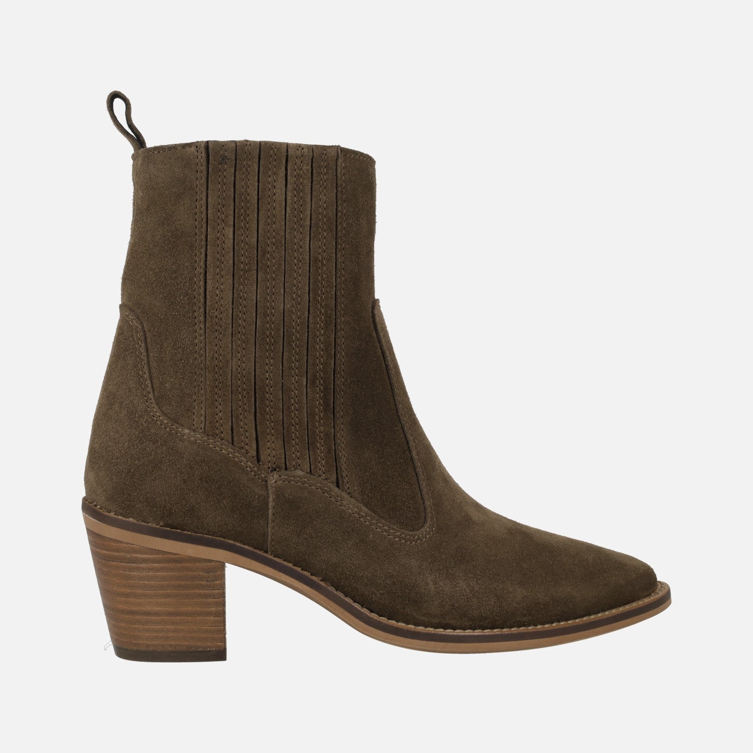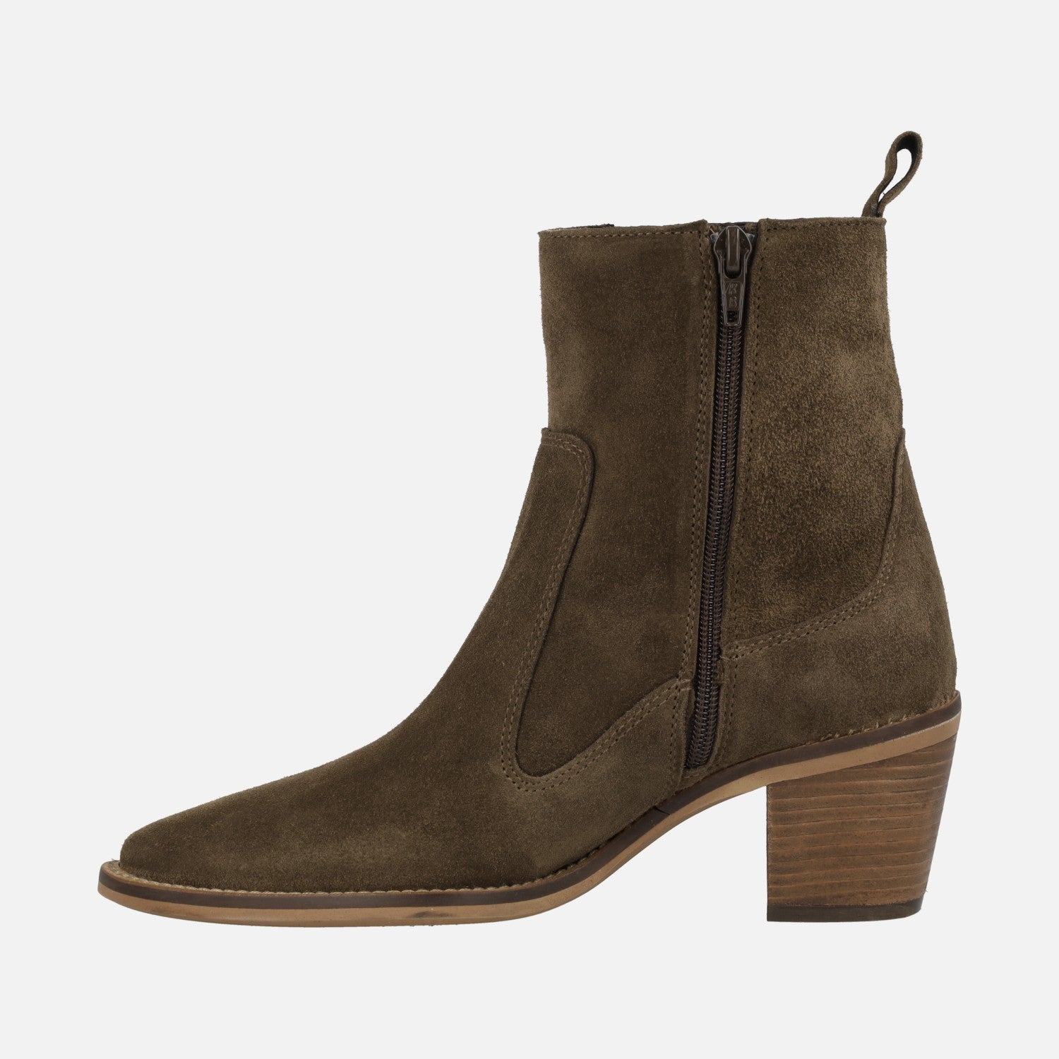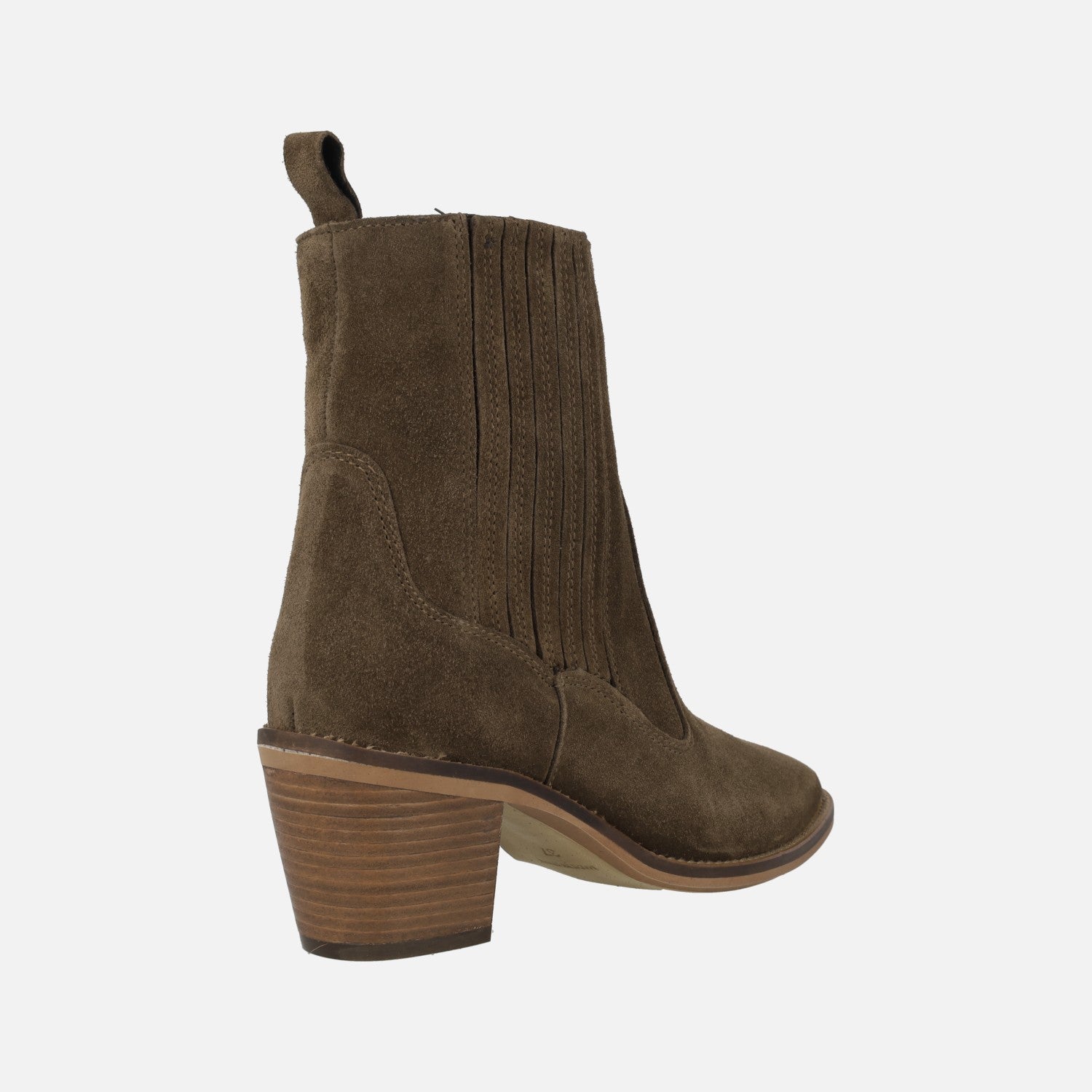 Botines de tacón de la marca Alpe modelo 2581 Nevada, en baby silk Mustang (marrón oscuro chocolate). Botines de horma afilada e inspiración cowboy, con elásticos en el lateral exterior y cierre de cremallera en el lado interior. Detalle de tirador trasero. Botines de piel serraje con interior textil efecto piel. Piso sintético con tacones de 6 cm de altura. Caña de 15 cm. Made in Spain.