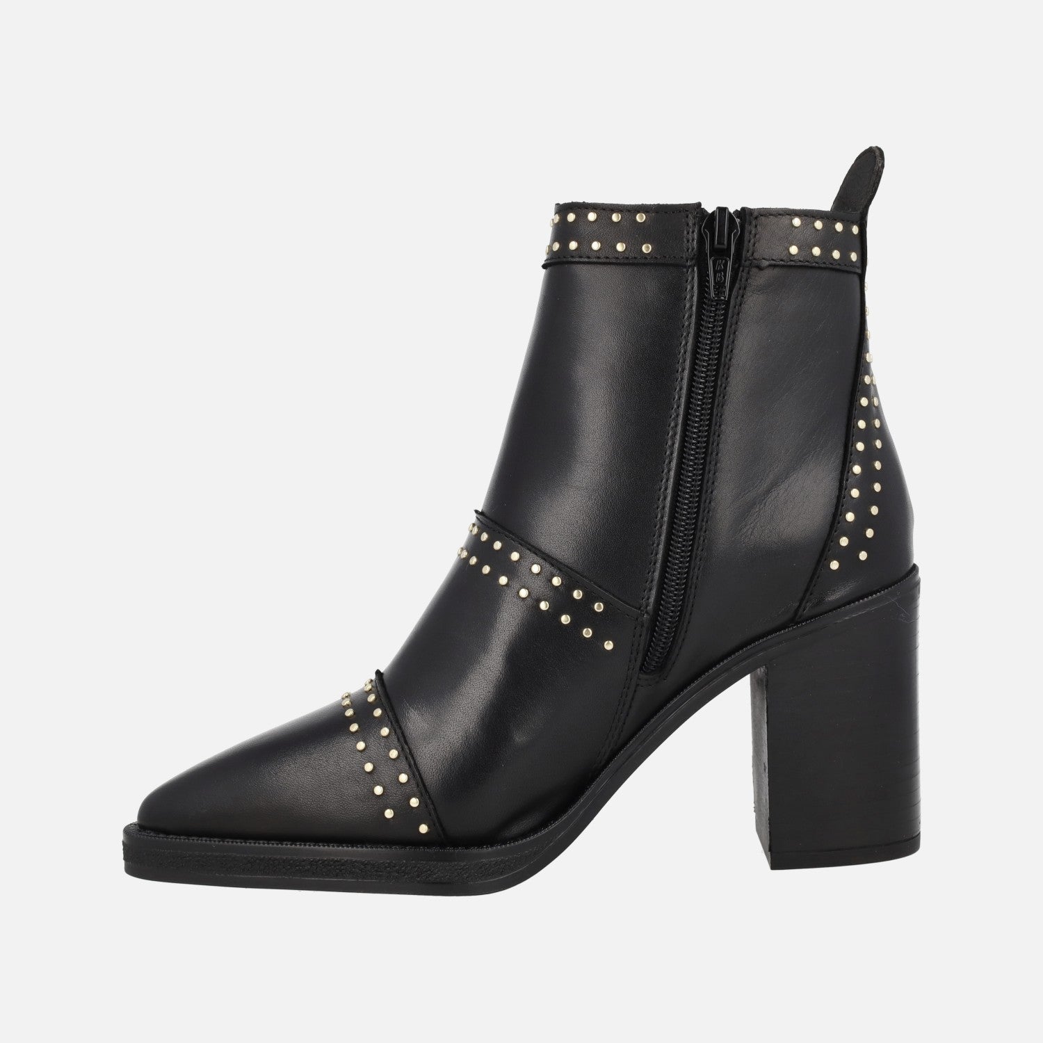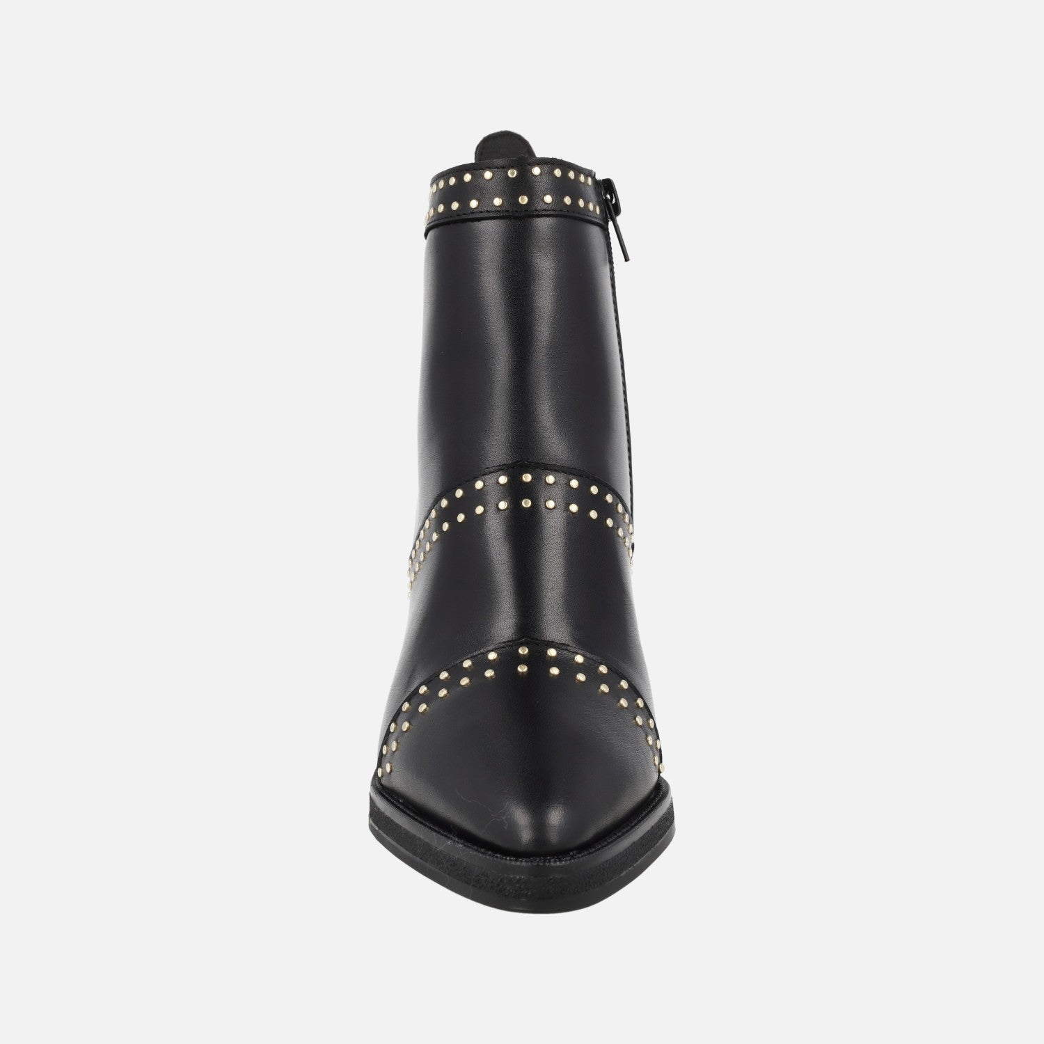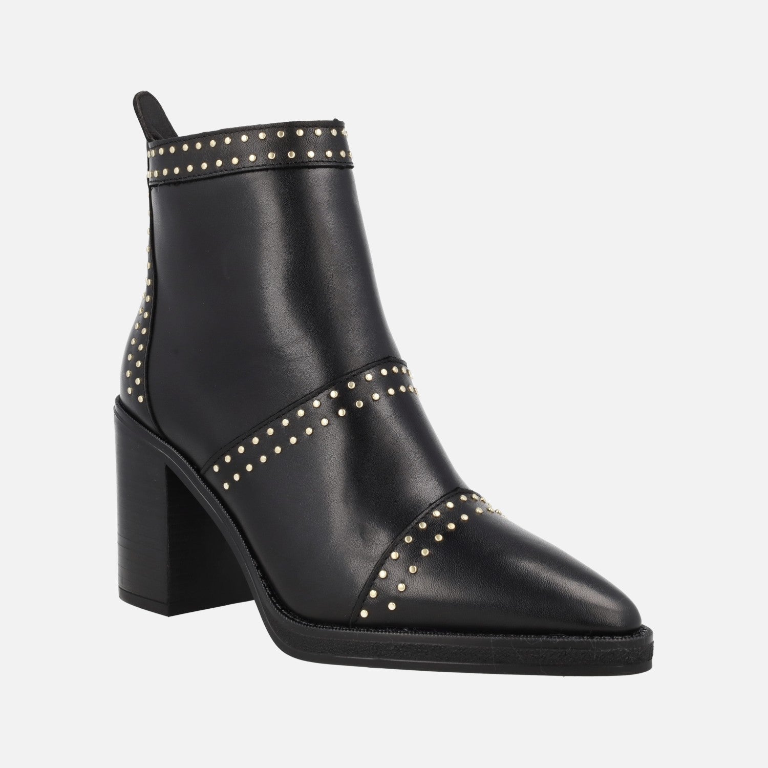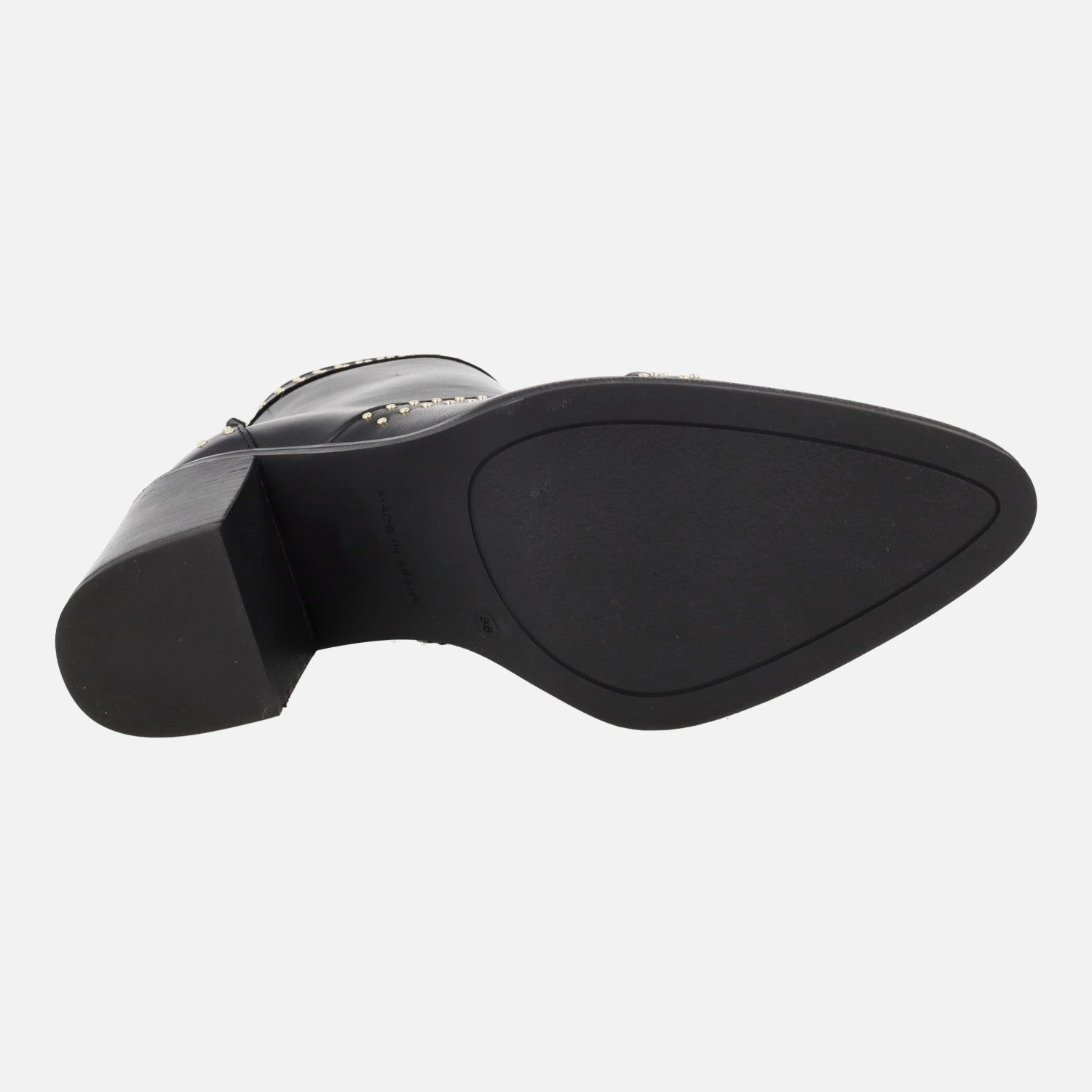 Botines de tacón alto de la marca Alpe, modelo Camden 5449 en Komba negro. Botines negros de piel con detalle de tachas metálicas doradas y cierre de cremallera en el lateral interior. Forro y planta textiles. Caña de 10,5 cm de altura. Tacones anchos y altos, de 8,5 cm. Piso sintético.