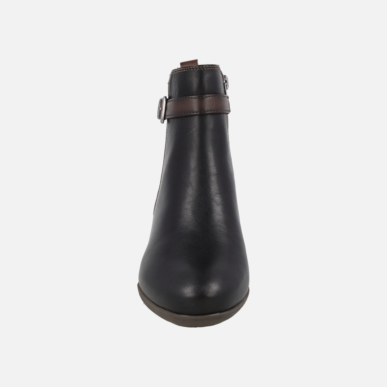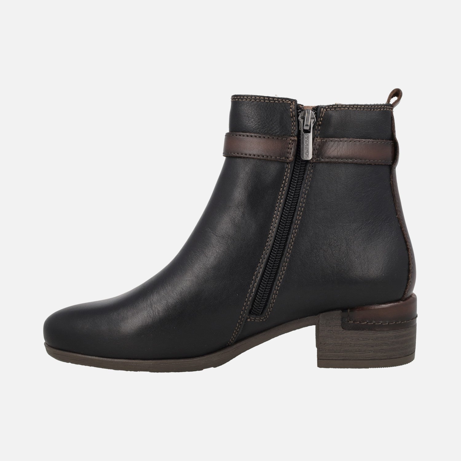 Botines de tacón para mujer de la marca Pikolinos, modelo Málaga W6W-8622C1 disponibles en color negro y en color marrón cuero. Botines de piel con adorno de tira con hebilla en el lado exterior. Cierre de cremallera en el lado interior. Interior mixto en piel y tejido. Piso sintético, con tacones de 4 cm. Caña de aproximadamente 13,5 cm de altura.