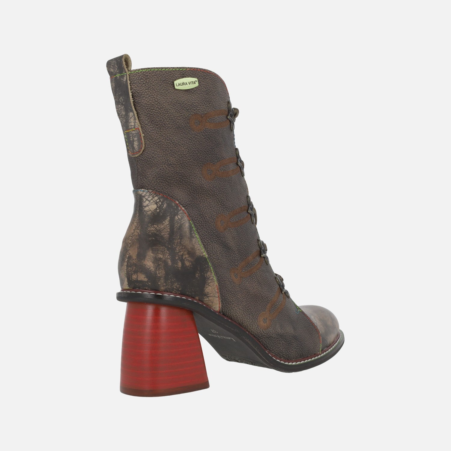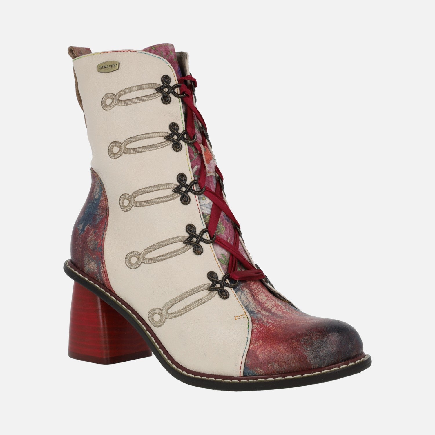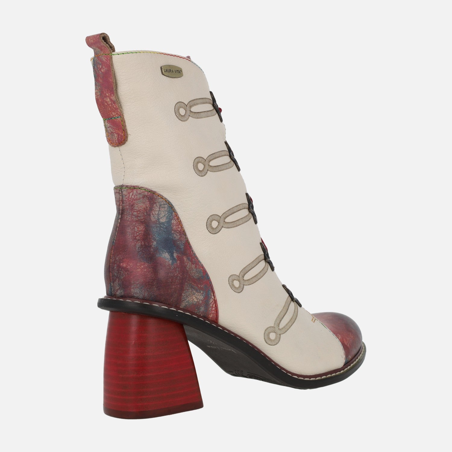 Preciosos botines de tacón de estilo vintage de la marca francesa Laura Vita, modelo Evcao 01E, disponibles en combinado beige con rojo y en antracita (gris). Botines elaborados en combinado de piel y tejido, con cierre de cordones y además cremallera en el lado interior. Caña de 17 cm de altura. Interiores en piel y tejido. Tacones pintados en rojo, con 8 cm de altura. Lengüeta con motivos florales.