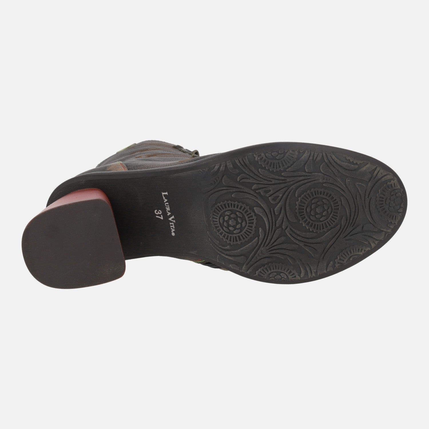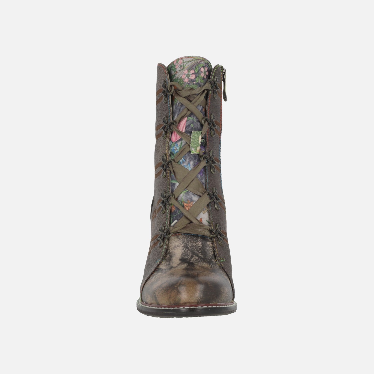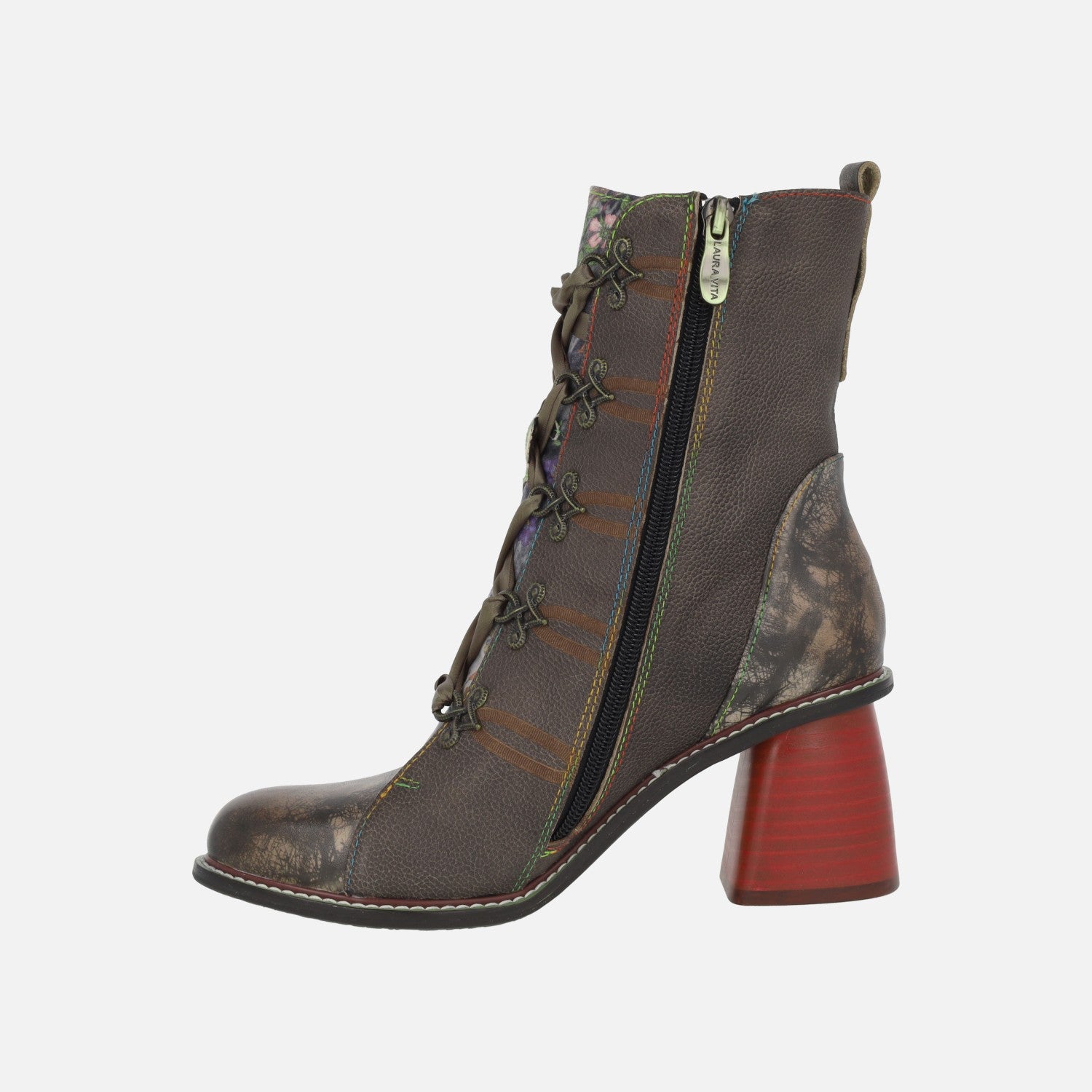 Preciosos botines de tacón de estilo vintage de la marca francesa Laura Vita, modelo Evcao 01E, disponibles en combinado beige con rojo y en antracita (gris). Botines elaborados en combinado de piel y tejido, con cierre de cordones y además cremallera en el lado interior. Caña de 17 cm de altura. Interiores en piel y tejido. Tacones pintados en rojo, con 8 cm de altura. Lengüeta con motivos florales.
