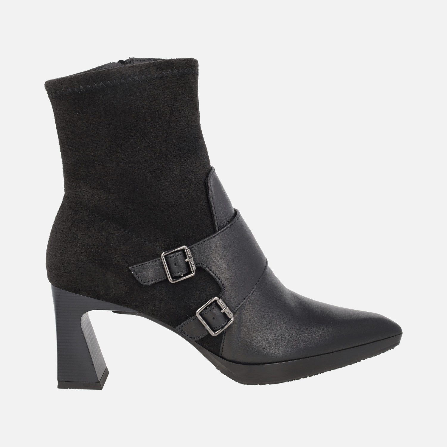 Elegantes botines de tacón de la nueva colección Hispanitas modelo HI254304 disponibles en negro y en avellana. Botines elaborados en piel y tejido elástico imitando ante, con cierre de cremallera en el lado interior. Adorno de hebillas. Puntera afilada. Interior textil. Tacones de 7 cm de altura (1,5 cm parte delantera). Caña de aproximadamente 15 cm de altura. Made in Spain.