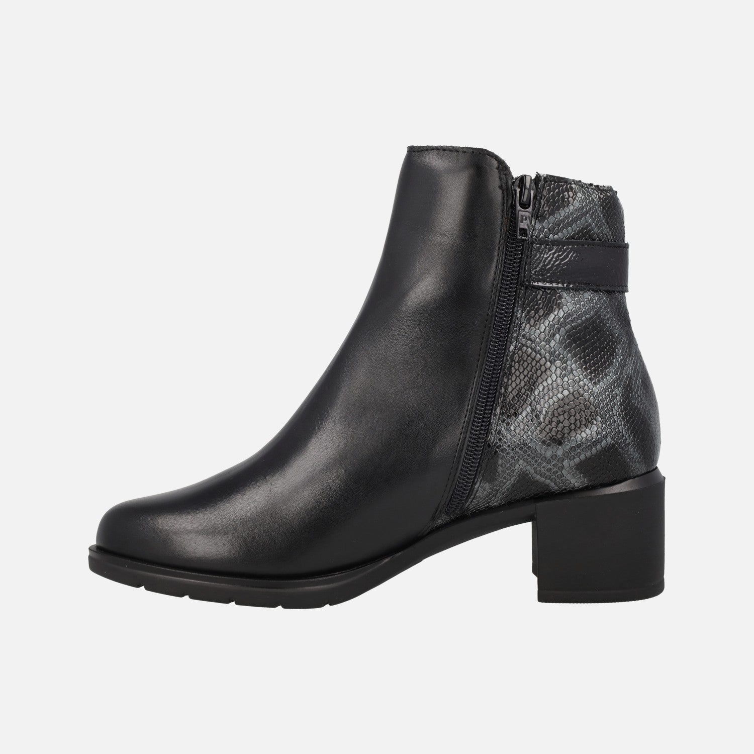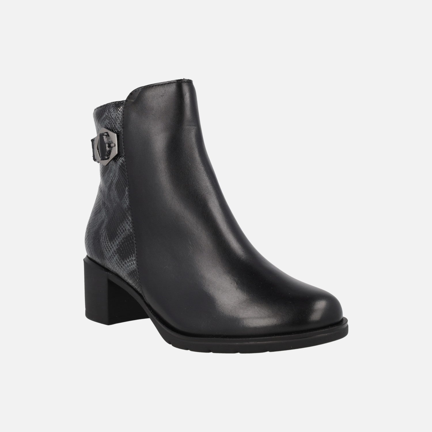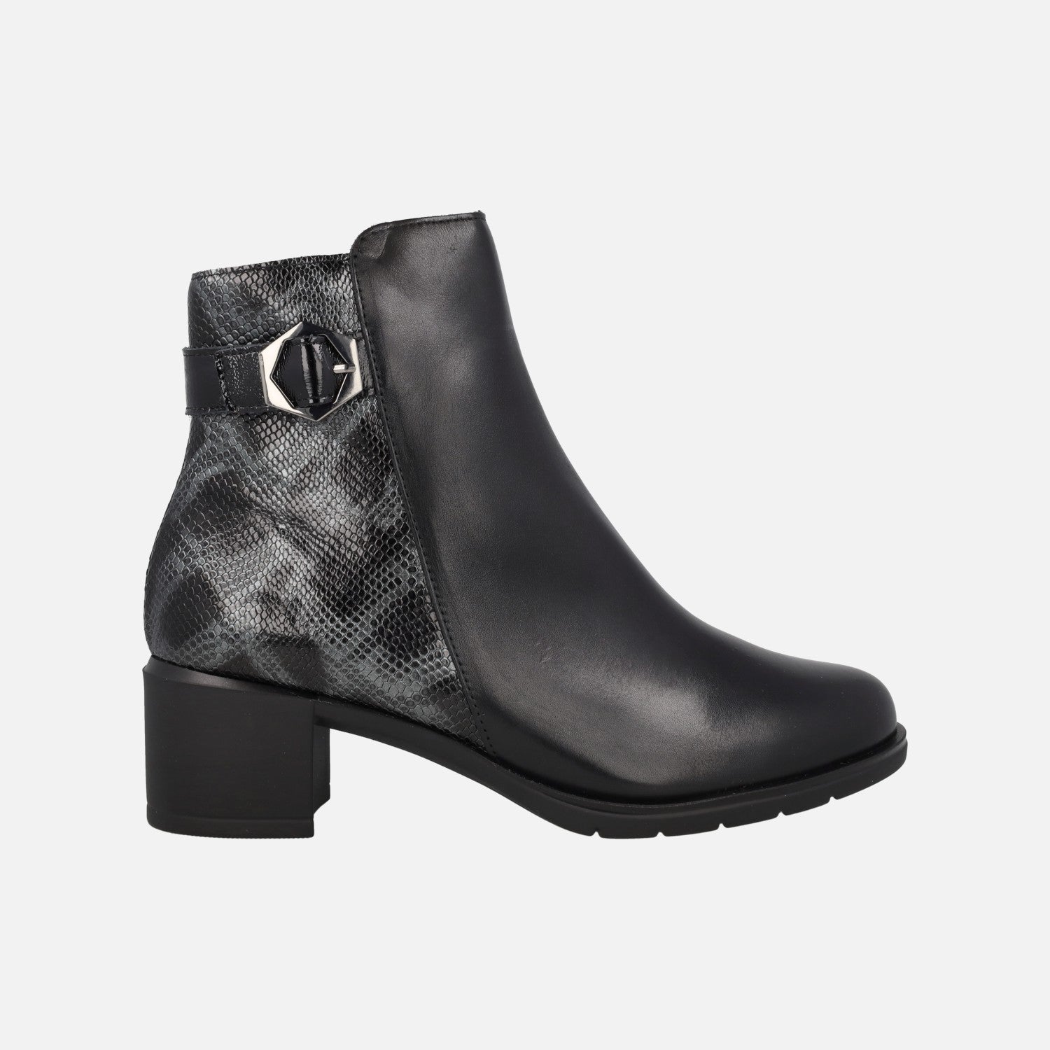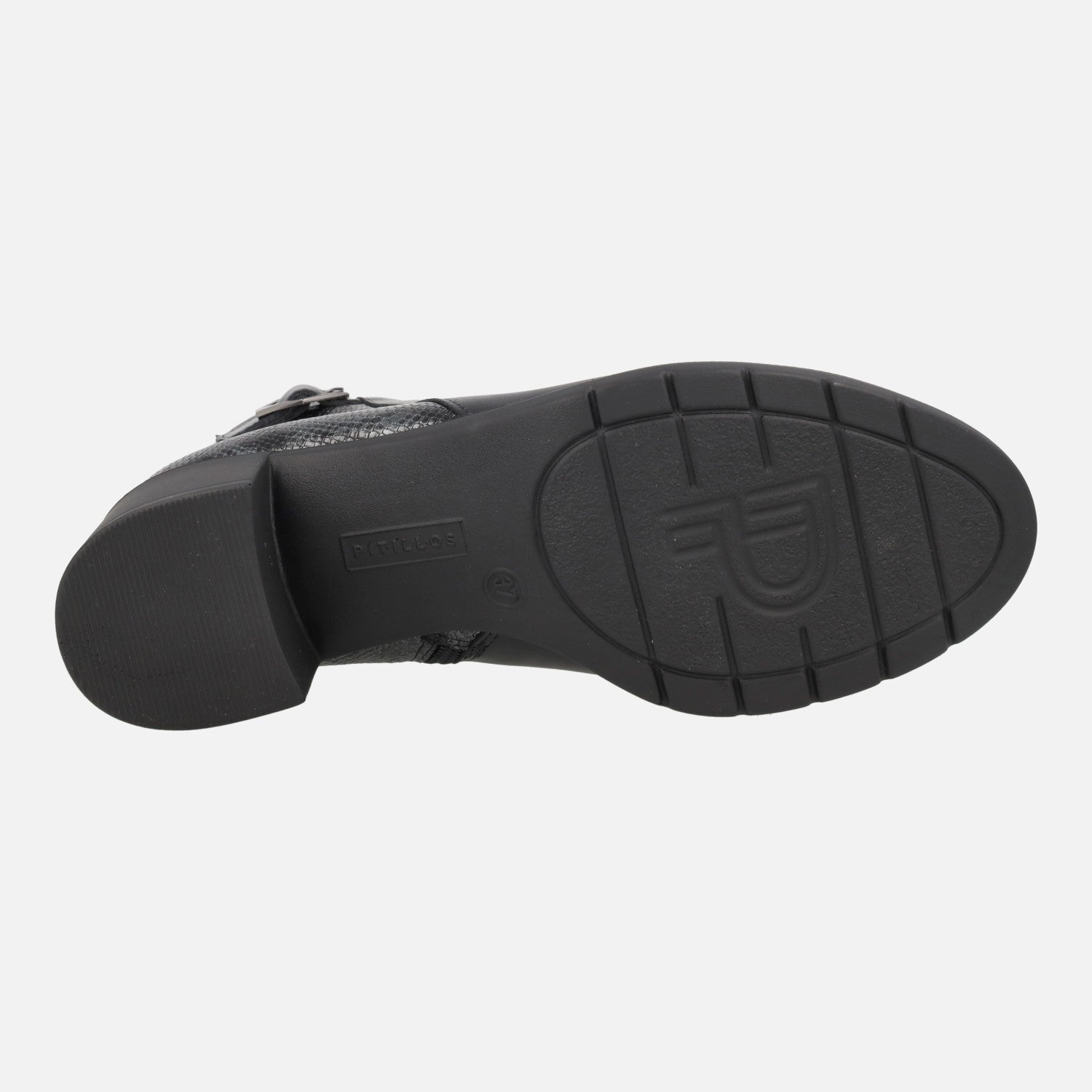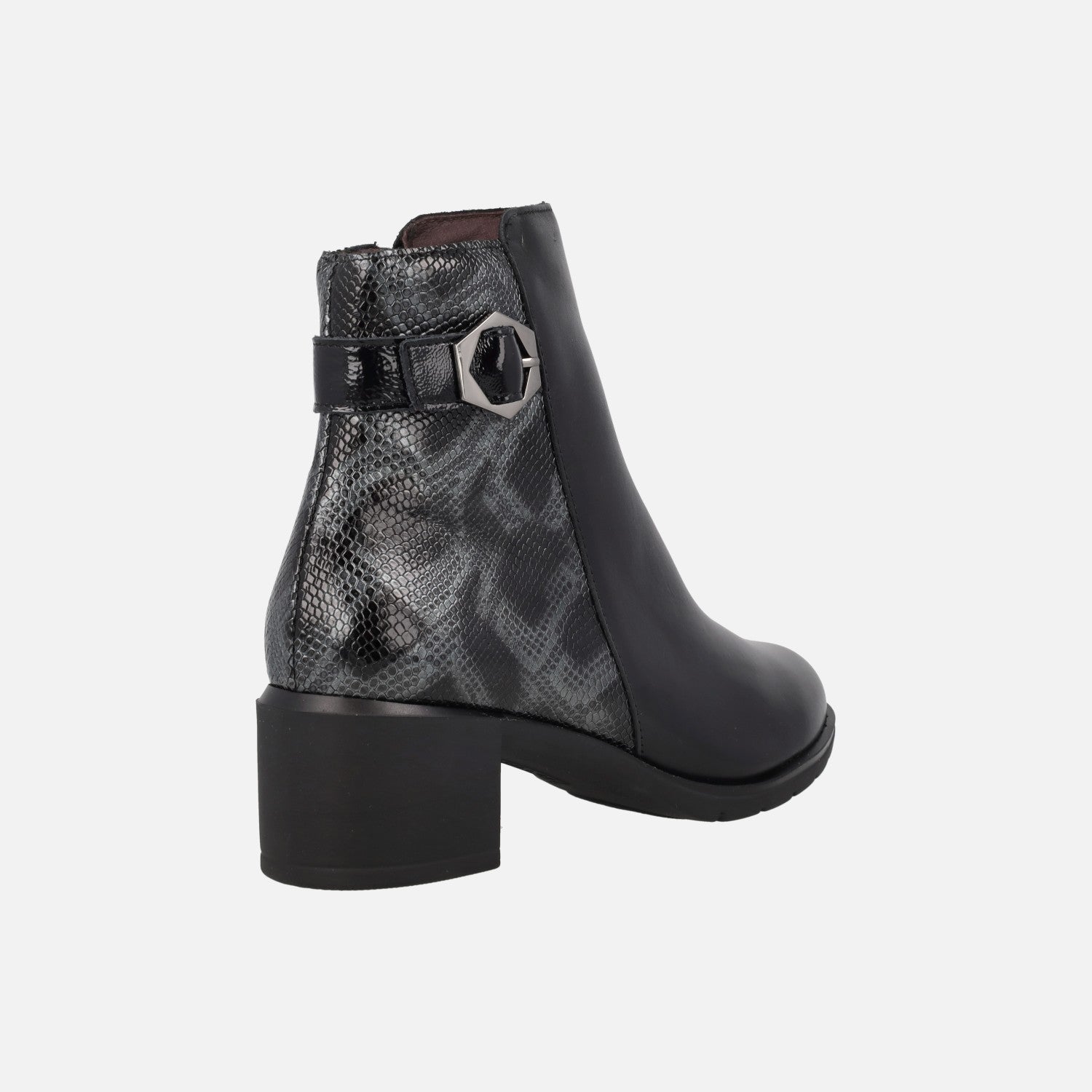 Botines para mujer de la marca Pitillos, modelo 10742 Negro. Botines elaborados en piel negra combinada con print serpiente negro y gris en la parte de atrás. Adorno de hebilla. Cierre de cremallera en el lado interior.  Plantillas extraíbles. Interiores en tejido. Piso sintético con tacones de 5 cm de altura. Caña de 13 cm.