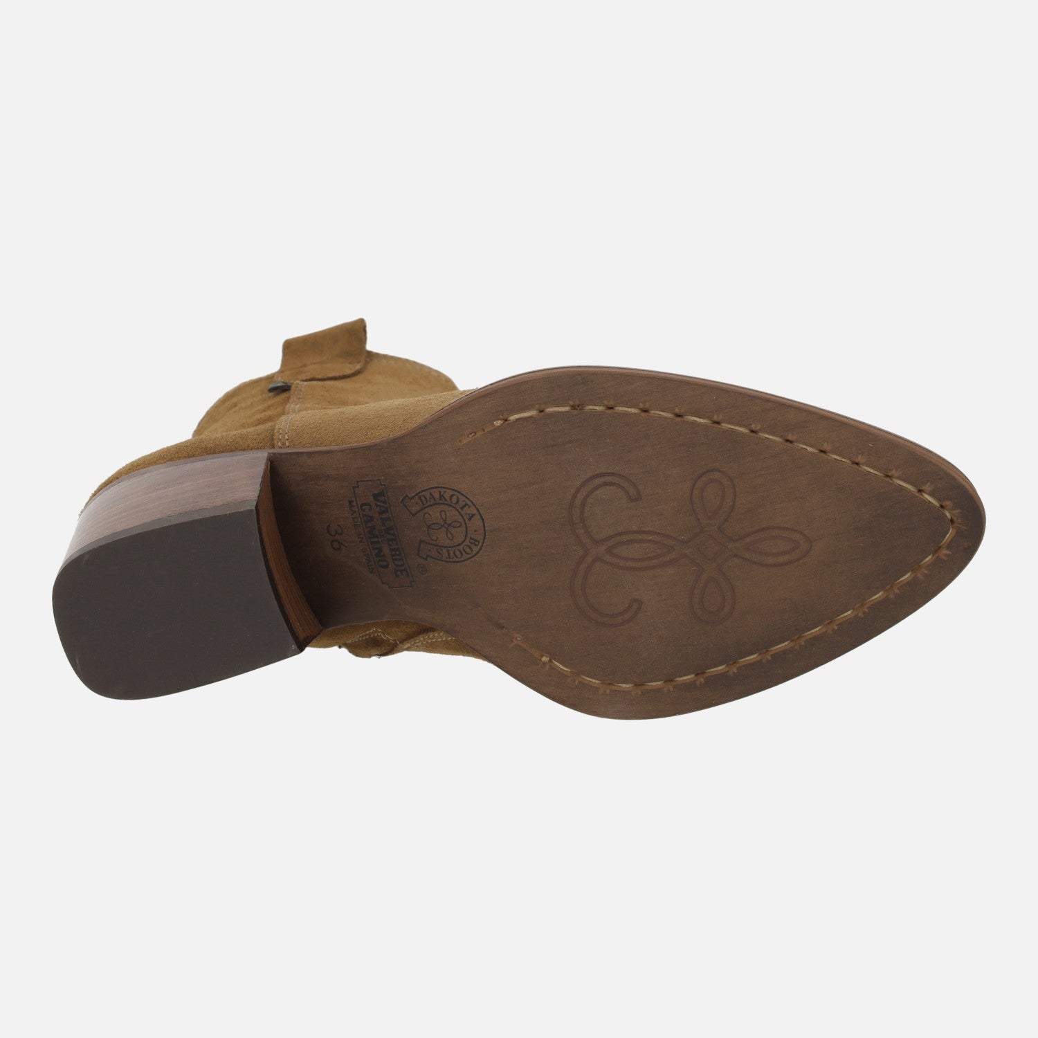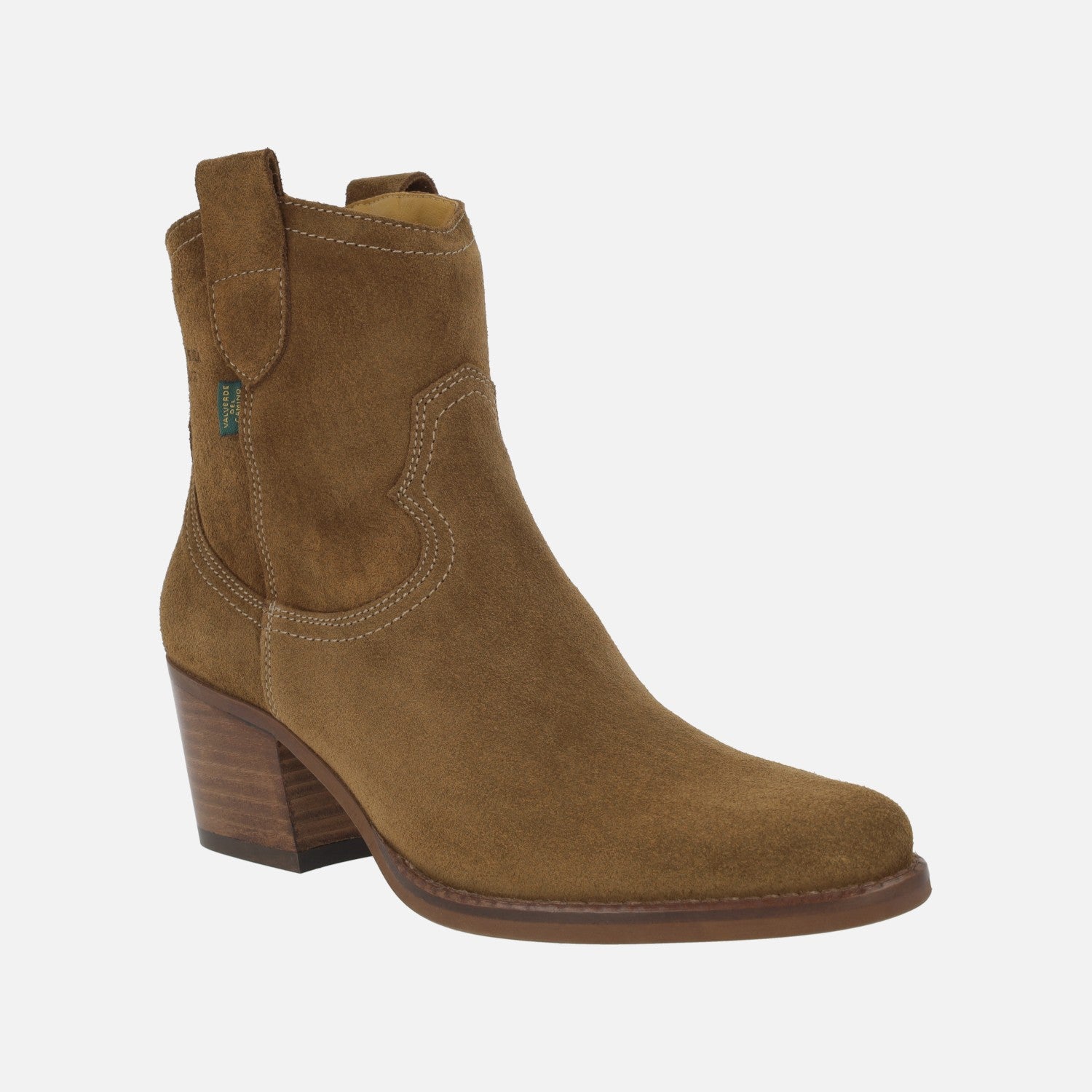 Botines cowboy de la marca española Dakota Boots modelo DKT98 Oil capuccino. Botines elaborados en serraje, con cierre de cremallera sesgada en el lado interior. Tiradores laterales. Interior mixto en piel y otros materiales. Caña de 15 cm de altura. Tacones de 6 cm. Dakota Boots, Valverde del camino, Spain.