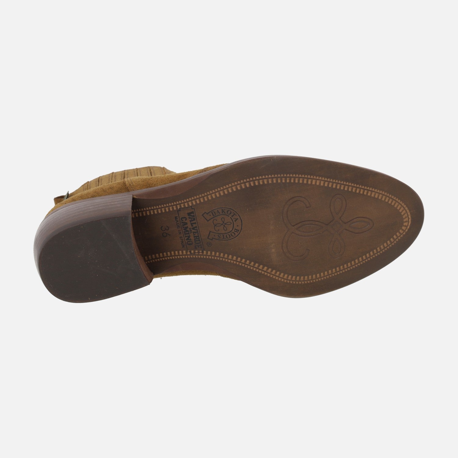Botines de serraje estilo chelsea de la marca española Dakota Boots modelo DKT73 Oil capuccino. Botines con elásticos laterales y detalle de tirador trasero, sin cremallera. Elaborados en piel serraje marrón. Caña de 12 cm. Tacones de 5 cm. Interior mixto en piel y otros materiales. Dakota Boots, Valverde del camino, Spain.