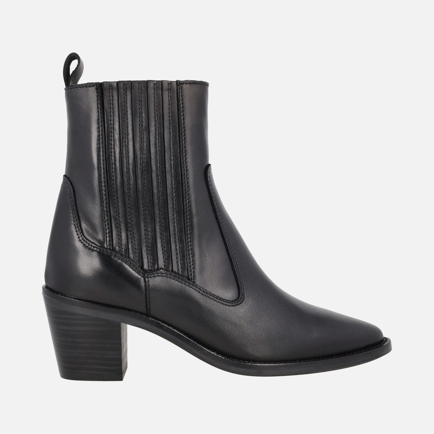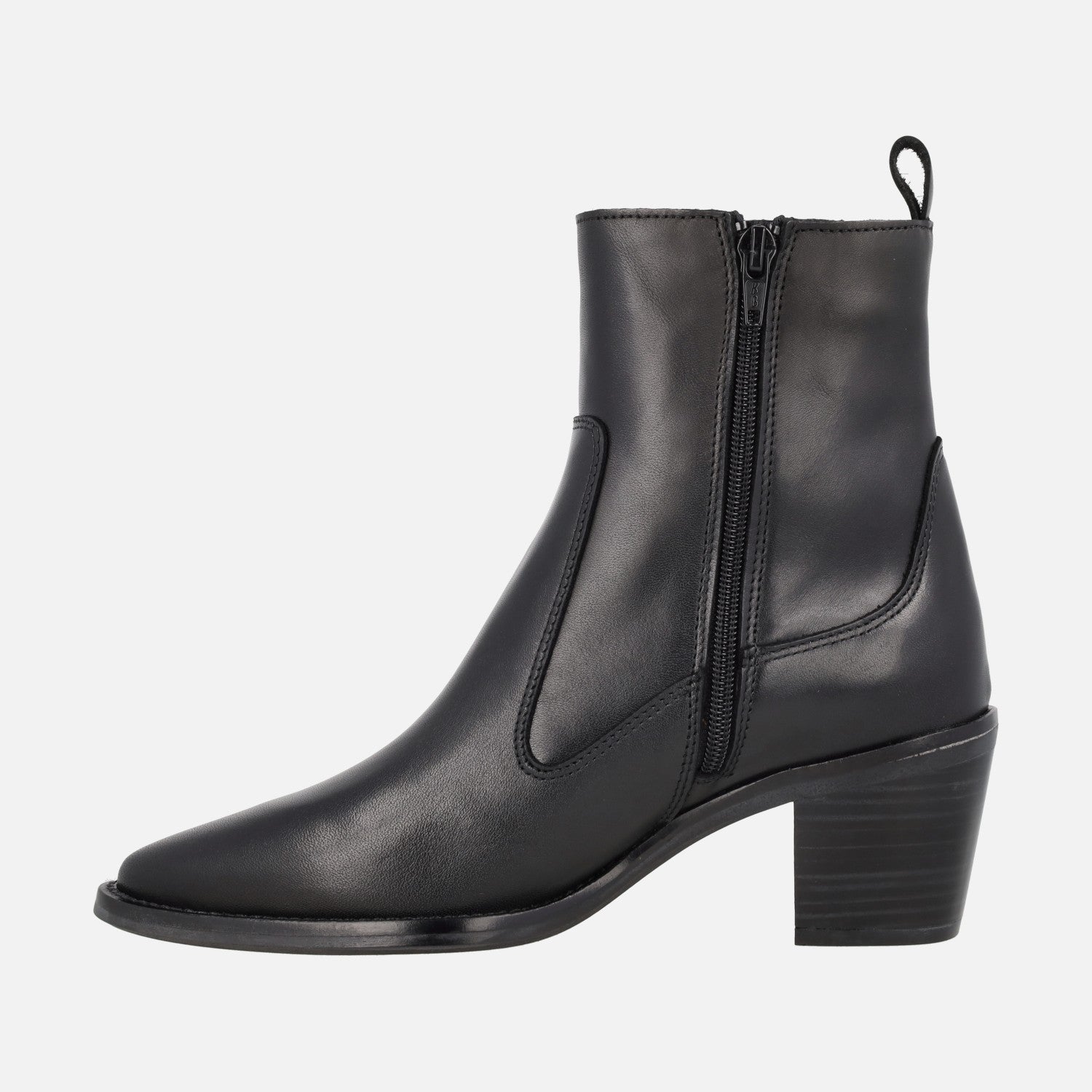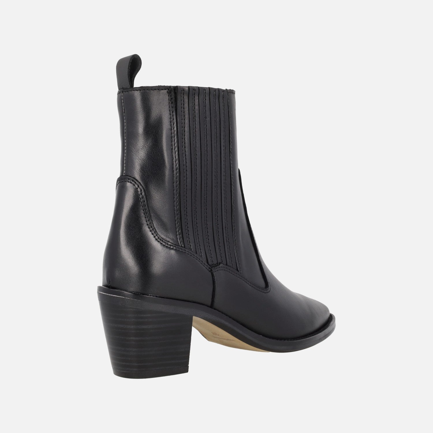 Botines de tacón de la marca Alpe modelo 2581 Nevada, en Becerro Negro. Botines de horma afilada e inspiración cowboy, con elásticos en el lateral exterior y cierre de cremallera en el lado interior. Detalle de tirador trasero. Botines de piel negra con interior textil efecto piel. Piso sintético con tacones de 6 cm de altura. Caña de 15 cm. Made in Spain.
