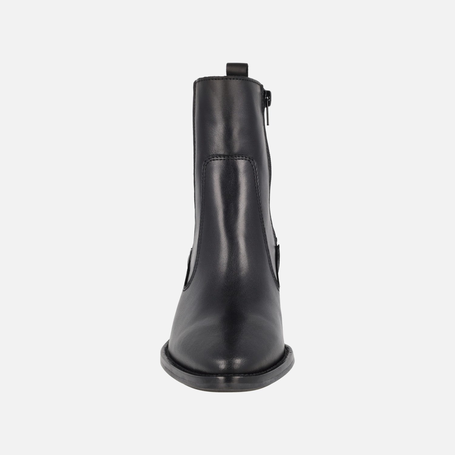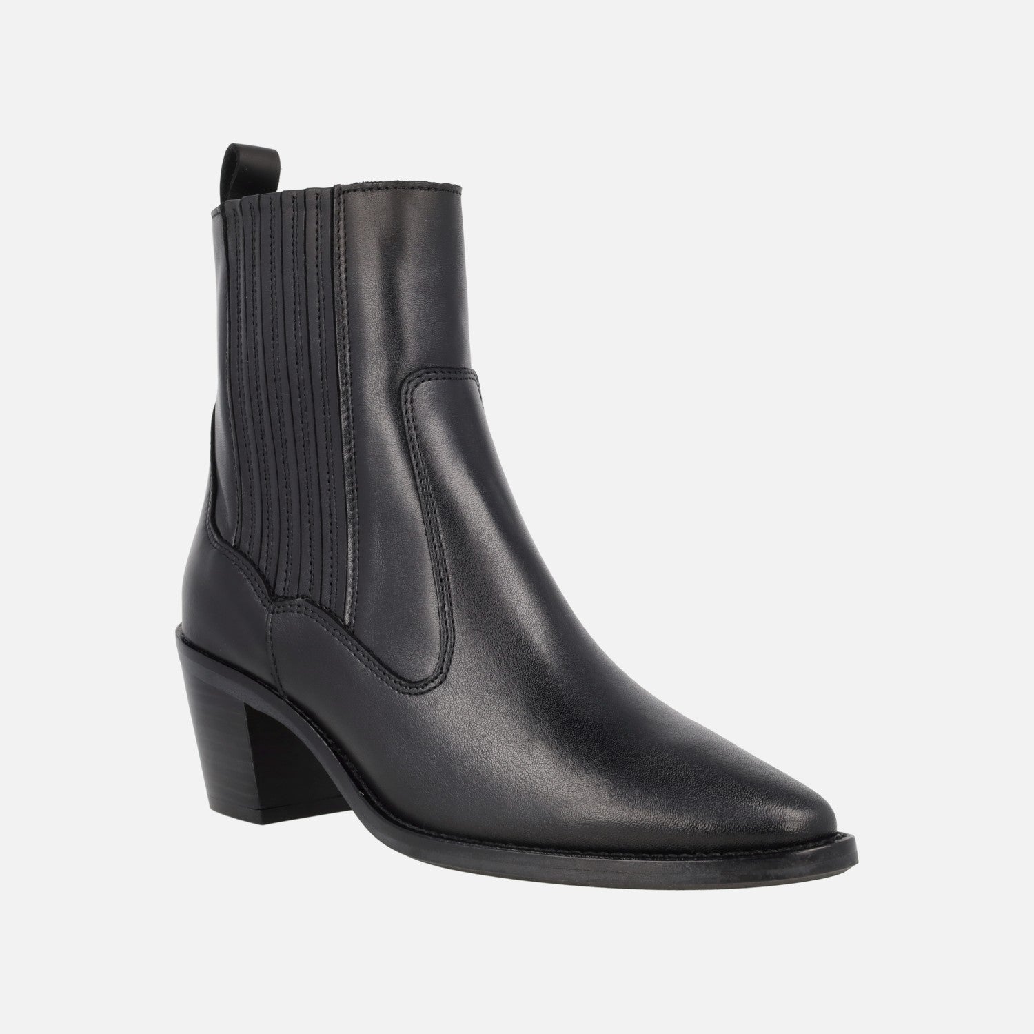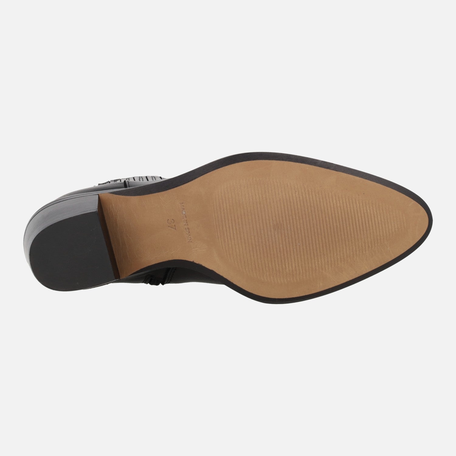 Botines de tacón de la marca Alpe modelo 2581 Nevada, en Becerro Negro. Botines de horma afilada e inspiración cowboy, con elásticos en el lateral exterior y cierre de cremallera en el lado interior. Detalle de tirador trasero. Botines de piel negra con interior textil efecto piel. Piso sintético con tacones de 6 cm de altura. Caña de 15 cm. Made in Spain.