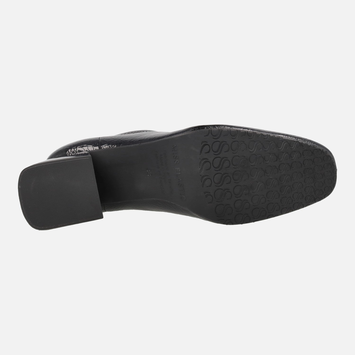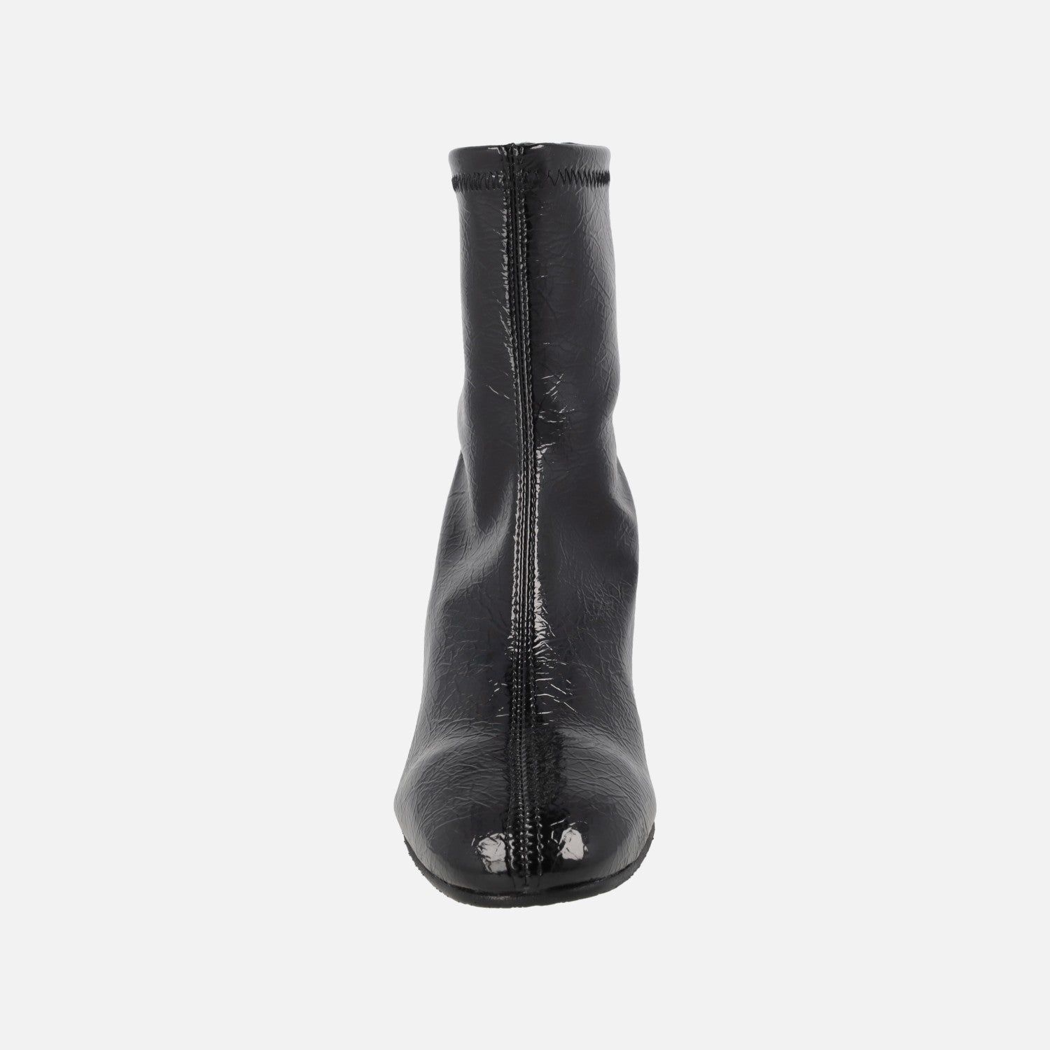 Botines para mujer de la marca Miss Elastic, modelo 078662-56. Botines sin cremallera, estilo calcetín, disponibles en color negro, y elaborados en tejido y materiales sintéticos efecto charol cuarteado. Interior textil. Piso sintético. Tacones de 5 cm de altura. Caña de 17 cm de altura.