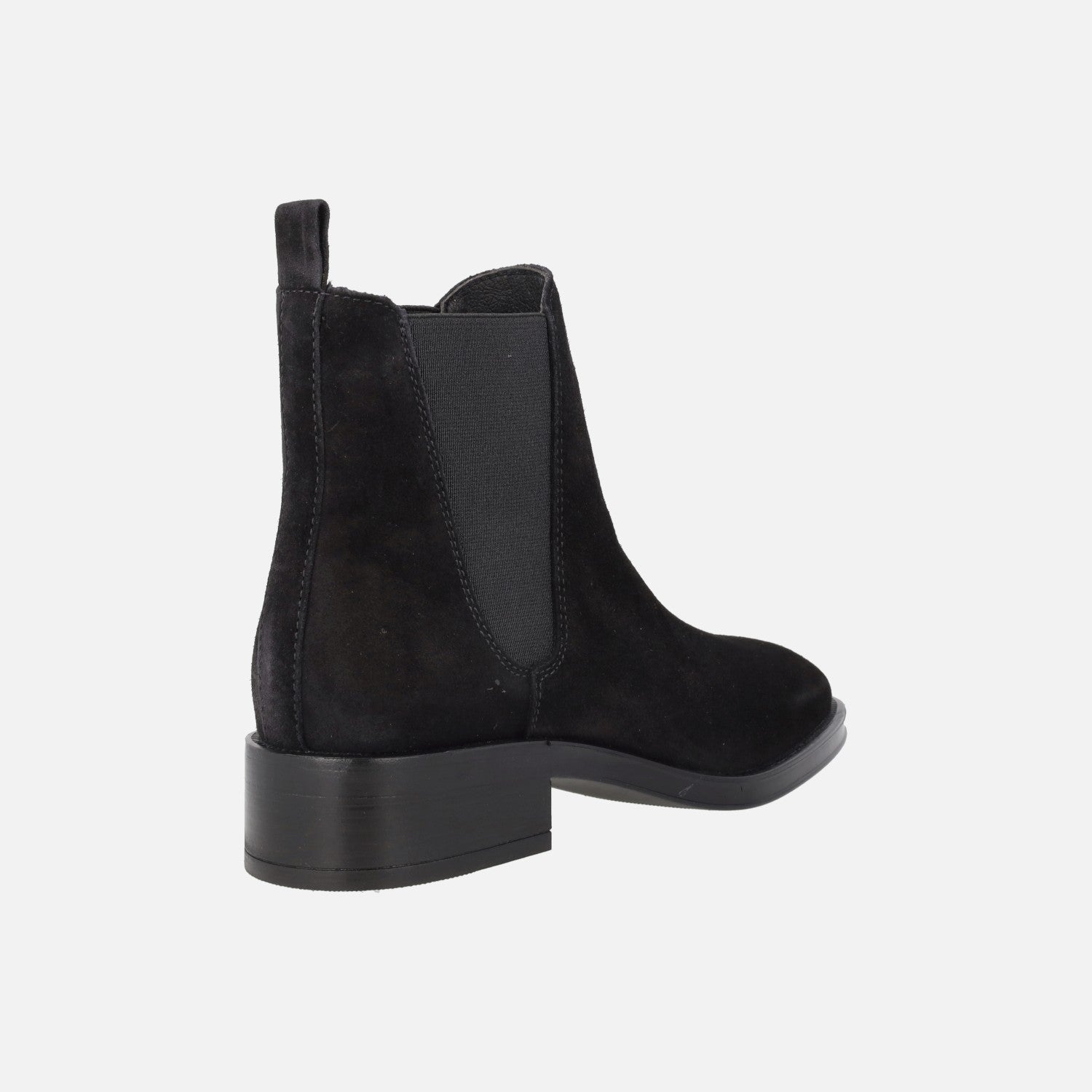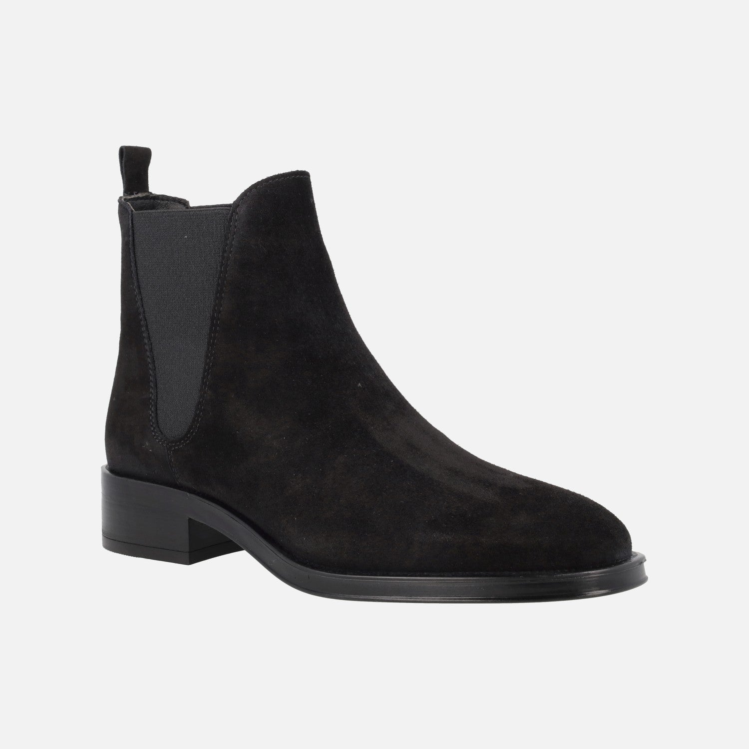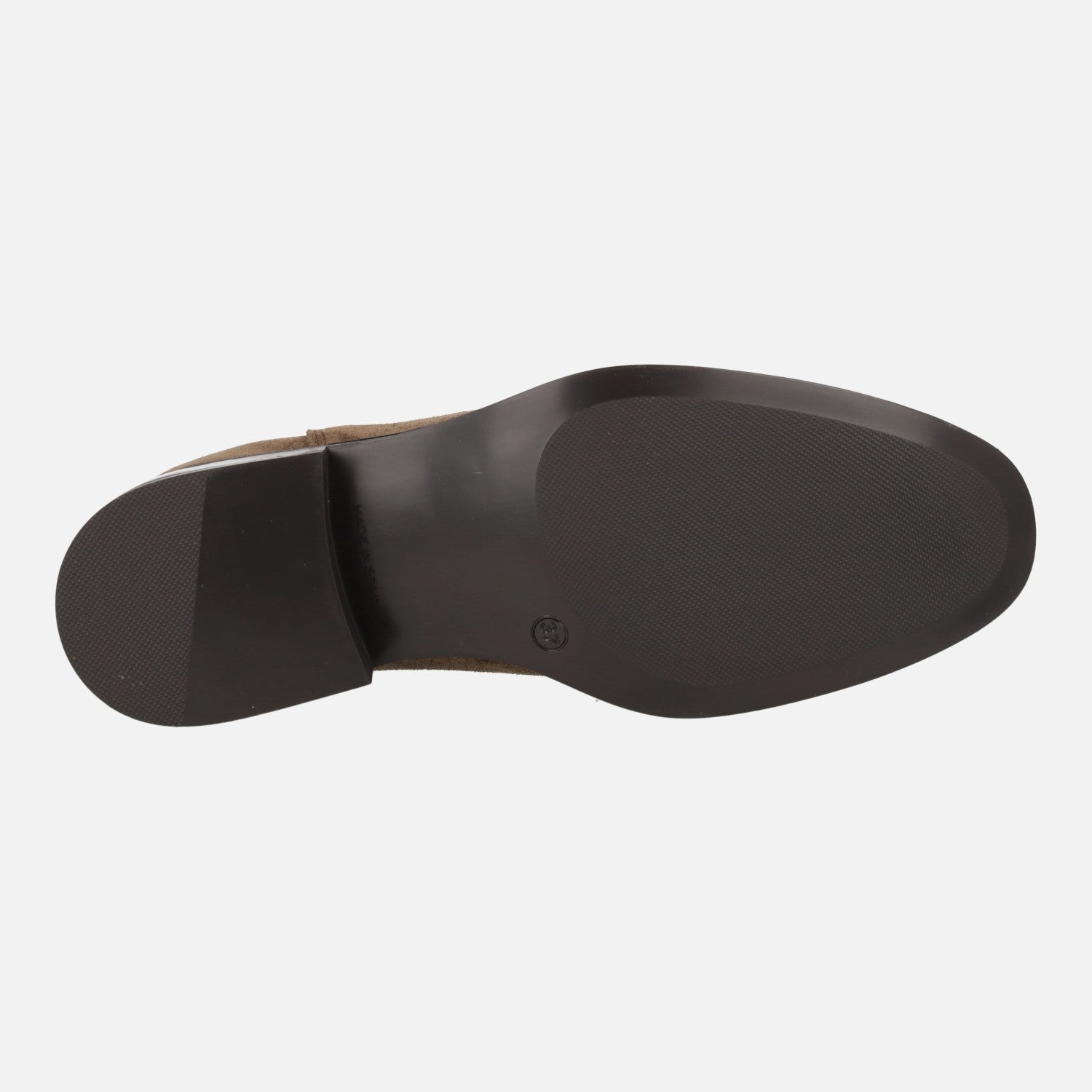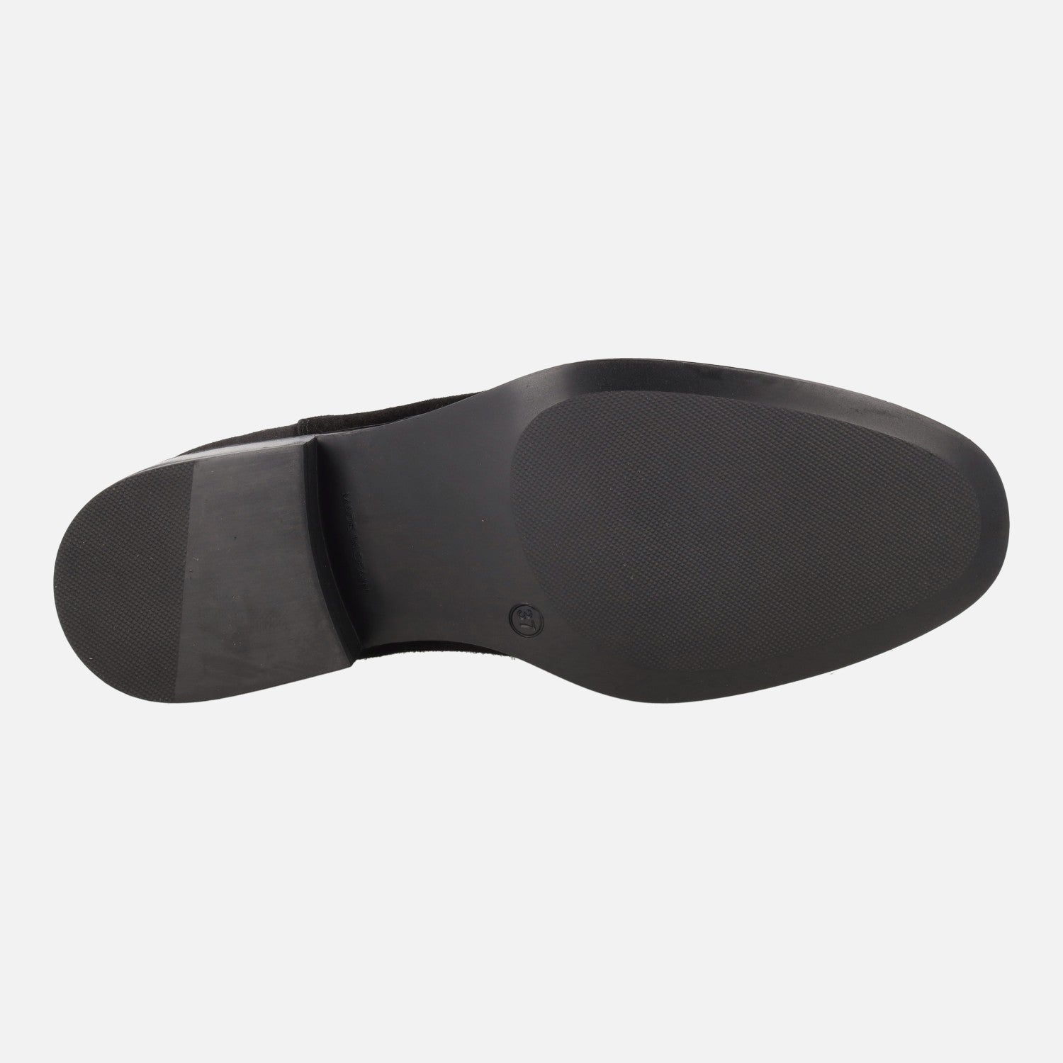 Botines Alpe Couture 2349 en baby silk negro, mustang (marrón oscuro) e imán (color entre marrón y taupe). Elegantes botines elaborados en piel serraje con elásticos laterales, detalle de tirador trasero. Interior textil, con planta textura piel. Piso sintético con tacones de 3,5 cm de altura. Caña de 12 cm. Made in Spain.