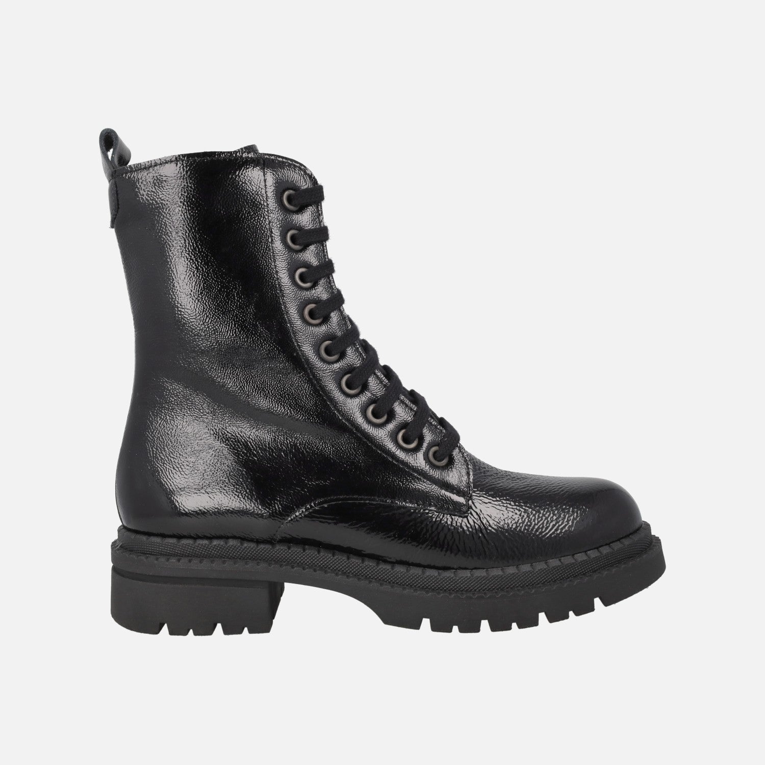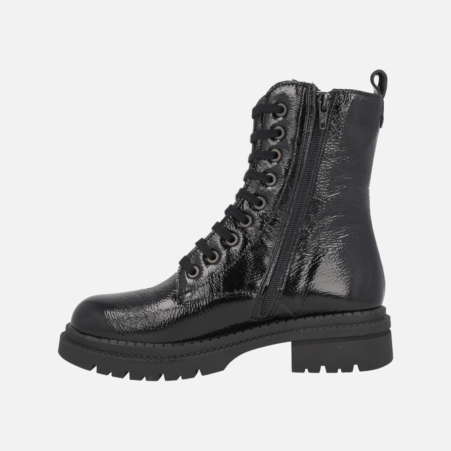 Botines negros de charol para mujer de la marca Pitillos, modelo 10794 Negro. Botines elaborados en piel charol, con cordones en la parte delantera y cierre de cremallera en el lateral interior. Forro y planta en tejido, con plantillas extraíbles. Caña de 17 cm de altura aproximadamente. Tirador trasero. Piso sintético estilo track con 4,5 cm de altura trasera y 3 cm de plataofrma.