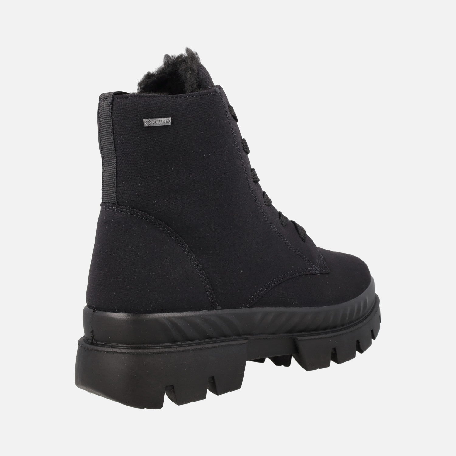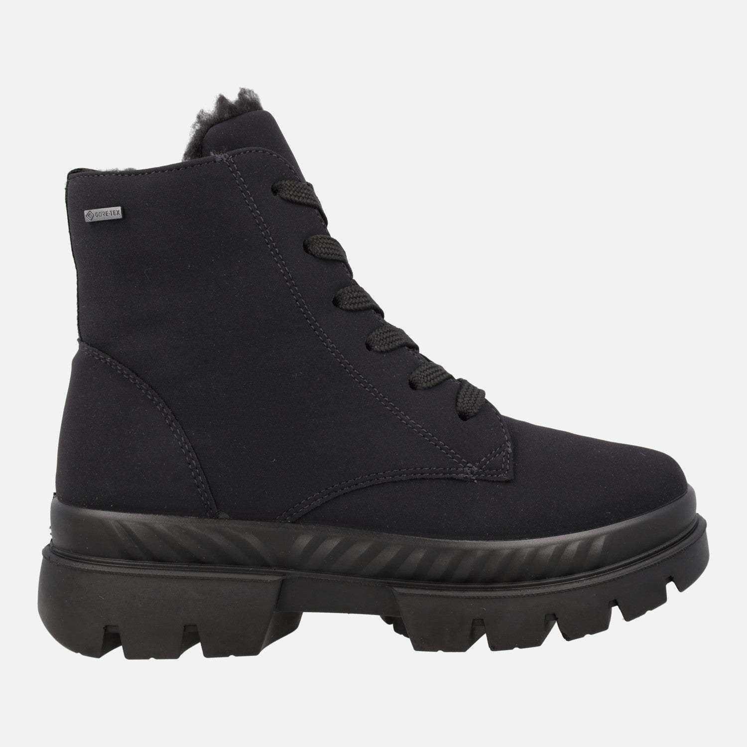 Botines negros para mujer de la marca Ara modelo 1214116-11 Schwarz. Botines negros elaborados en tejido, con cierre de cordones y además cremallera lateral. Interior textil en tejido similar al borreguillo, con membrana impermeable de Gore tex. Plantillas extraíbles. Piso sintético con una altura de 5,5 cm en la parte trasera (2 cm parte delantera). Caña de 13 cm.